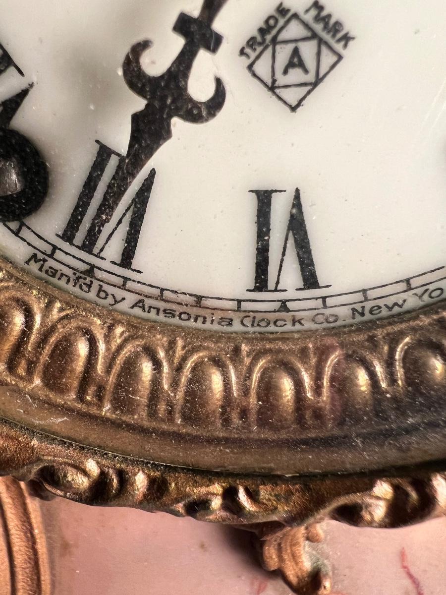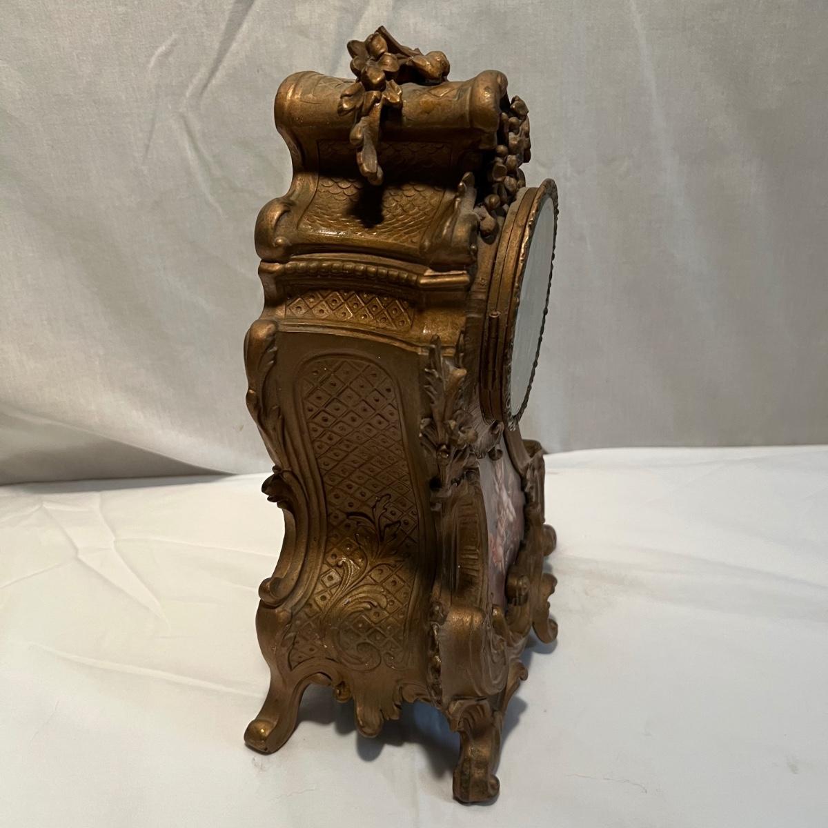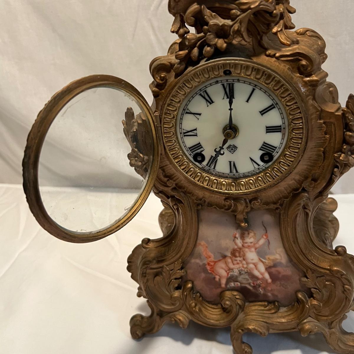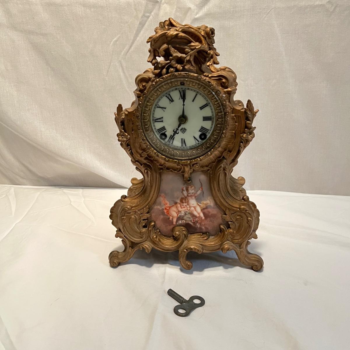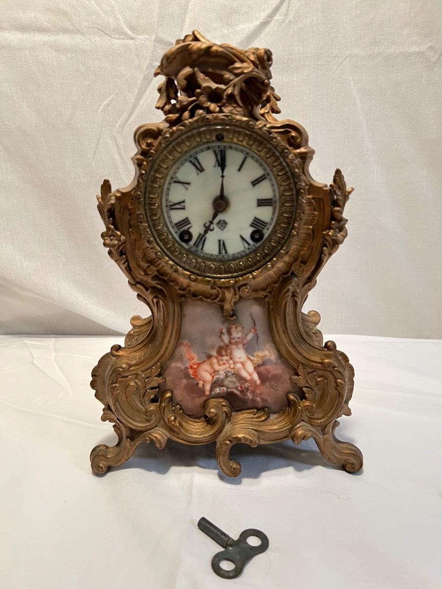 Beautiful Rocco mantle clock with key. Clock was not tested. Appears to be a Gilt cast metal case has French Rococo filigree design with a painted porcelain panel. Clock has a brass, spring driven movement signed "Ansonia Clock Co., New York, USA".
