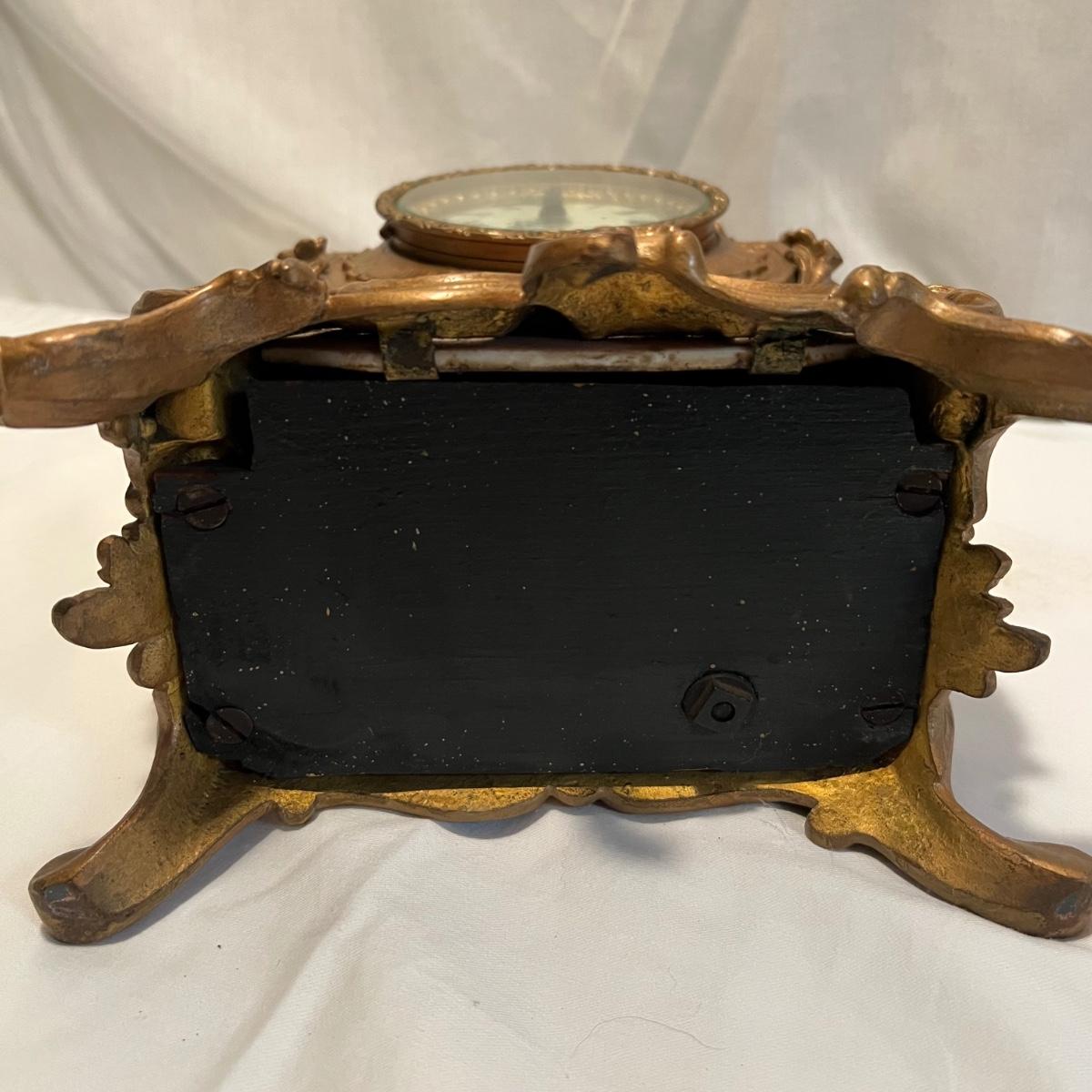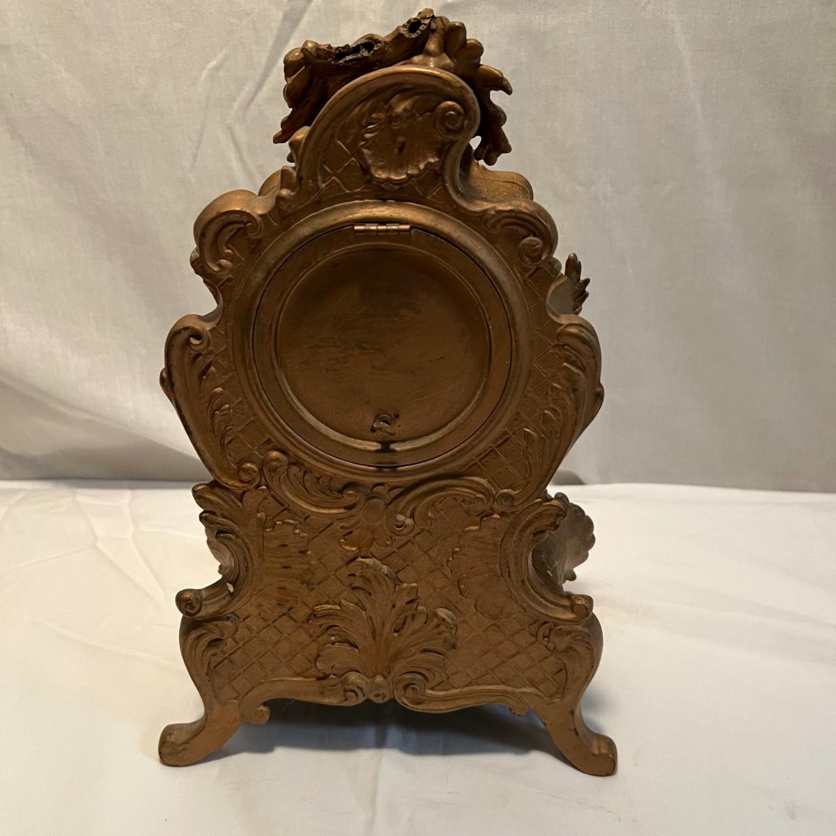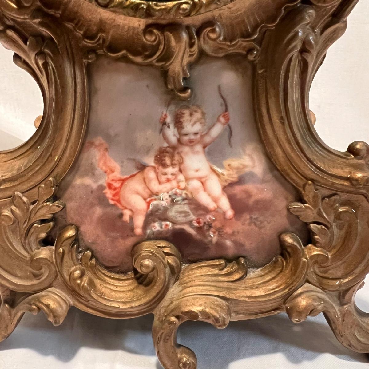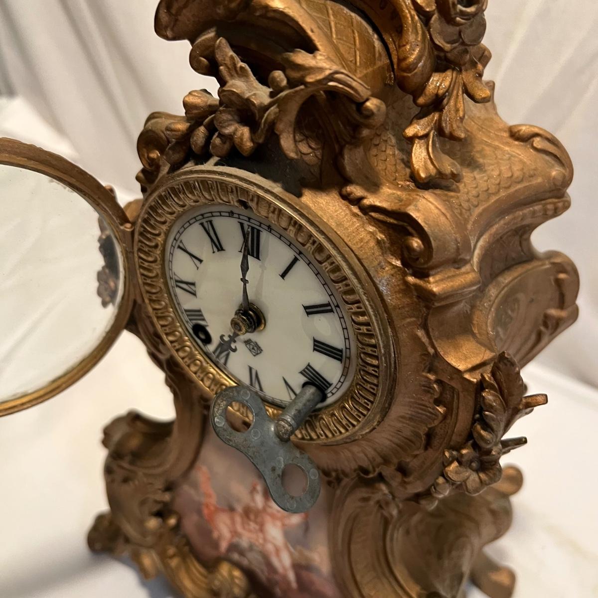 Beautiful Rocco mantle clock with key. Clock was not tested. Appears to be a Gilt cast metal case has French Rococo filigree design with a painted porcelain panel. Clock has a brass, spring driven movement signed "Ansonia Clock Co., New York, USA".