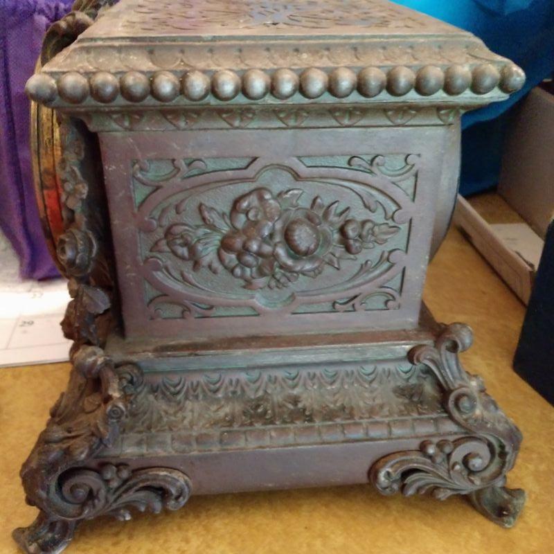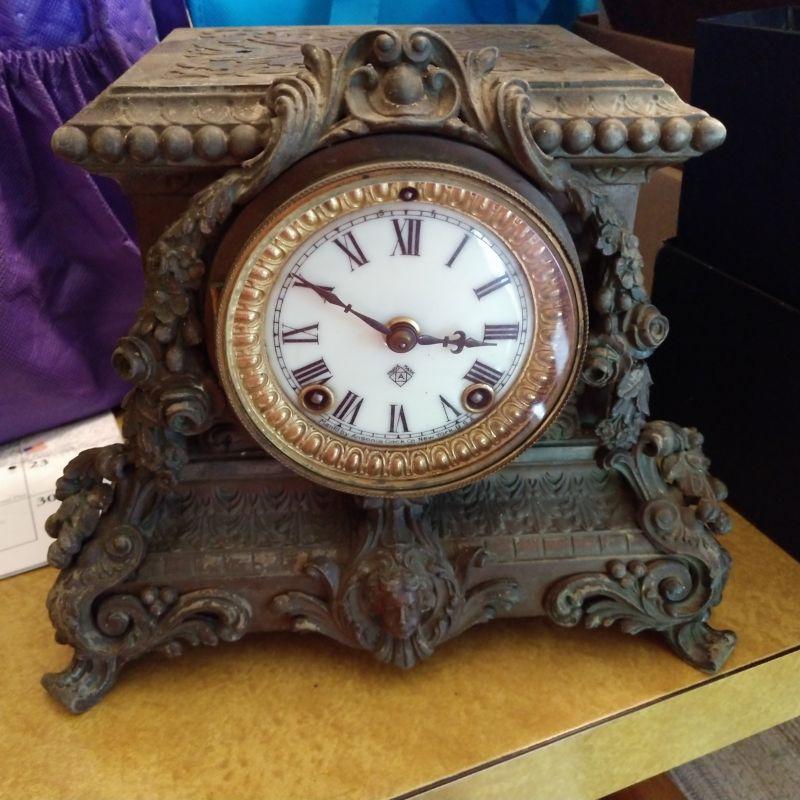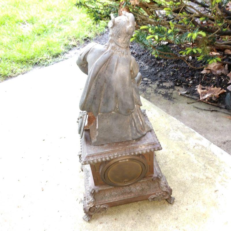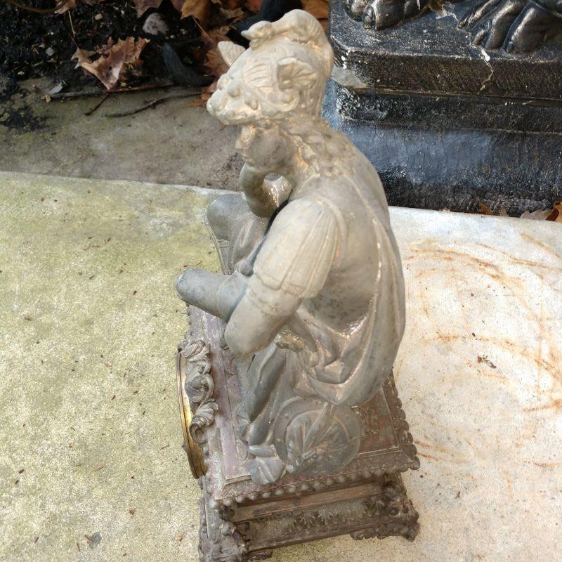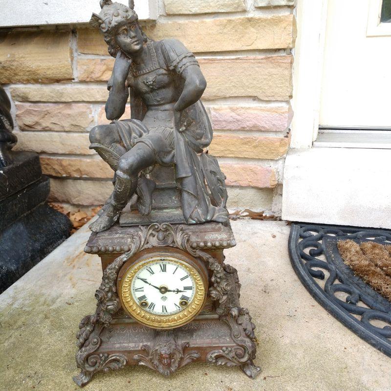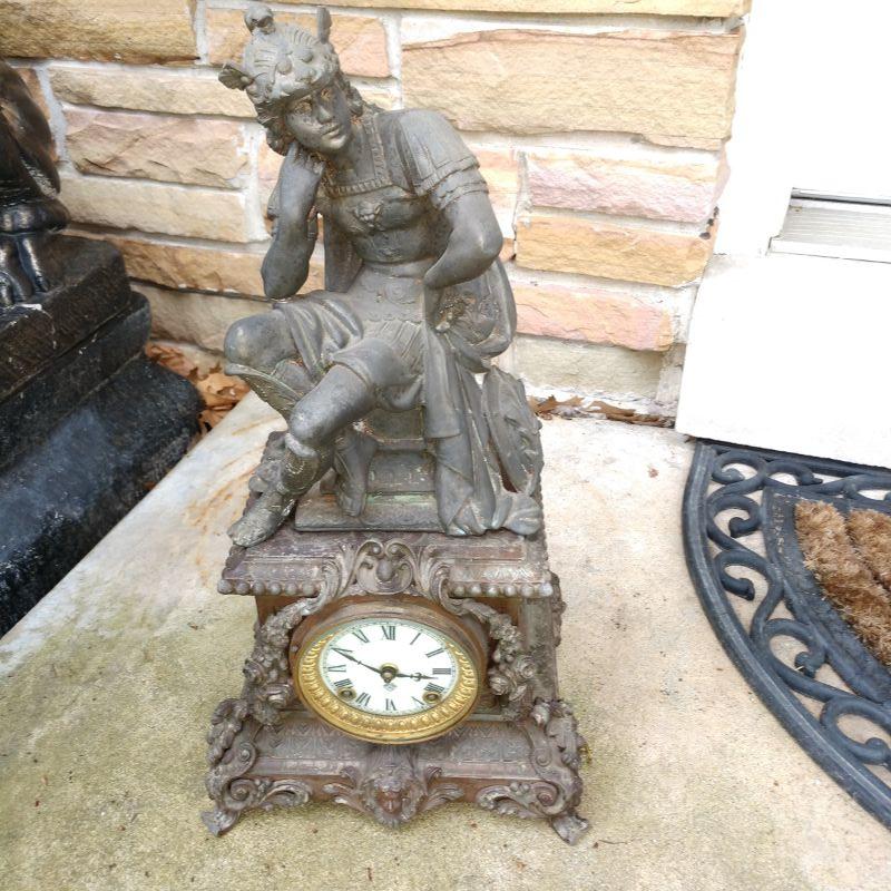 Vintage Ansonia Clock with Pot metal warrior. Has key, needs cleaning. Winds and pendulum swings, hands not moving.