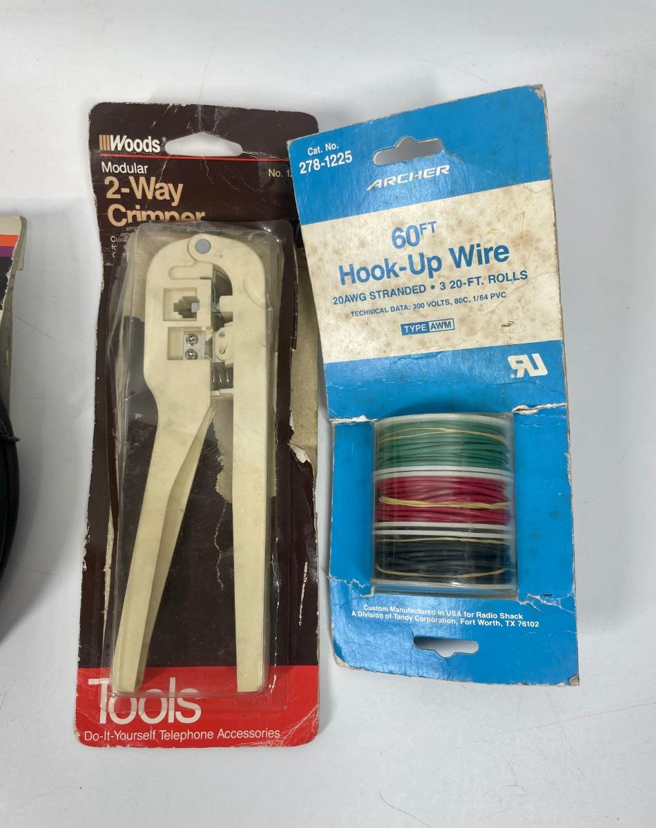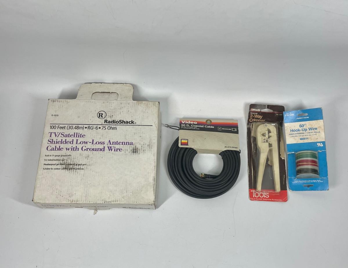 Antenna Cable Wire Lot with Crimping Tool. 2 cable rolls, 100' and 50', 3 spools of hook-up wire and a modular Woods 2-way crimping tool.
