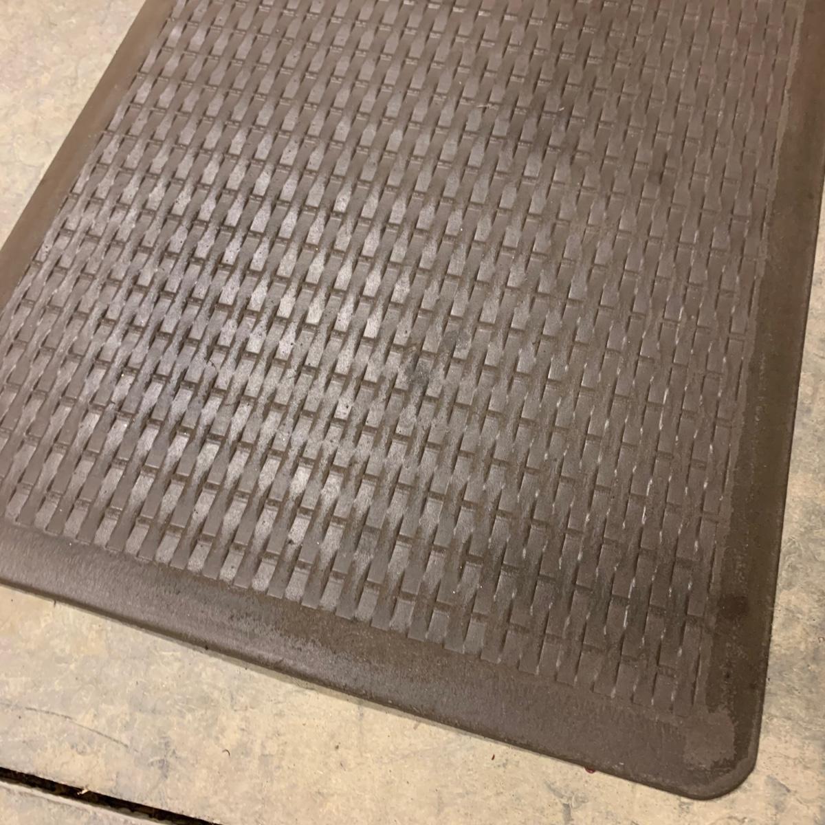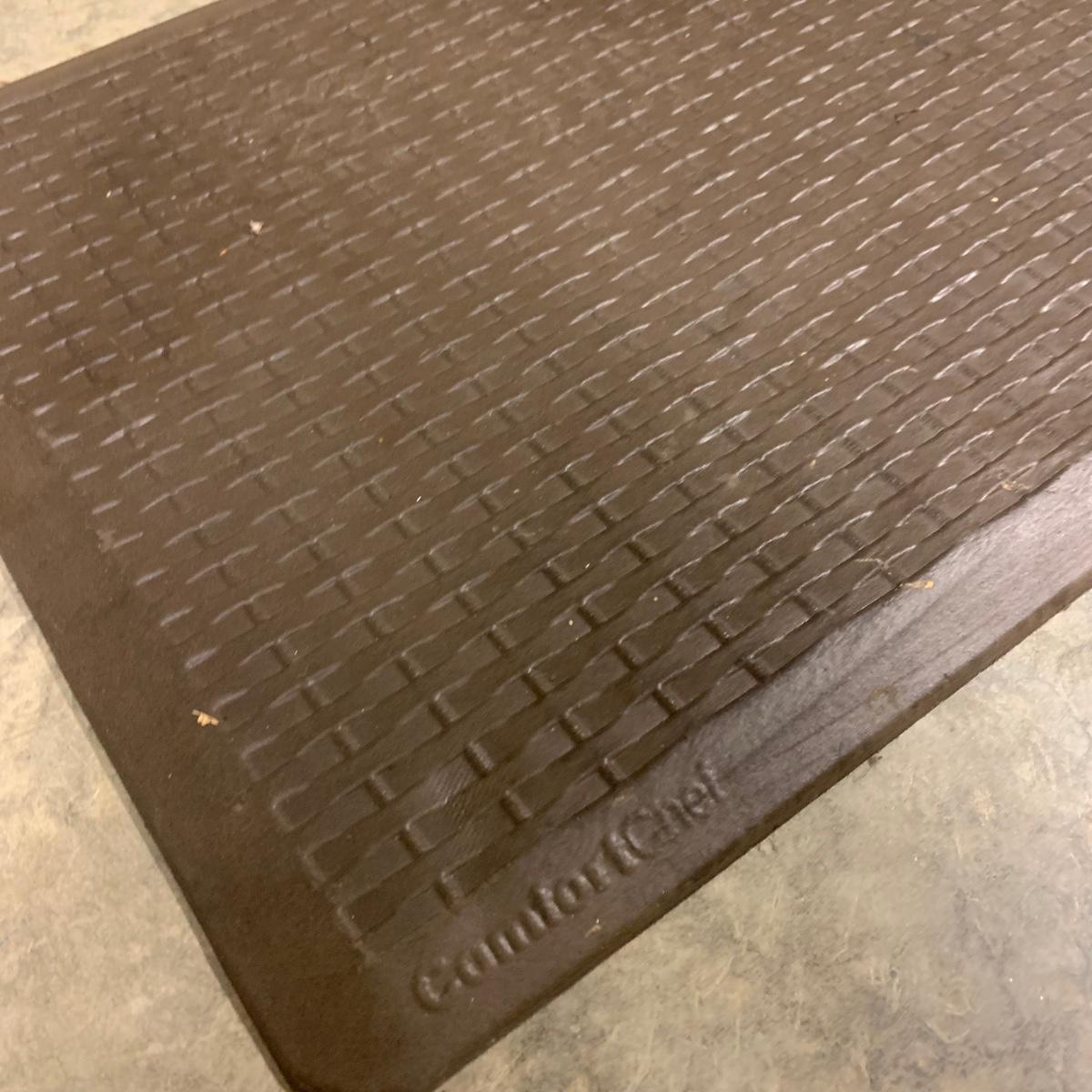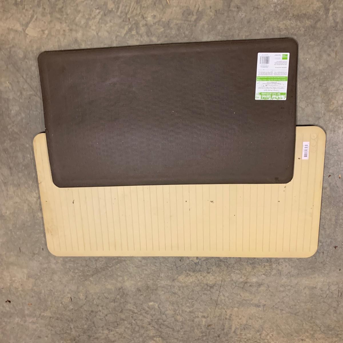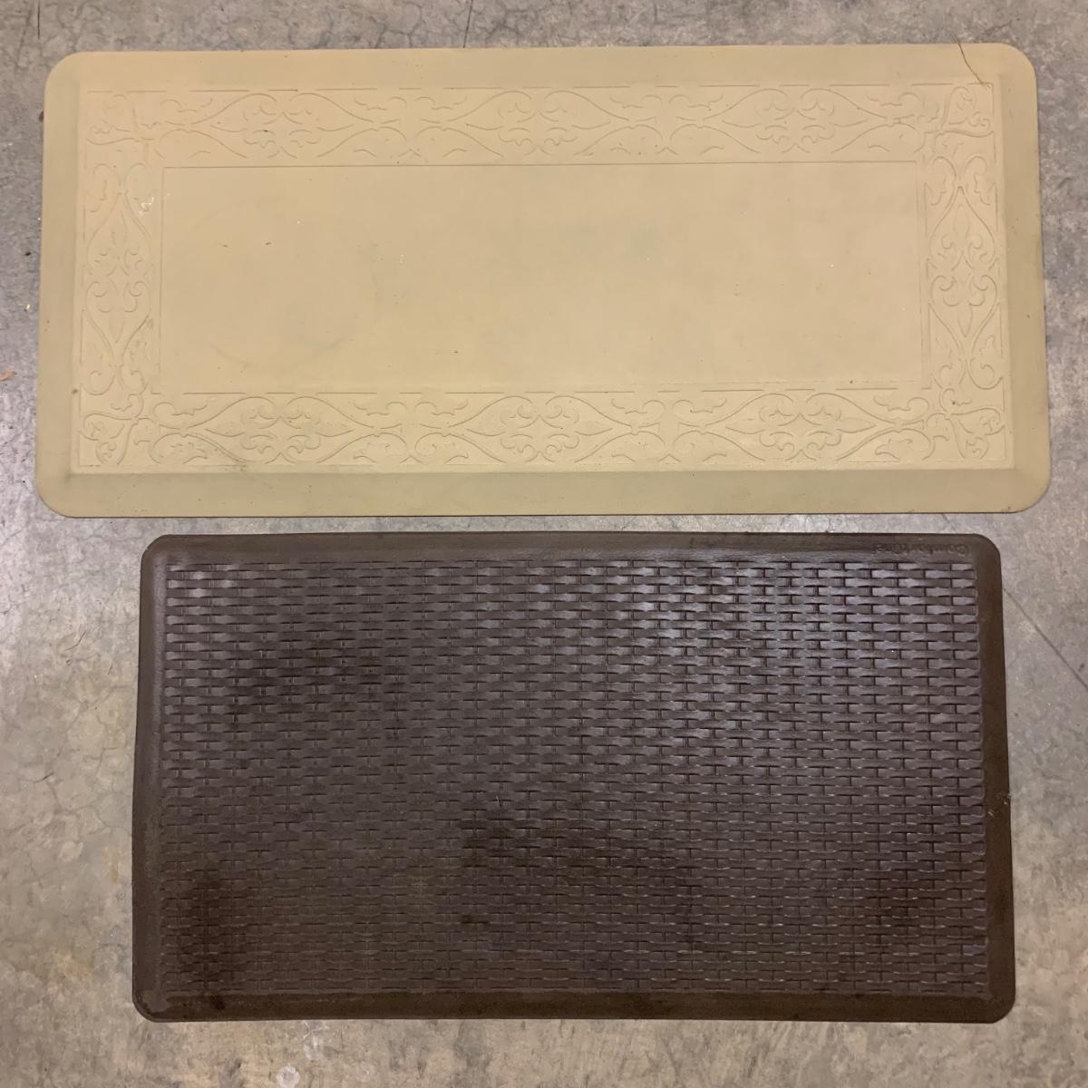 Two anti-fatigue floor mats. The tan colored mat with patterned border measures 42” x 20”. The darker brown mat is Comfort Chef brand. It shows some wear but has plenty of life left.