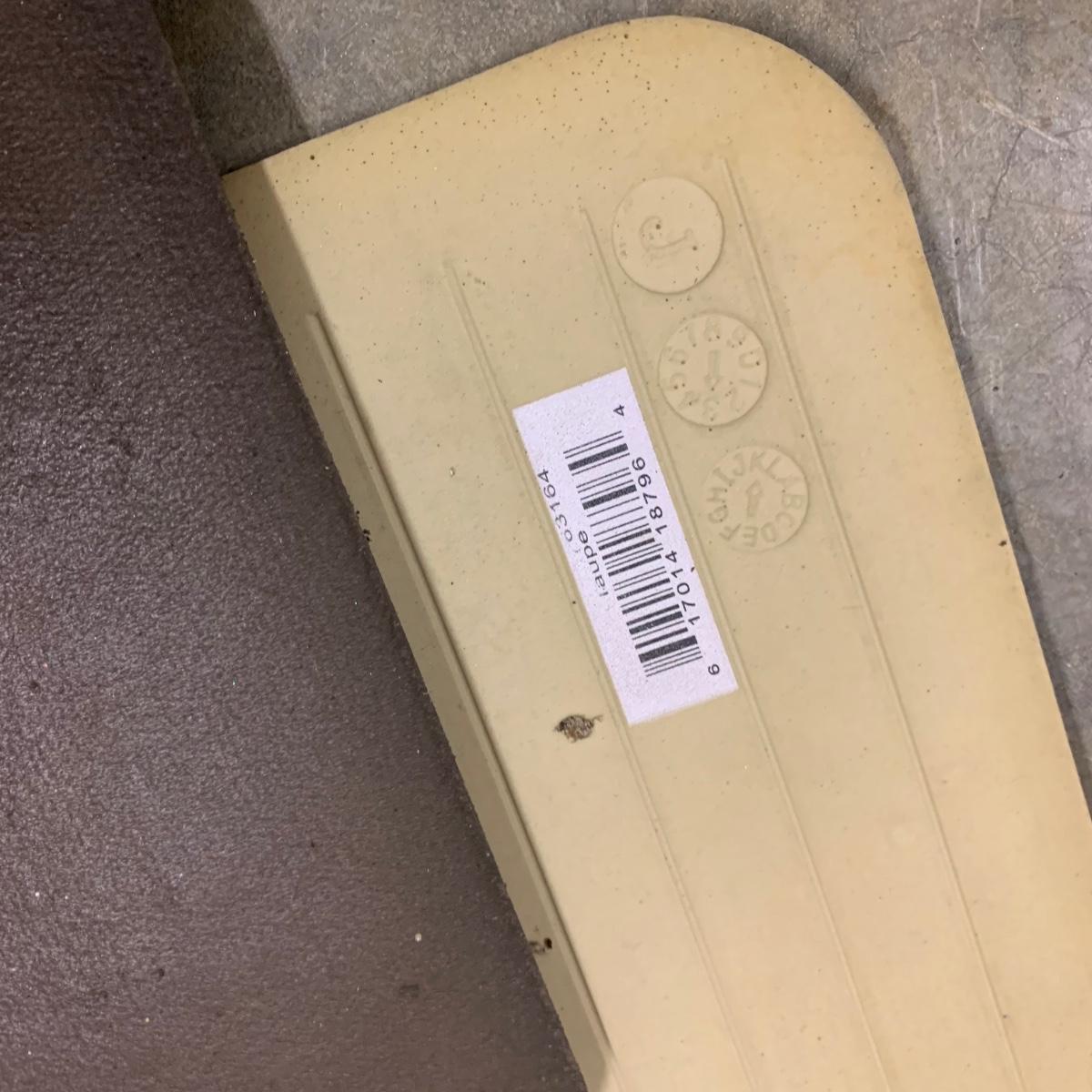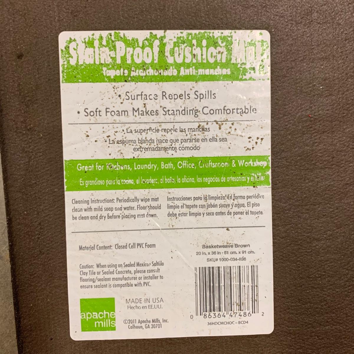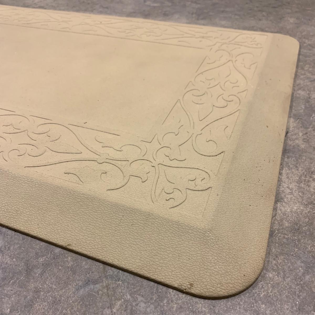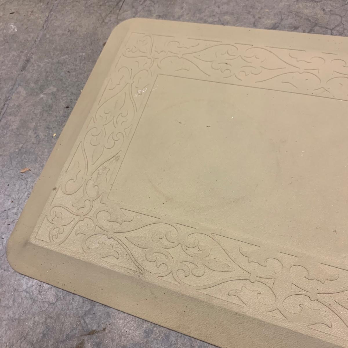 Two anti-fatigue floor mats. The tan colored mat with patterned border measures 42” x 20”. The darker brown mat is Comfort Chef brand. It shows some wear but has plenty of life left.