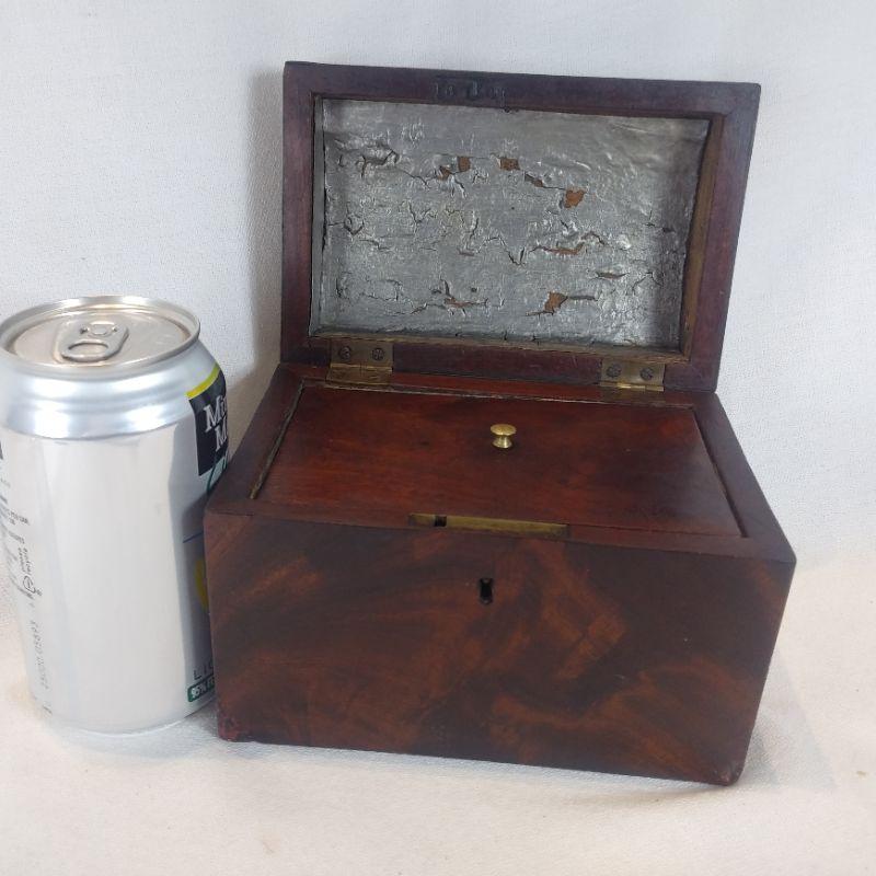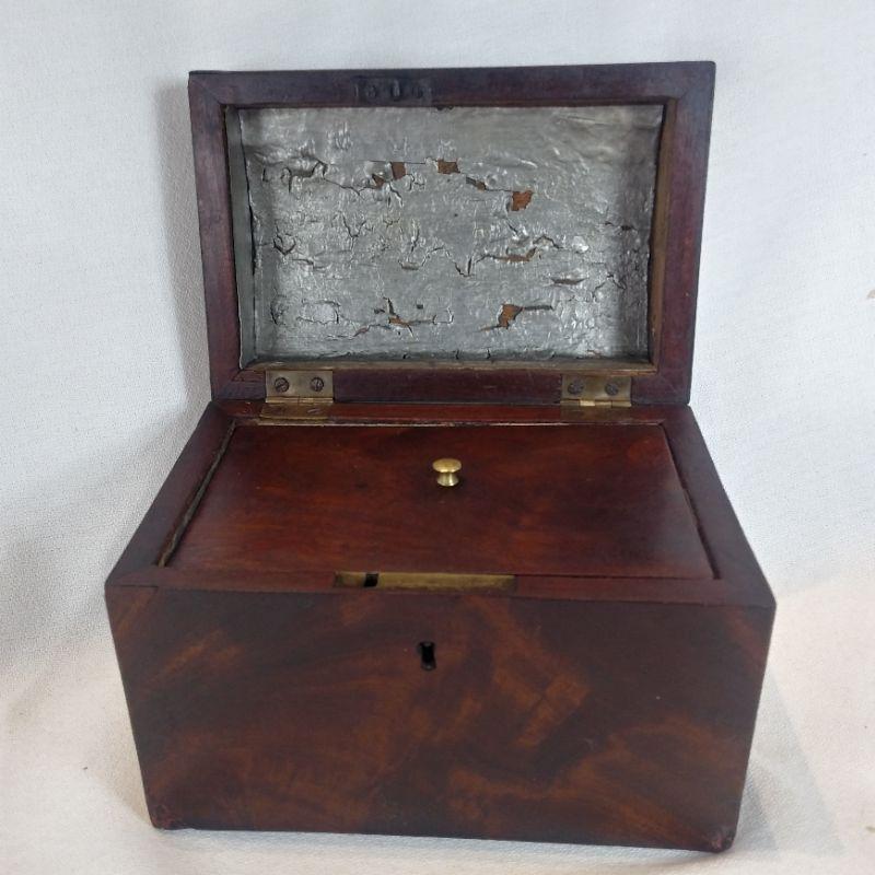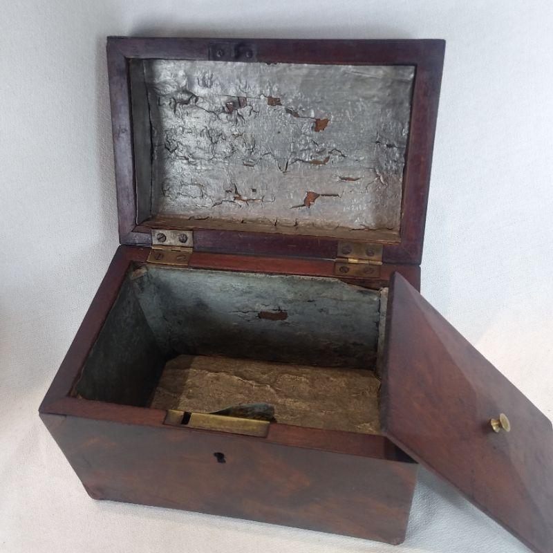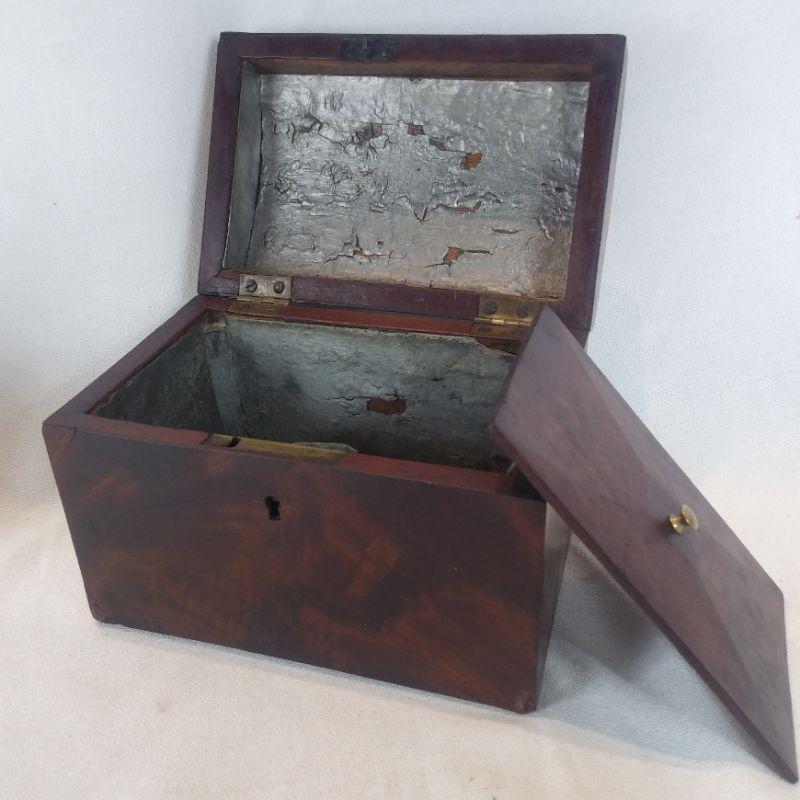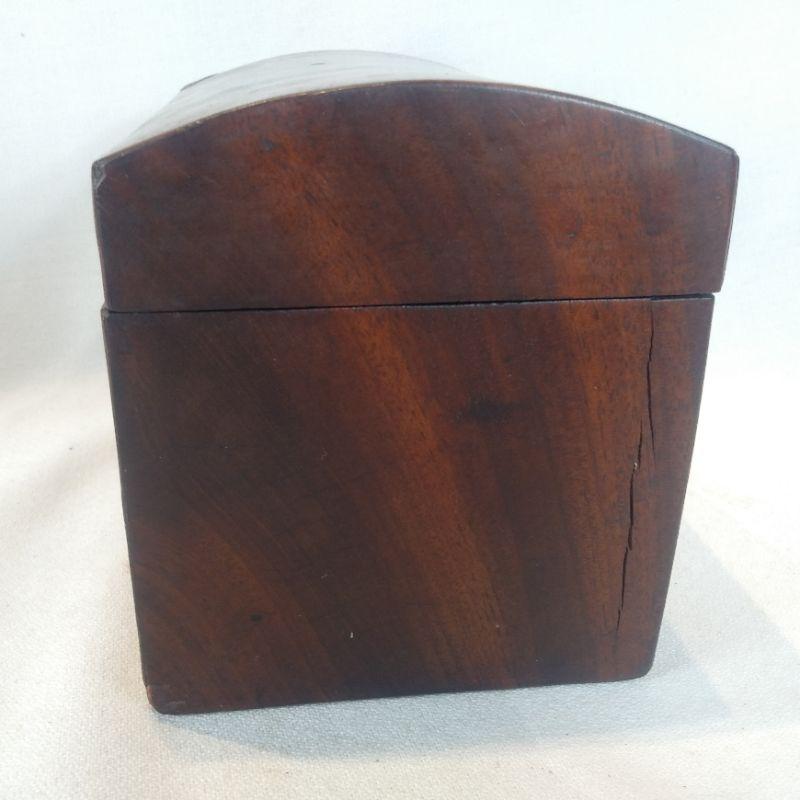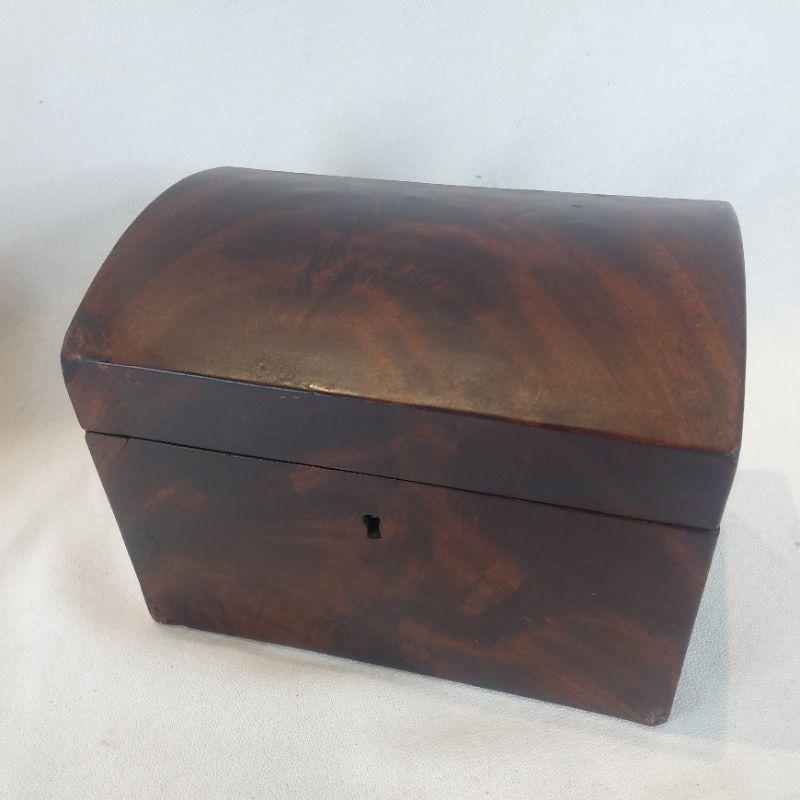 This lot is an Antique Tea Caddy or Tobacco Box. This is a beauty and has some age. It is constructed of Burl Mahogany, with a wonderful camel top. Looks English, but could be New England manufacturer. It has a lock but no key. Box measures 6 1/2-inches wide X 4-inches deep X 43/4-inches tall. A very nice box with a great patina. Reserve/starting bid is $20.
