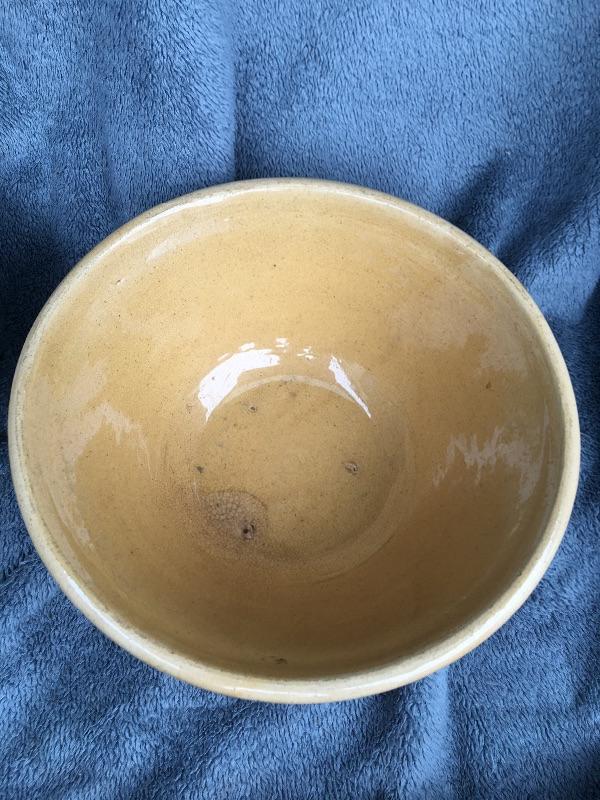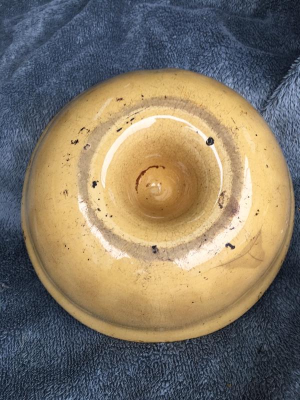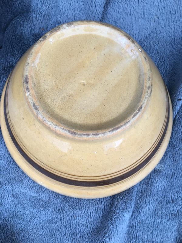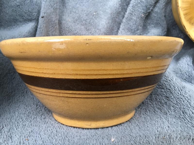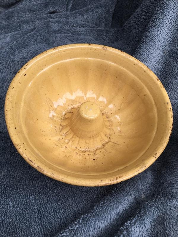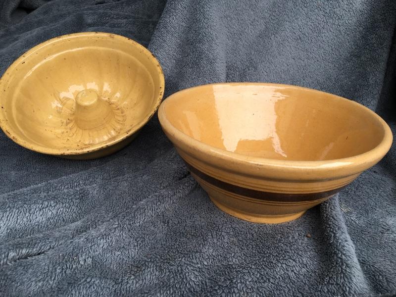 Antique 10” Banded Yellow Ware Bowl and 9” Bun Cake Mold