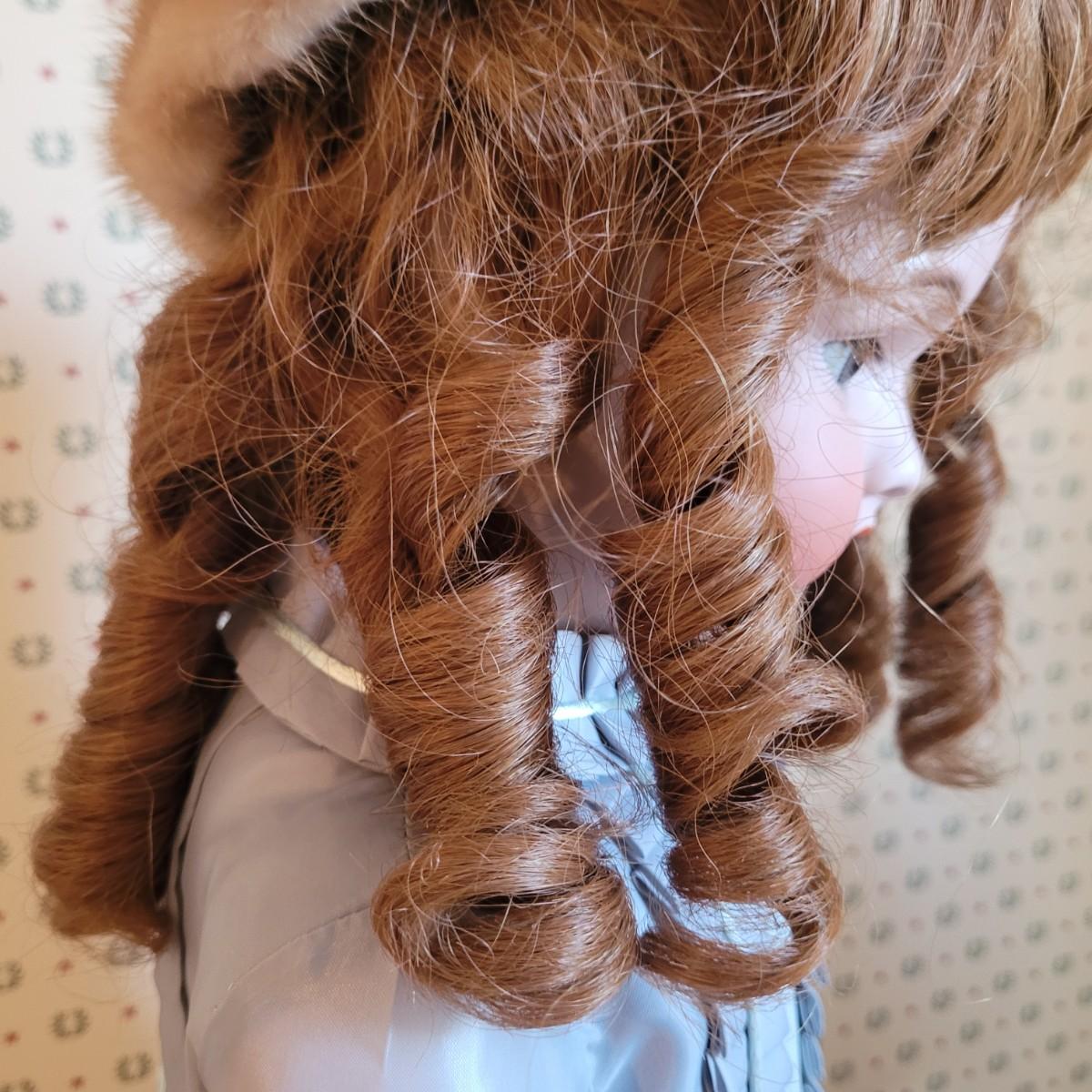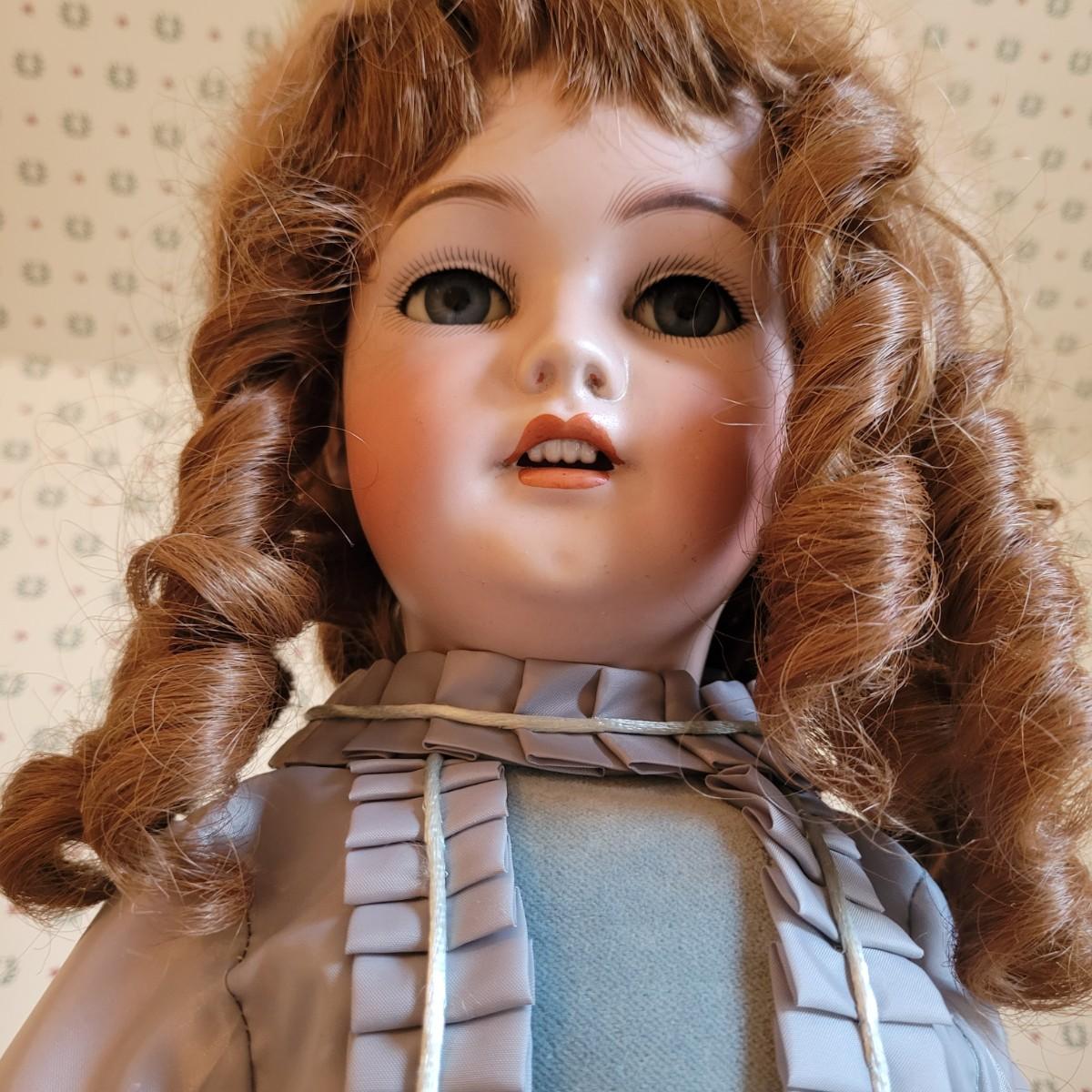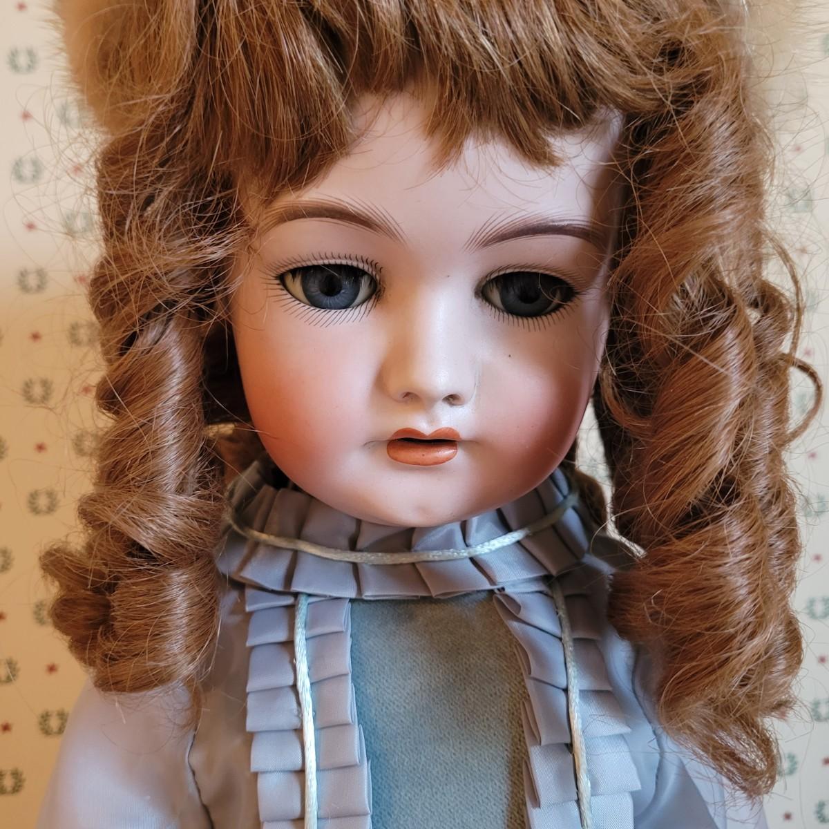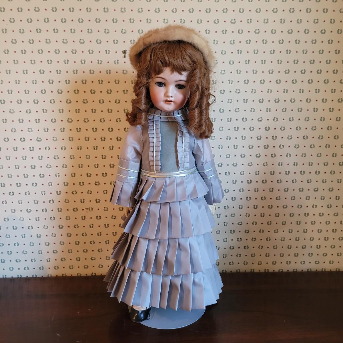 This antique 25” 1078 Simon & Halbig Germany doll (#13) depicts a young girl with beautiful auburn ringlets, a blue grey satin dress, and a fur cap. Set on metal stand. Full measurements are 26”x12”x11” Shipping available.