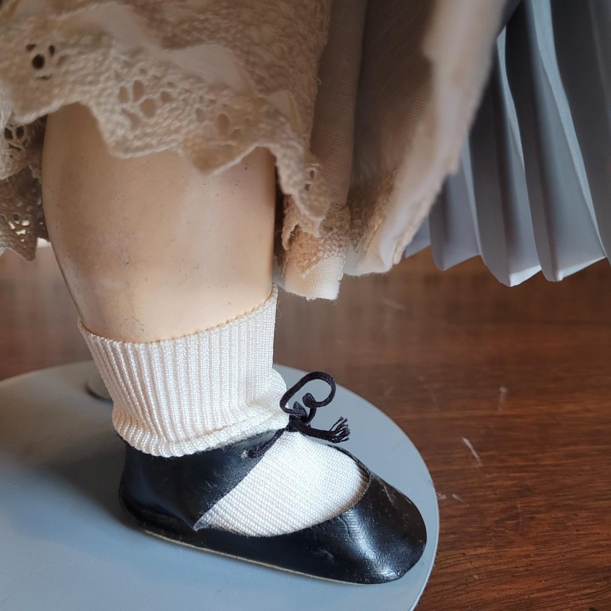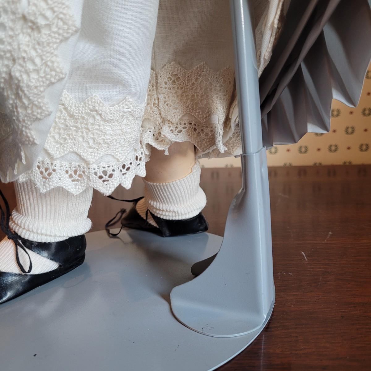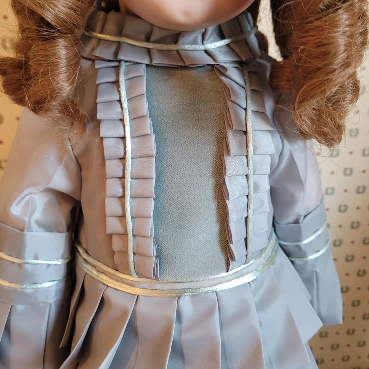 This antique 25” 1078 Simon & Halbig Germany doll (#13) depicts a young girl with beautiful auburn ringlets, a blue grey satin dress, and a fur cap. Set on metal stand. Full measurements are 26”x12”x11” Shipping available.