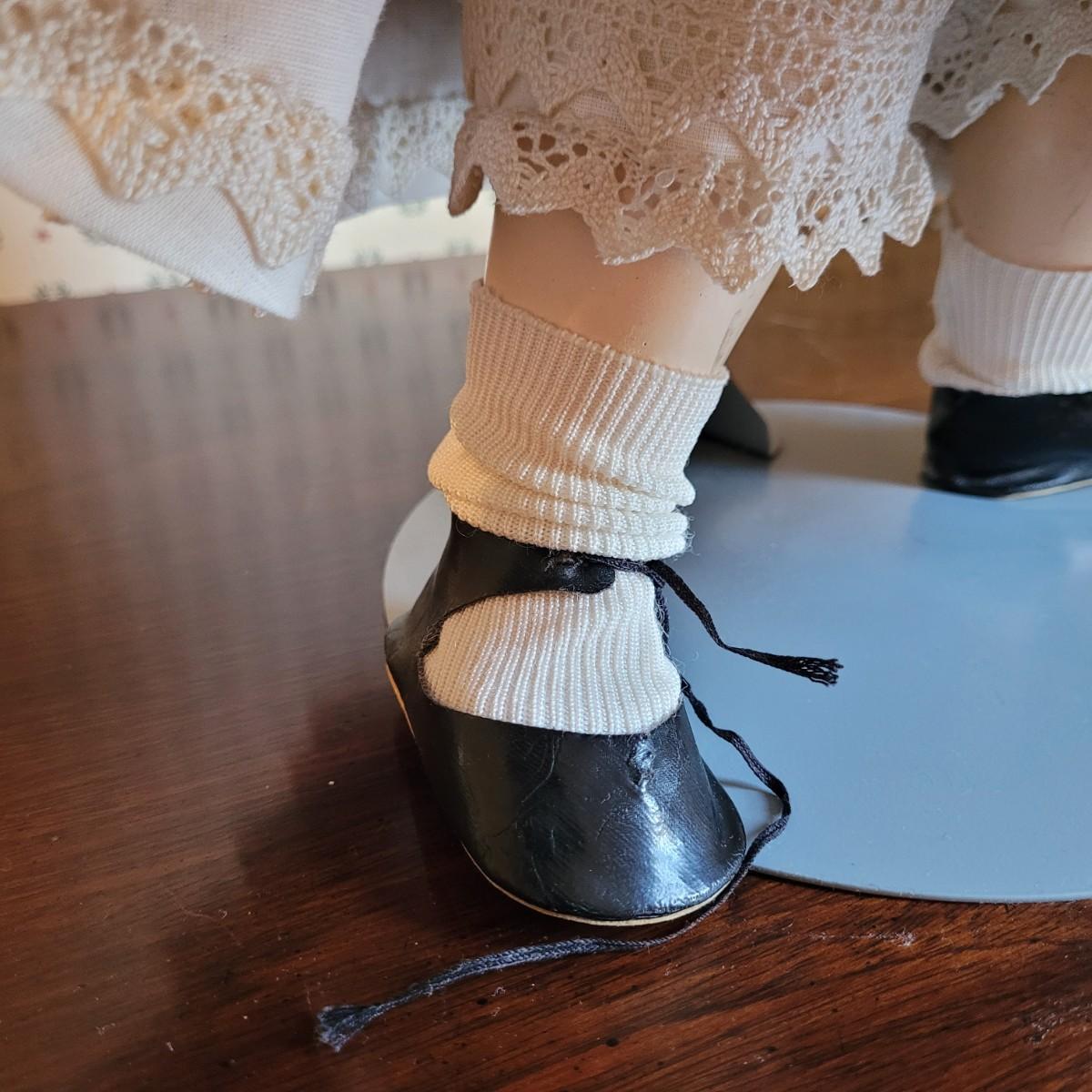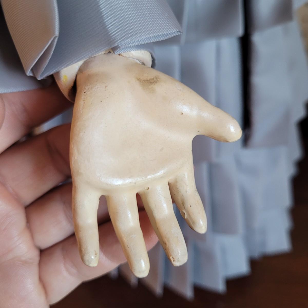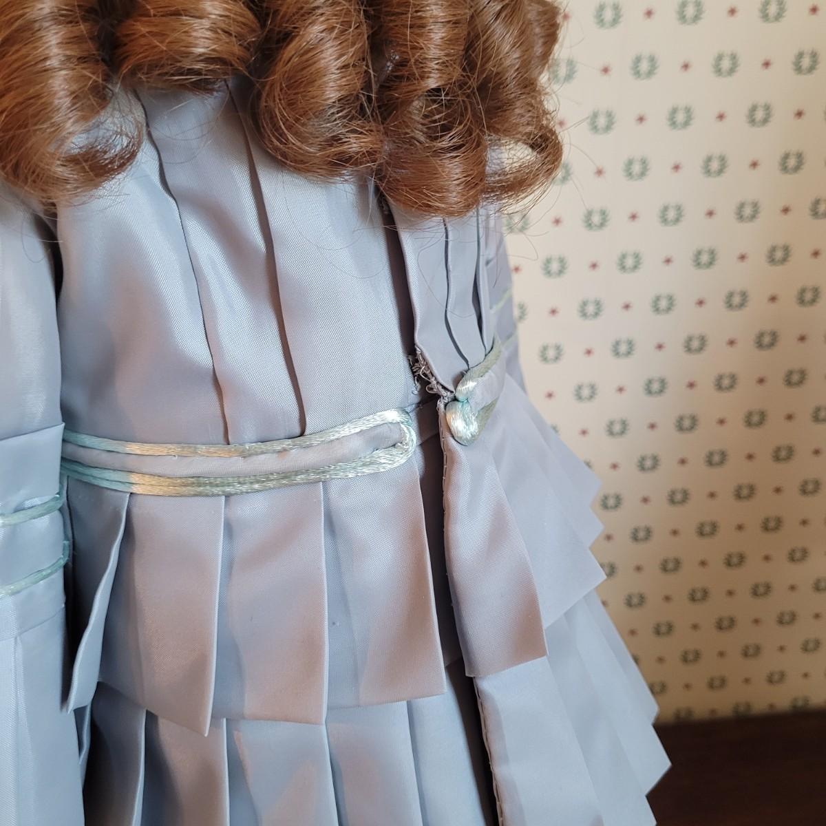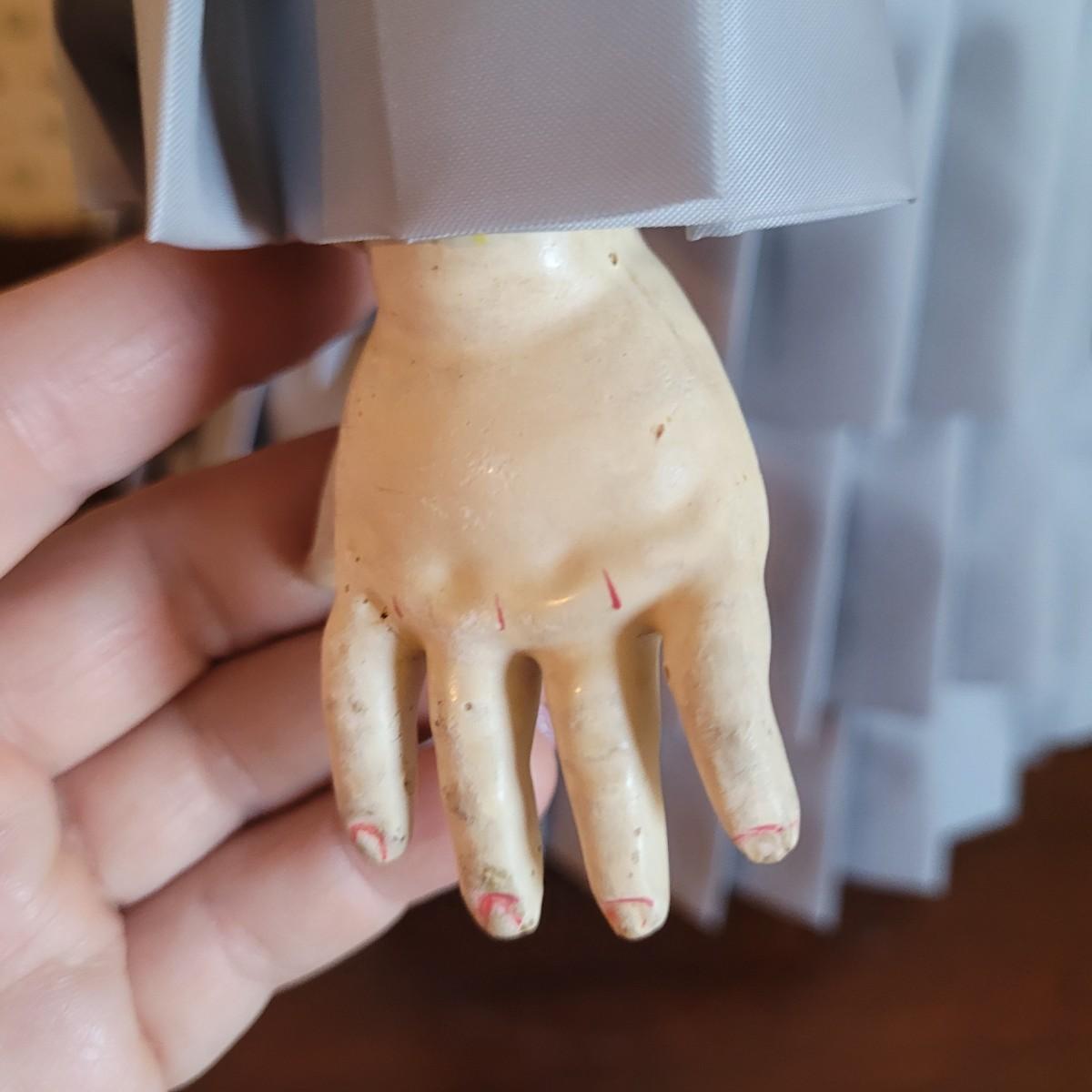 This antique 25” 1078 Simon & Halbig Germany doll (#13) depicts a young girl with beautiful auburn ringlets, a blue grey satin dress, and a fur cap. Set on metal stand. Full measurements are 26”x12”x11” Shipping available.