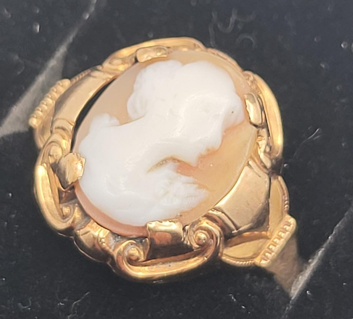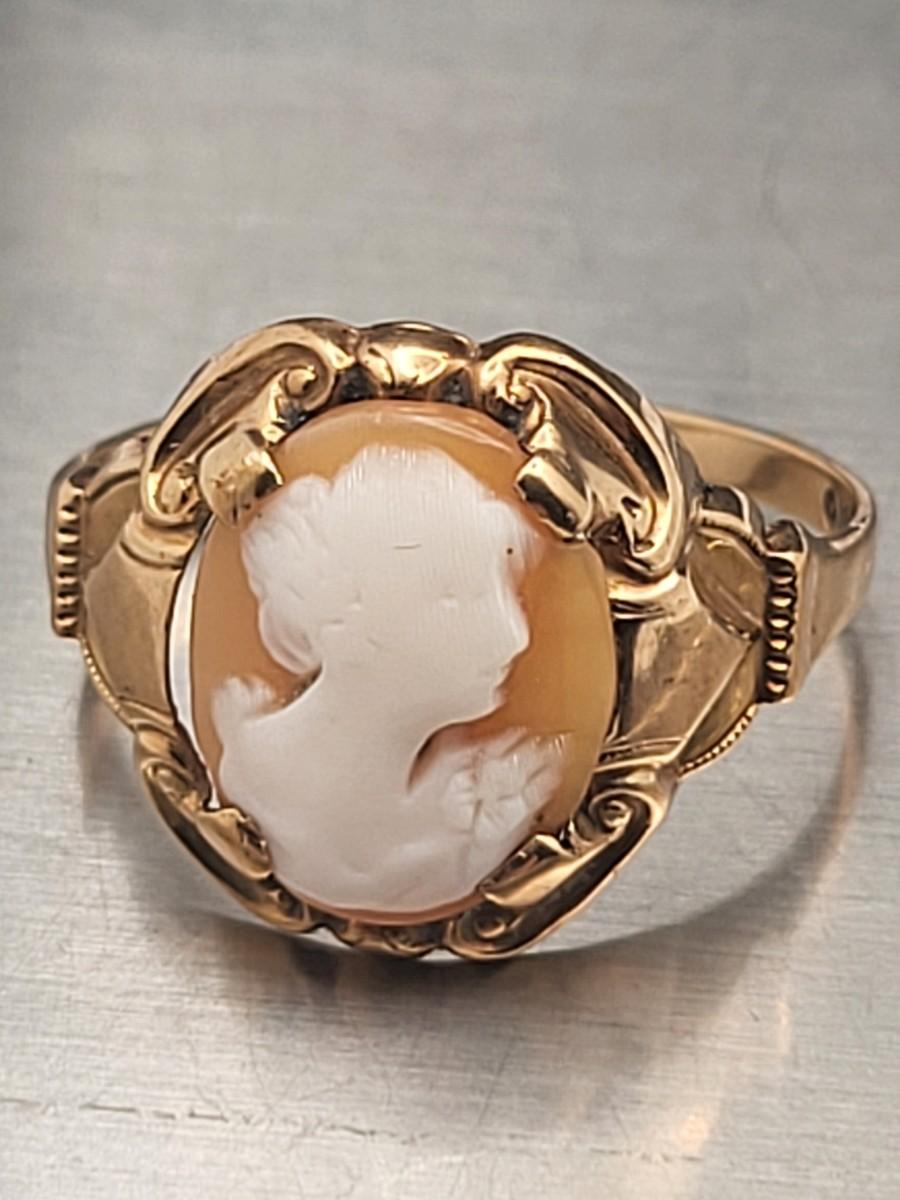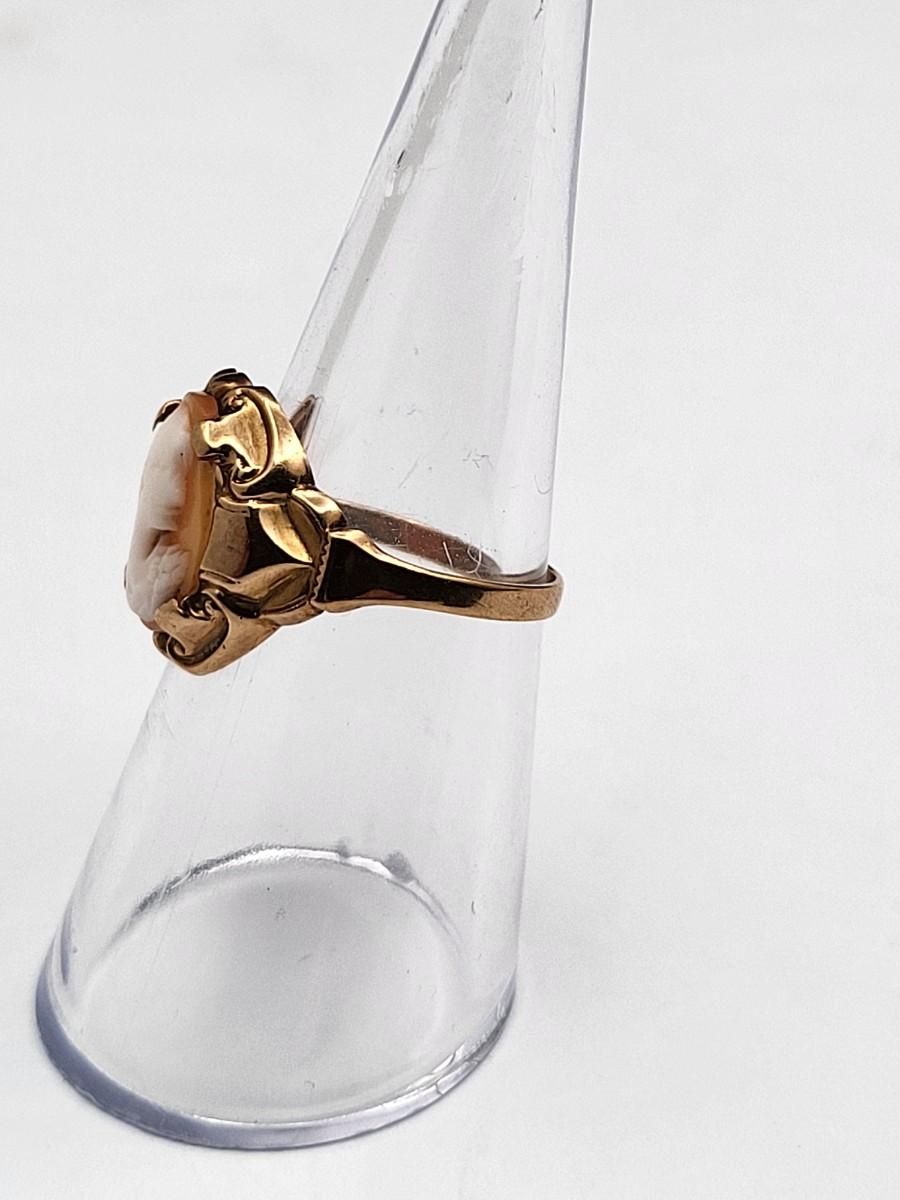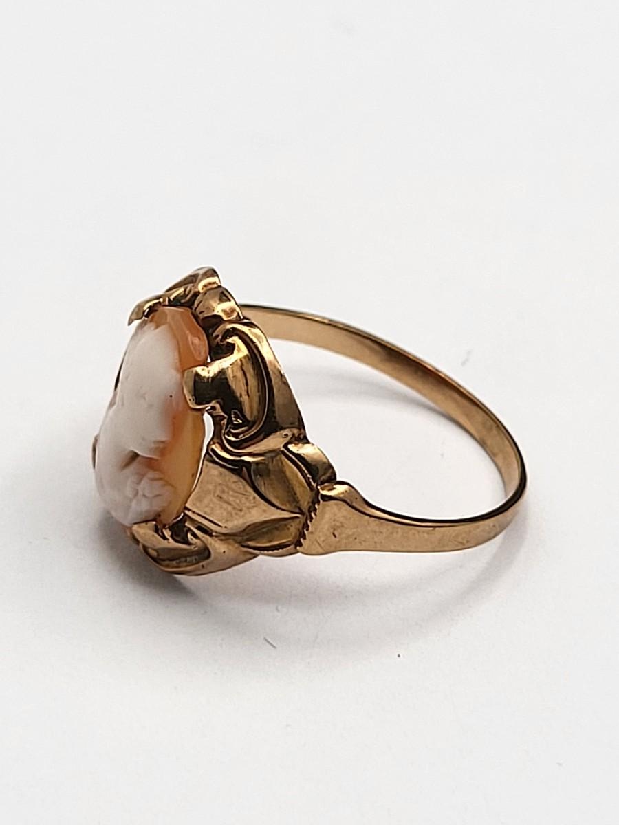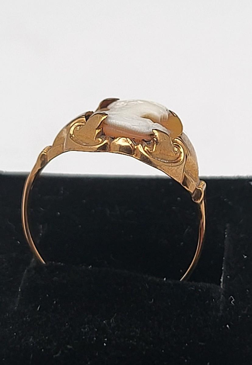 Antique carved shell cameo ring, 10k yellow gold. Size 7. Weighs 1.75 grams.