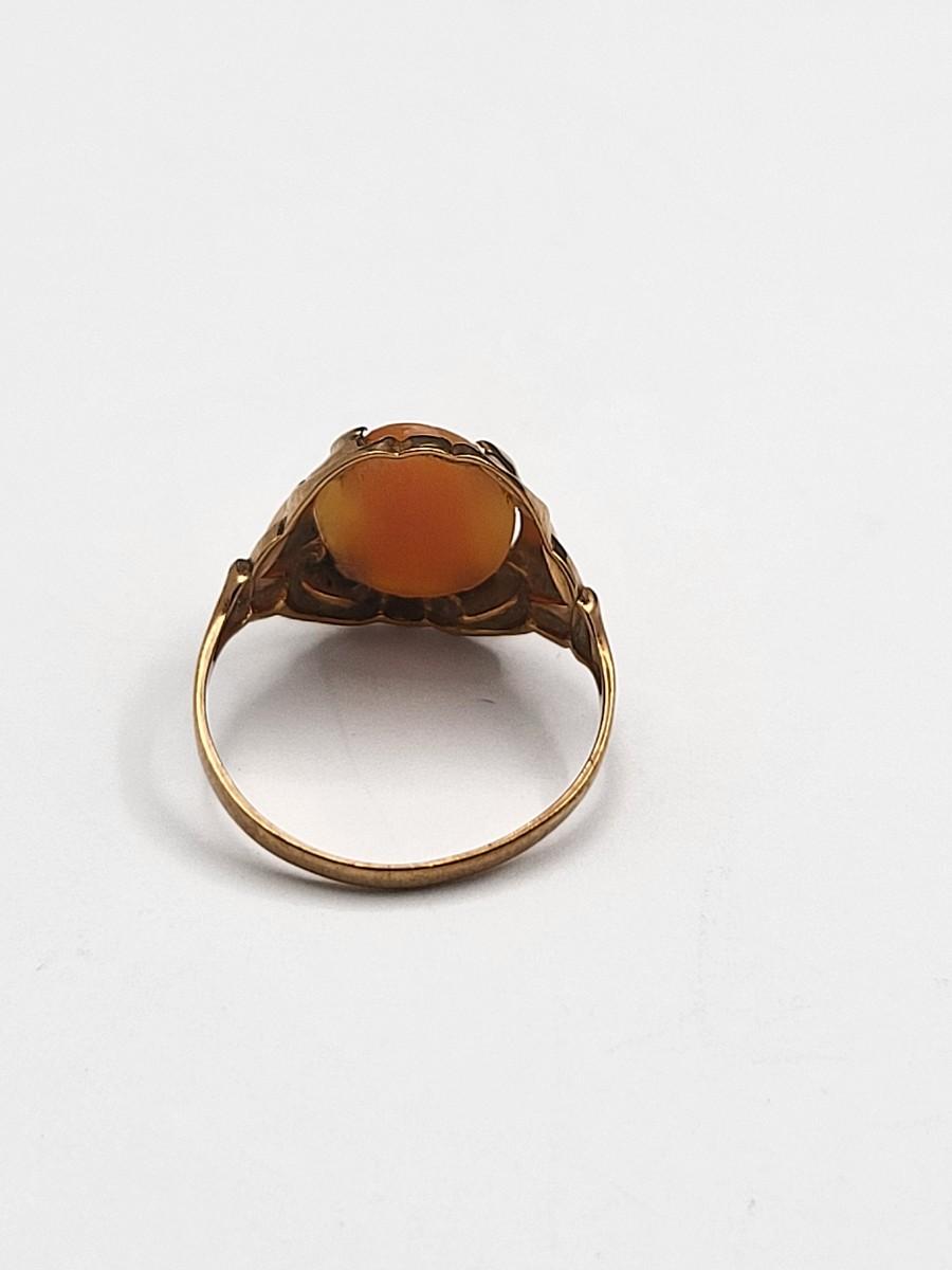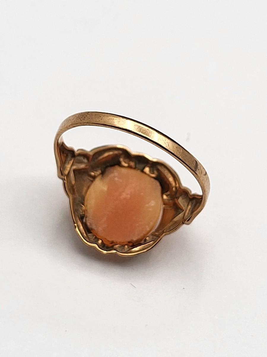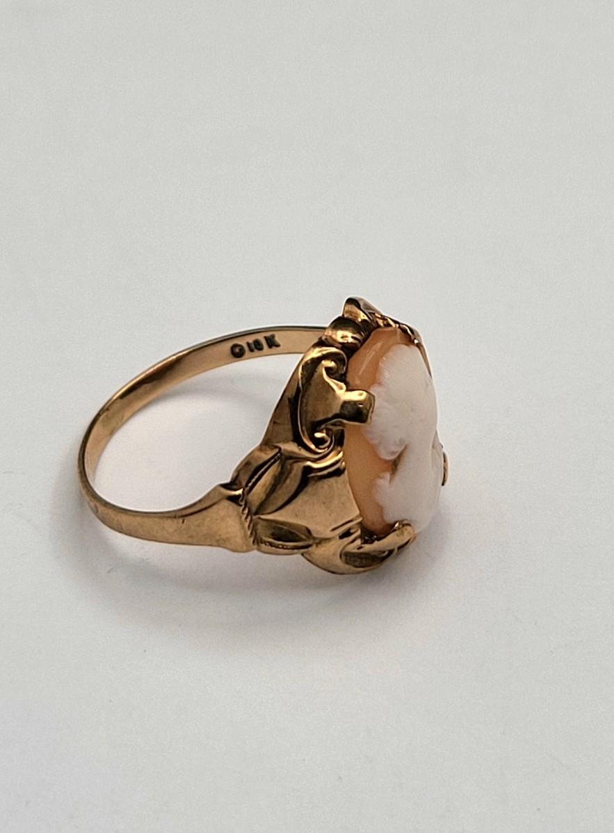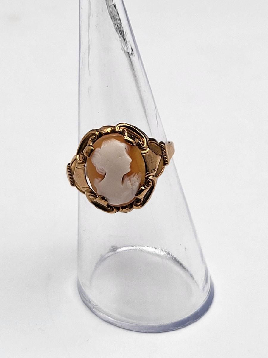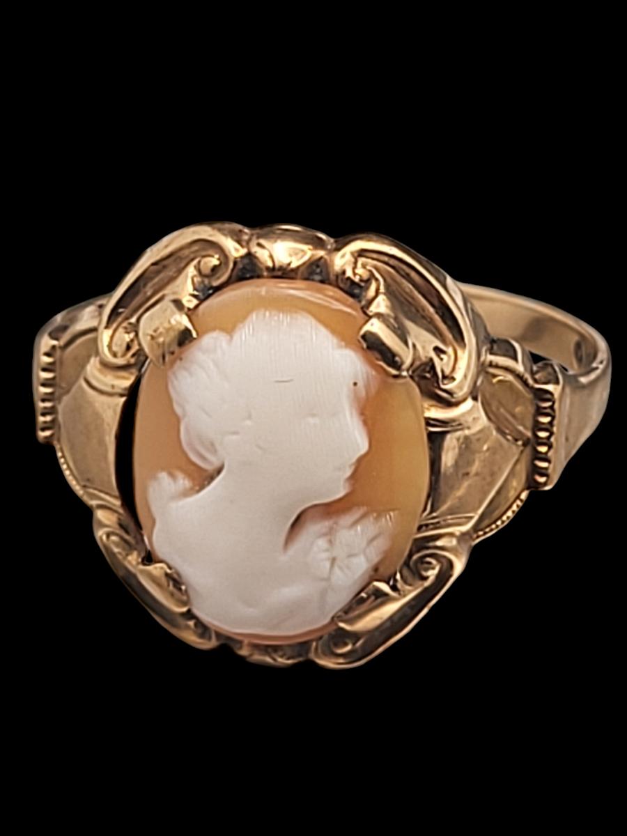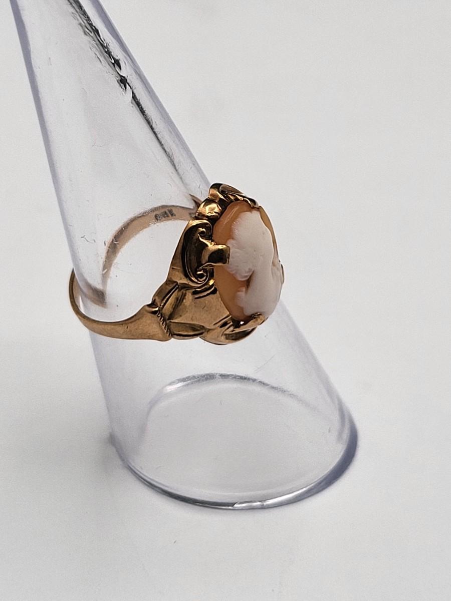 Antique carved shell cameo ring, 10k yellow gold. Size 7. Weighs 1.75 grams.