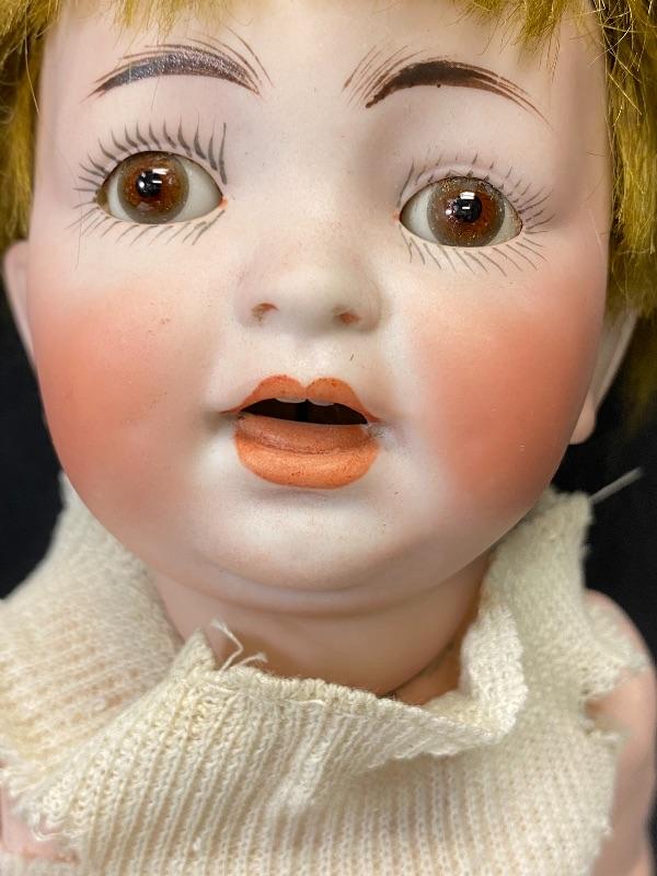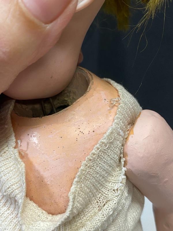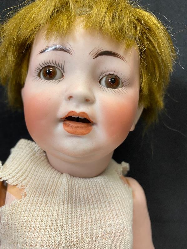 Antique 12" German doll. Bisque head with composite body. Head is marked on the back, looks like it says Made in Germany 152/3. Face paint is in good condition. I believe it should have sleep eyes but there is bubble wrap stuffed in the head. I do not know what is wrong with the hair, it is a odd color almost like it has faded over time. Composite body has light damage around neck. Arms look to have been repainted and at least one finger is damaged. Displays nicely, head looks to be original, old.