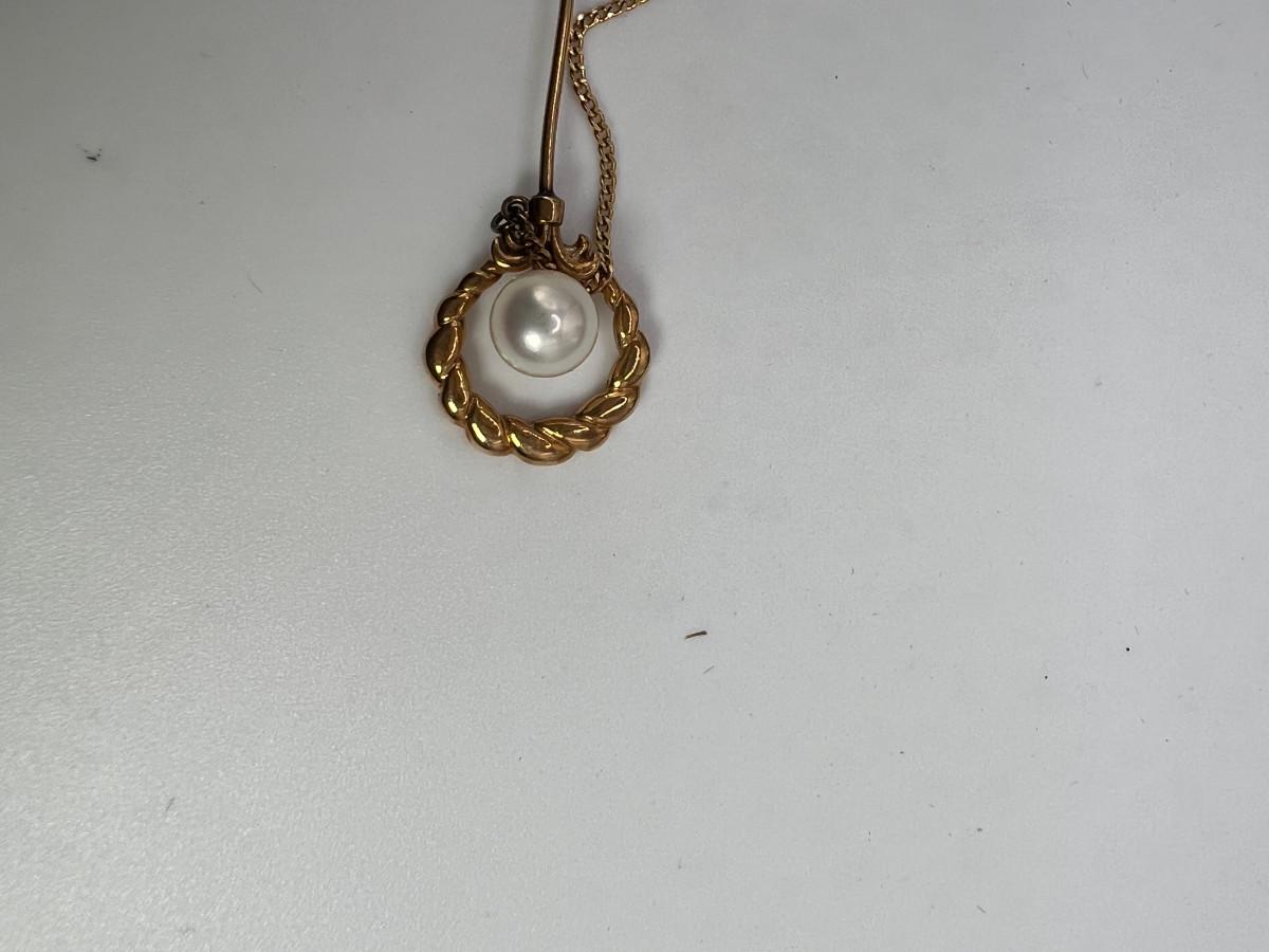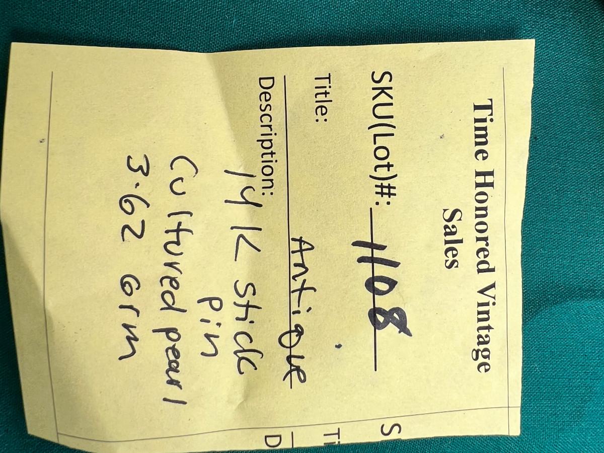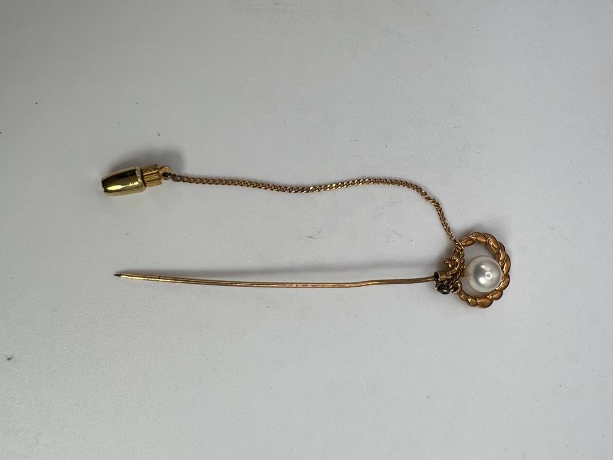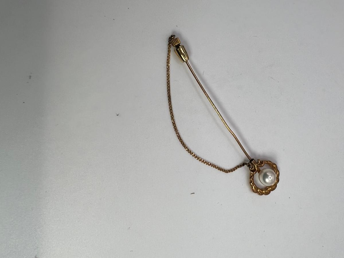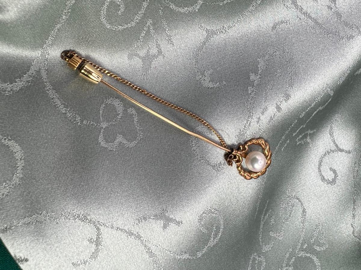Antique 14K Cultured pearl stick pin with 14K safety chain
