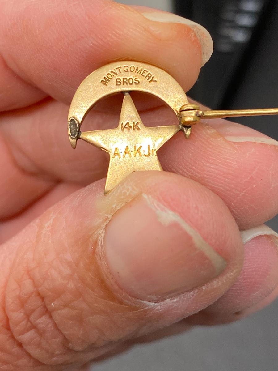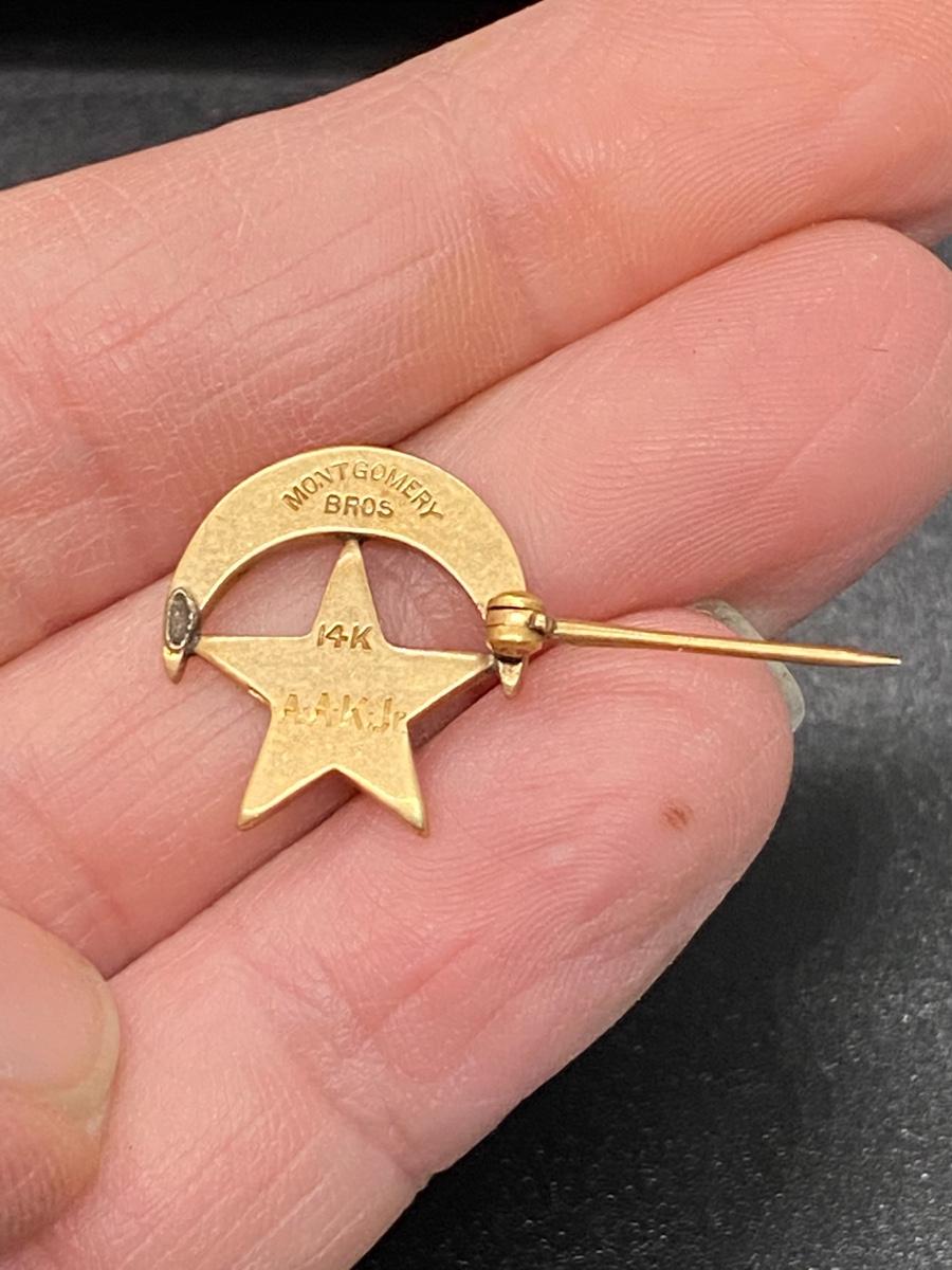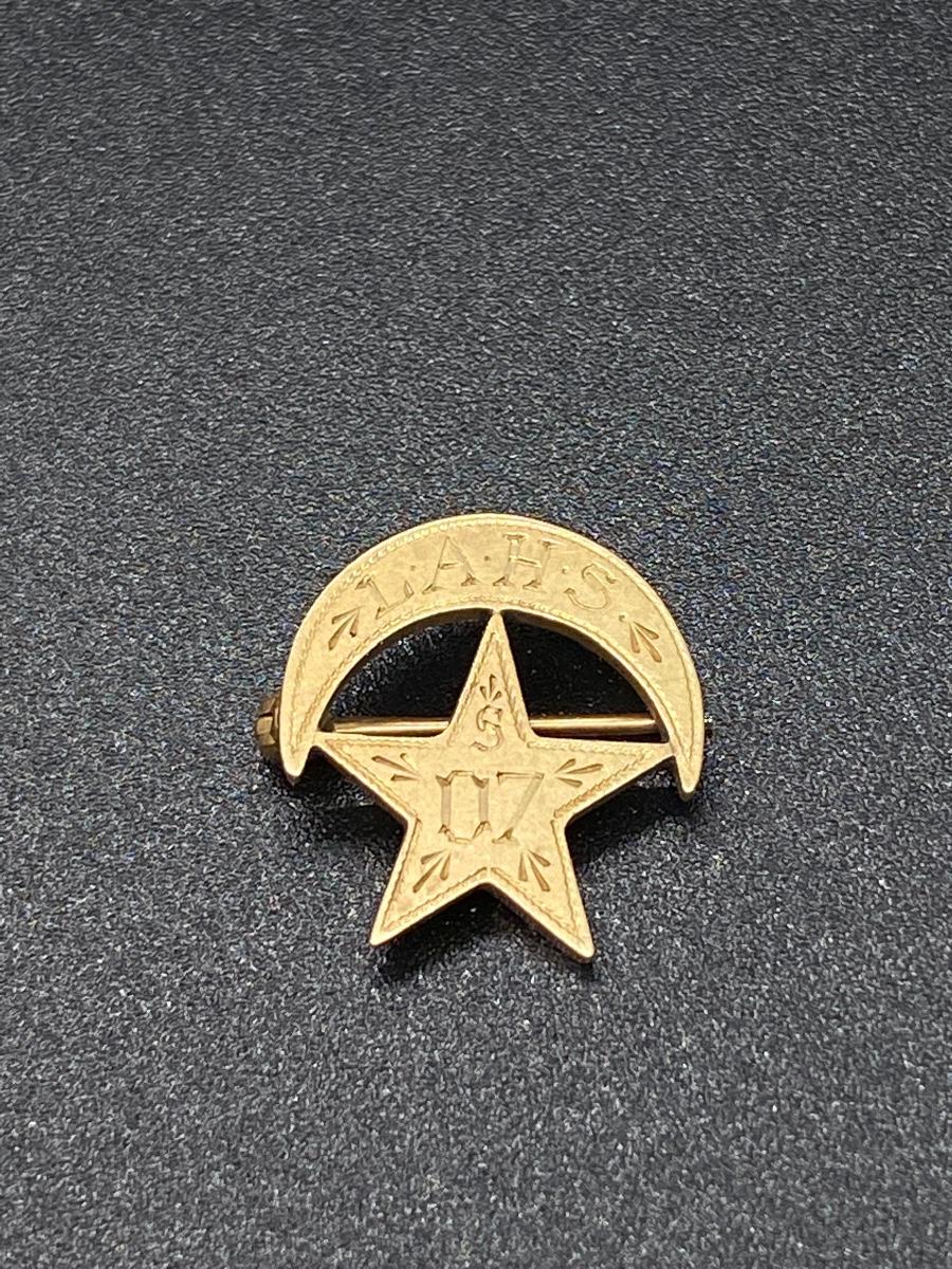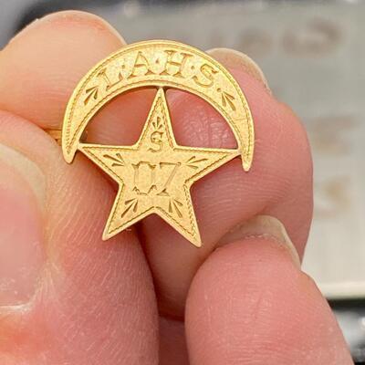 Antique 14k yellow gold high school pin. Etched LAHS S 07, a crescent moon over star. Believe the S 07 refers to Senior 1907, but not sure. Stamped on the back. About 1/2" size.