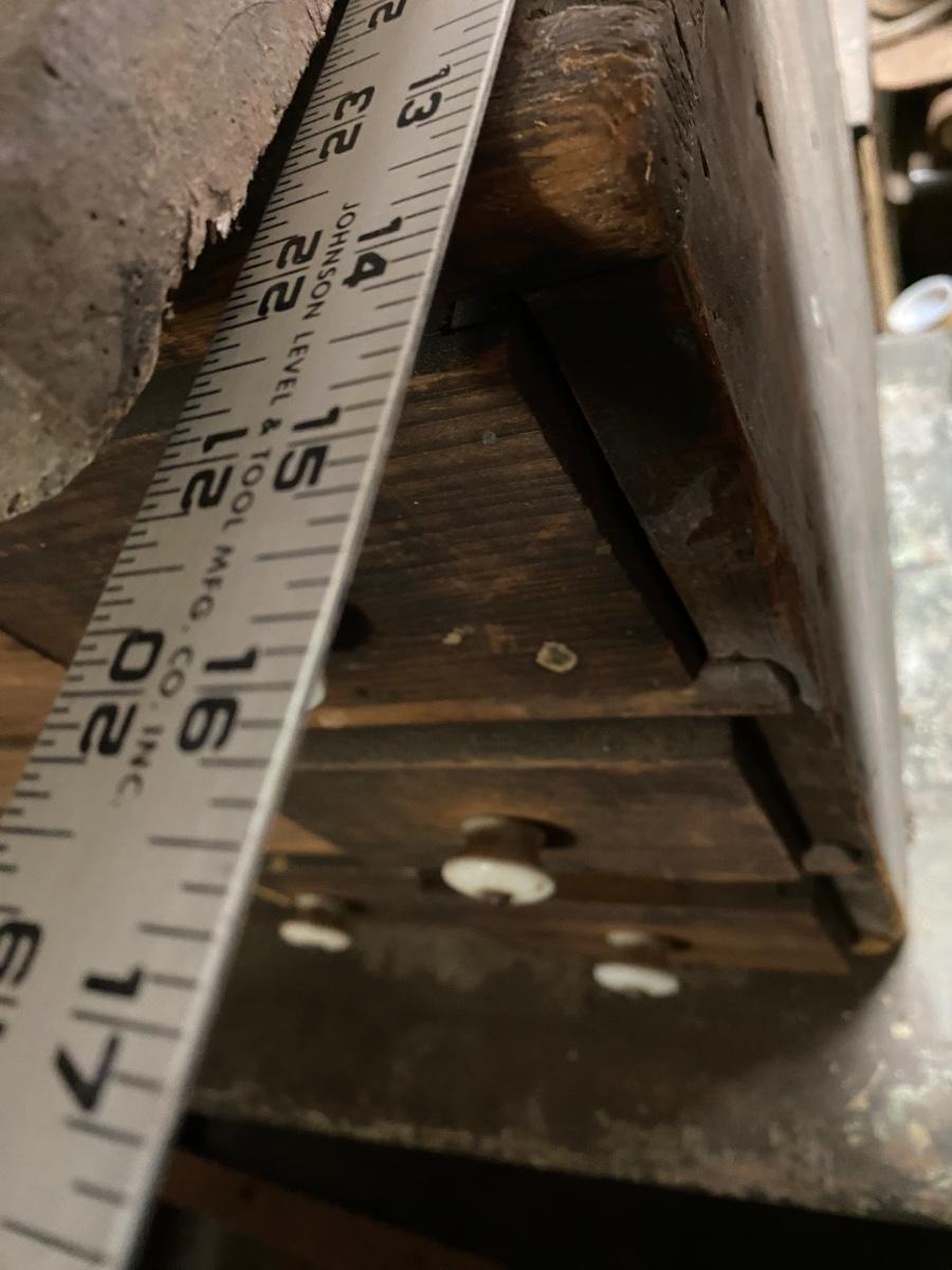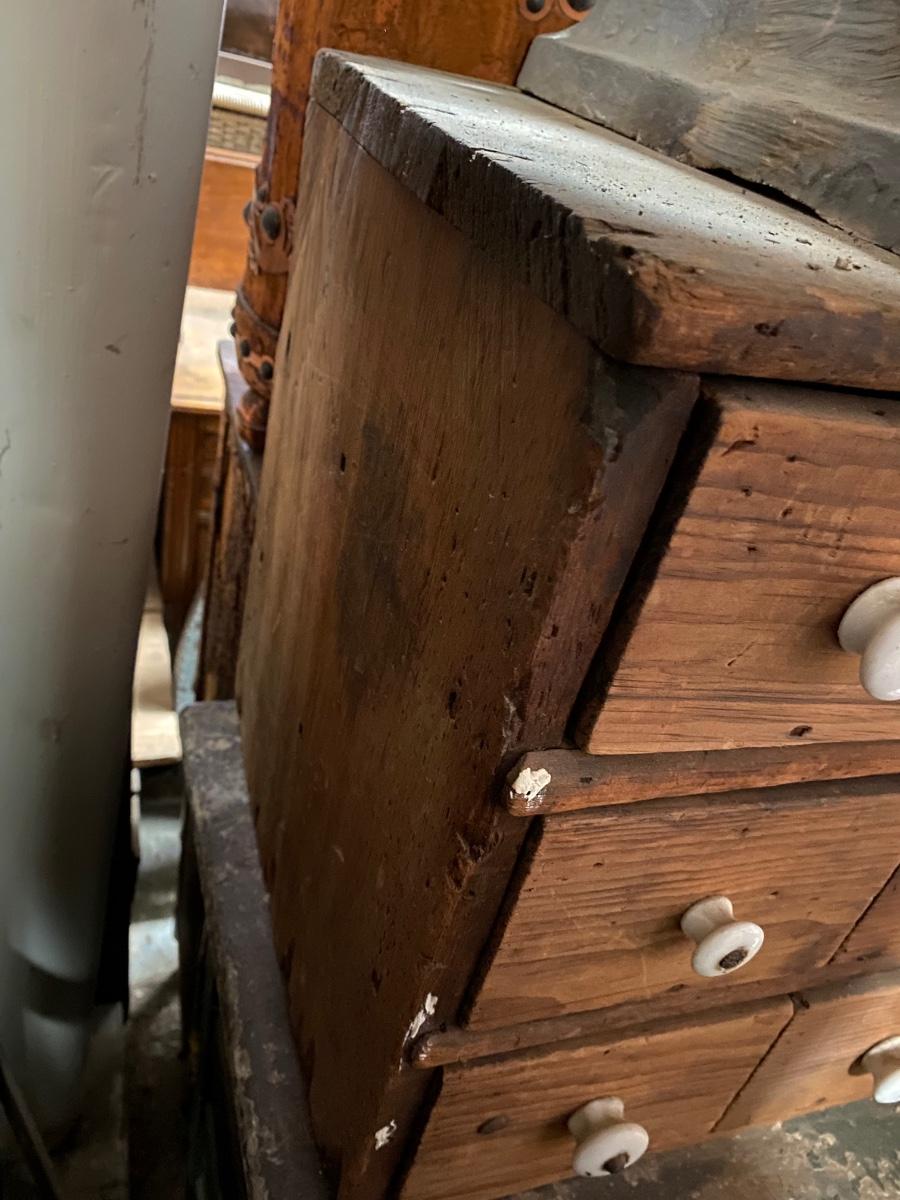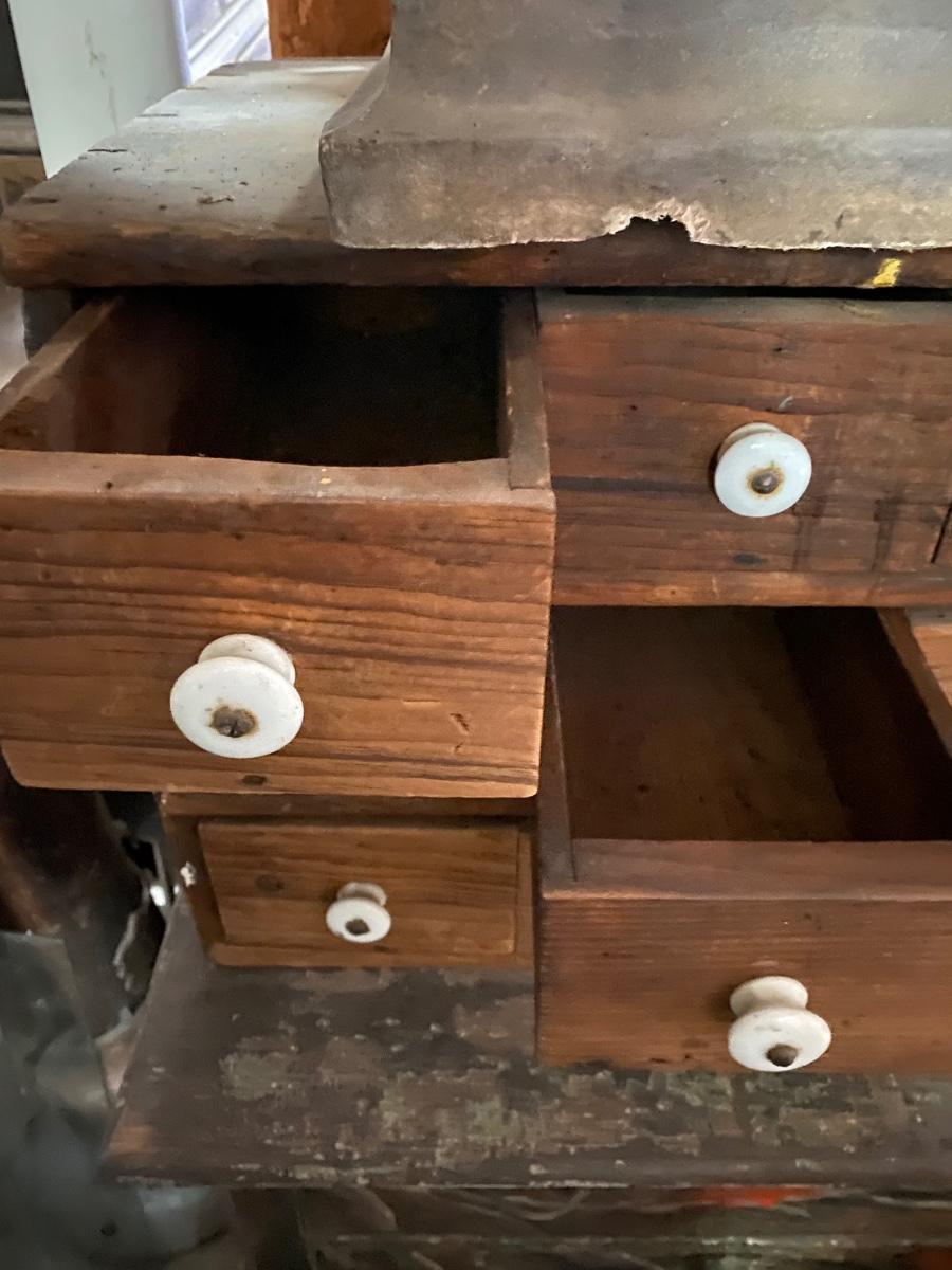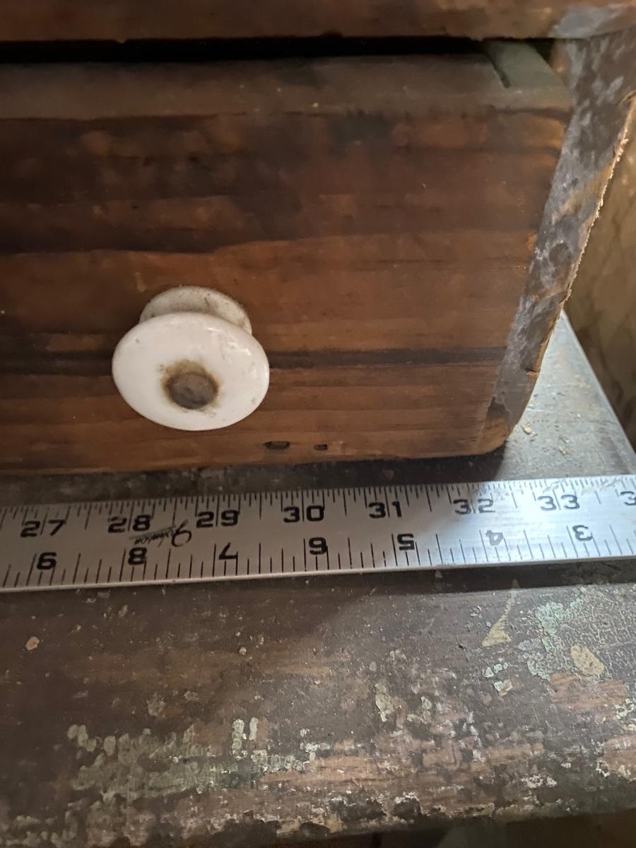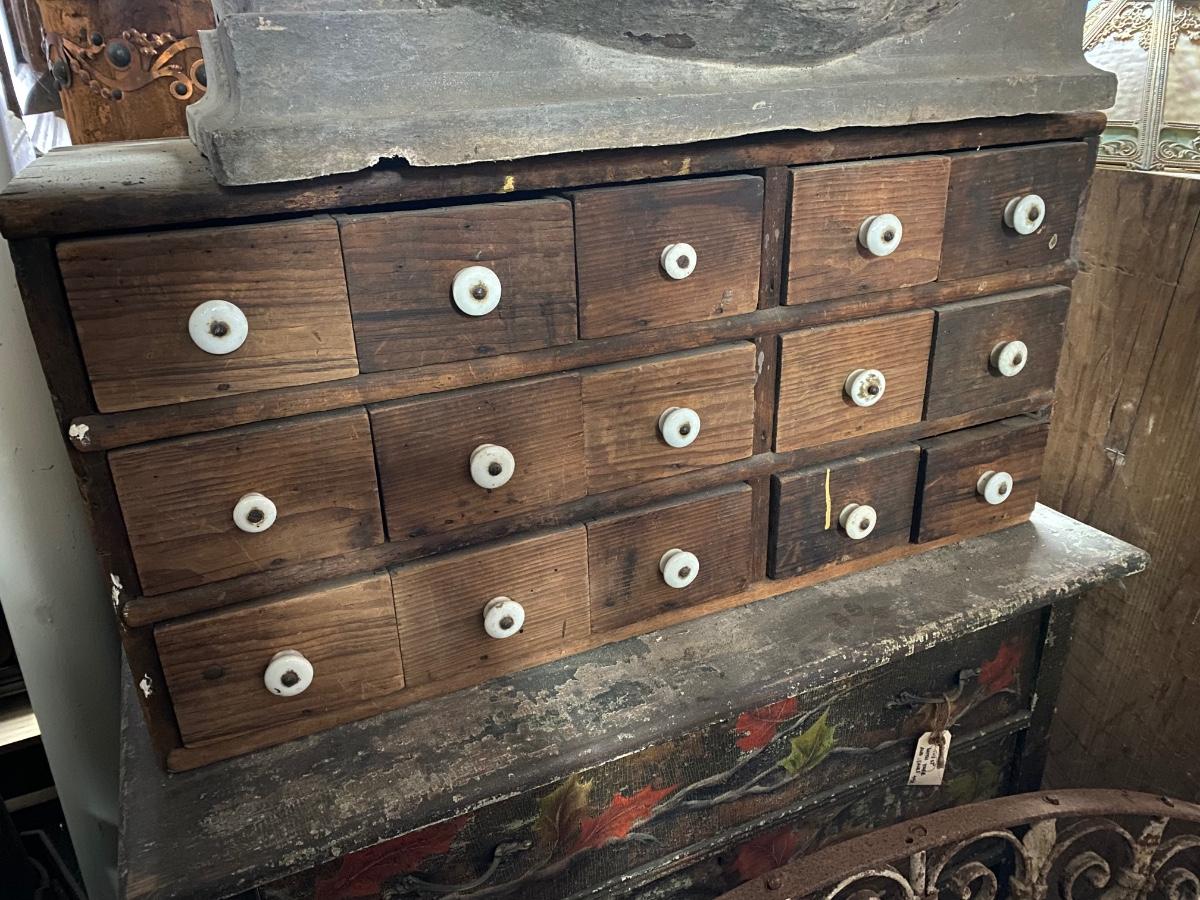 Antique 15 Drawer Wooden Apothecary Chest with porcelain pulls. 33Lx20Hx14D