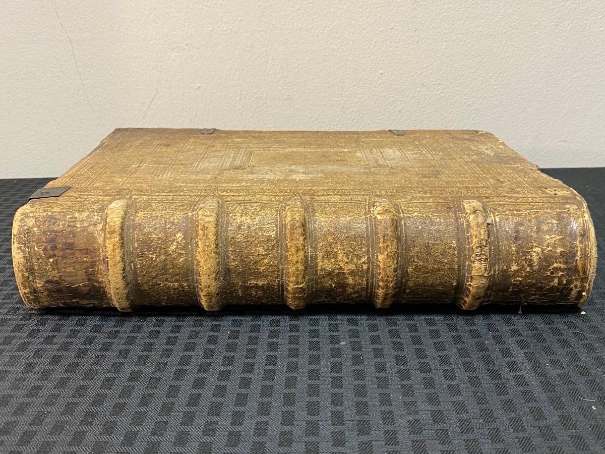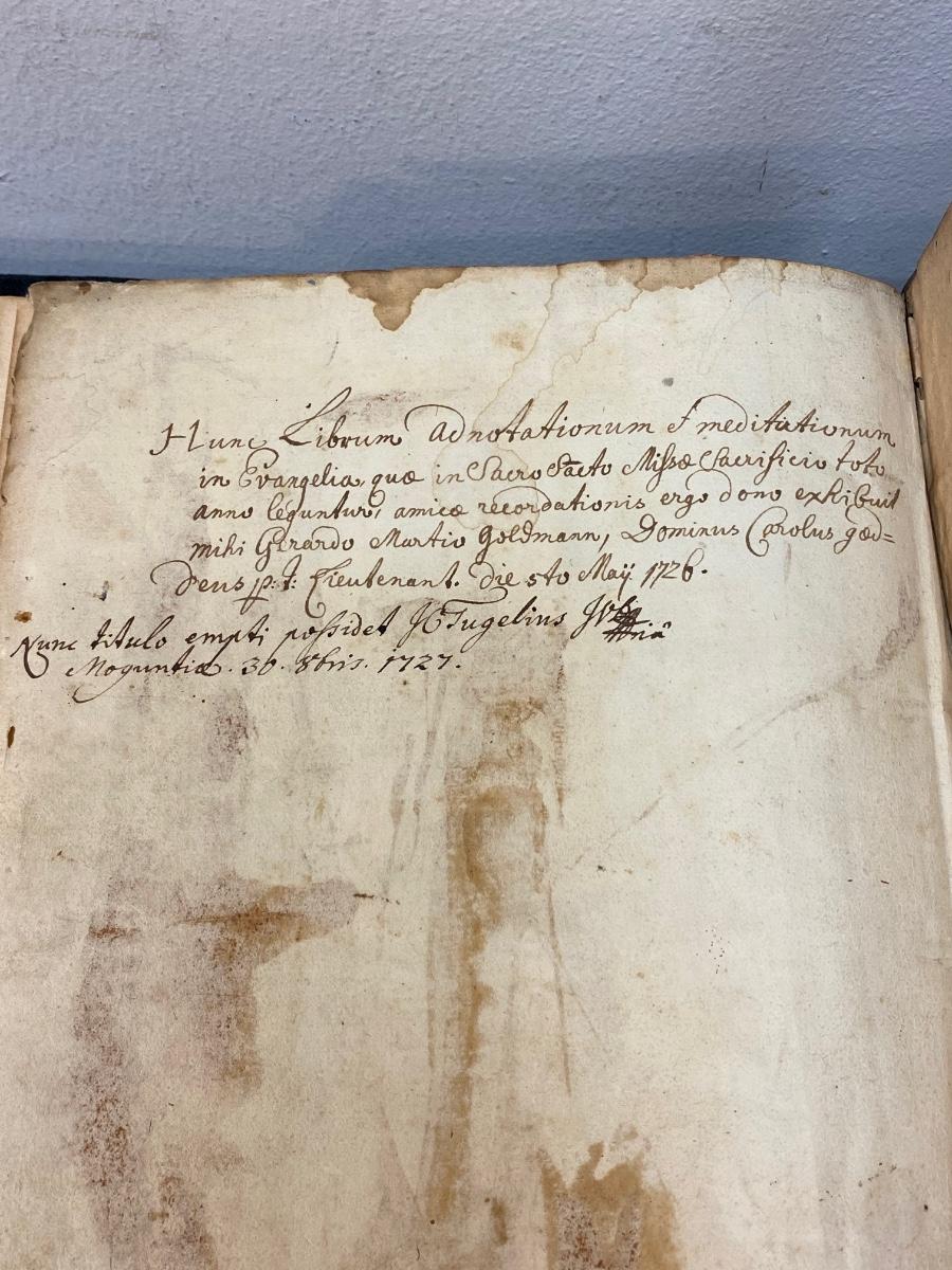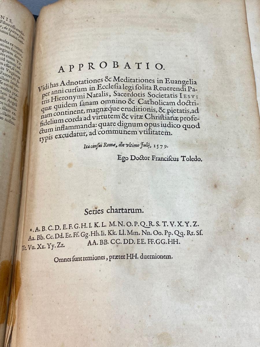 Antique book of gospel, believe to be dated 1607. It is in Latin and has been difficult to translate. Words are from Hieronymo (Jerome) Natali a Society of Jesus theologian. There is wear from age to the cover and pages. It seems to have pages missing from the appendix area in the back. There is also a handwritten note in back dated 1727. Interesting piece of literature.