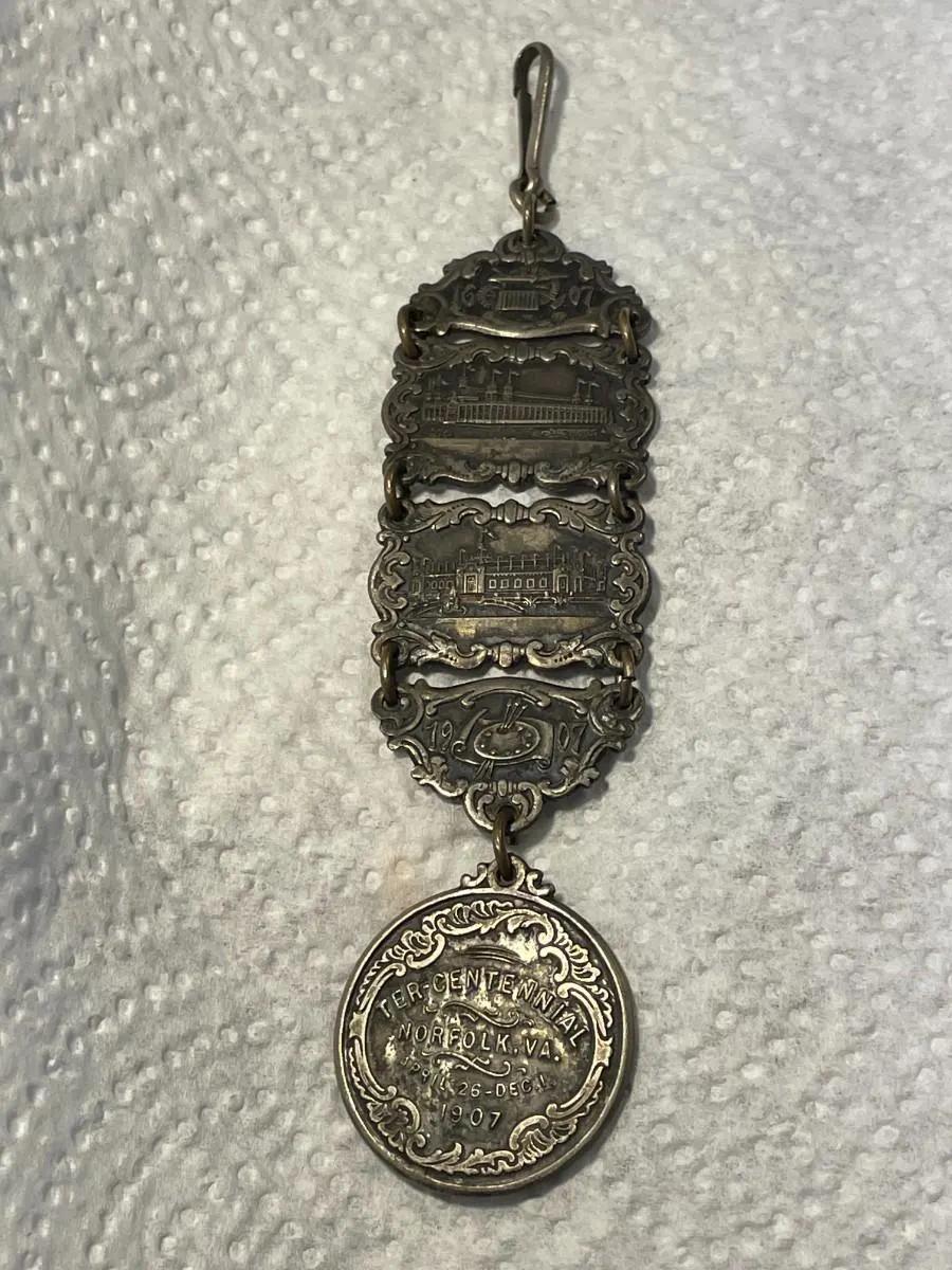 ANTIQUE 1607/1907 JAMESTOWN Ter-Centennial Exposition Silver Watch Fob in Good Preowned Condition. $5 DOMESTIC SHIPPING.