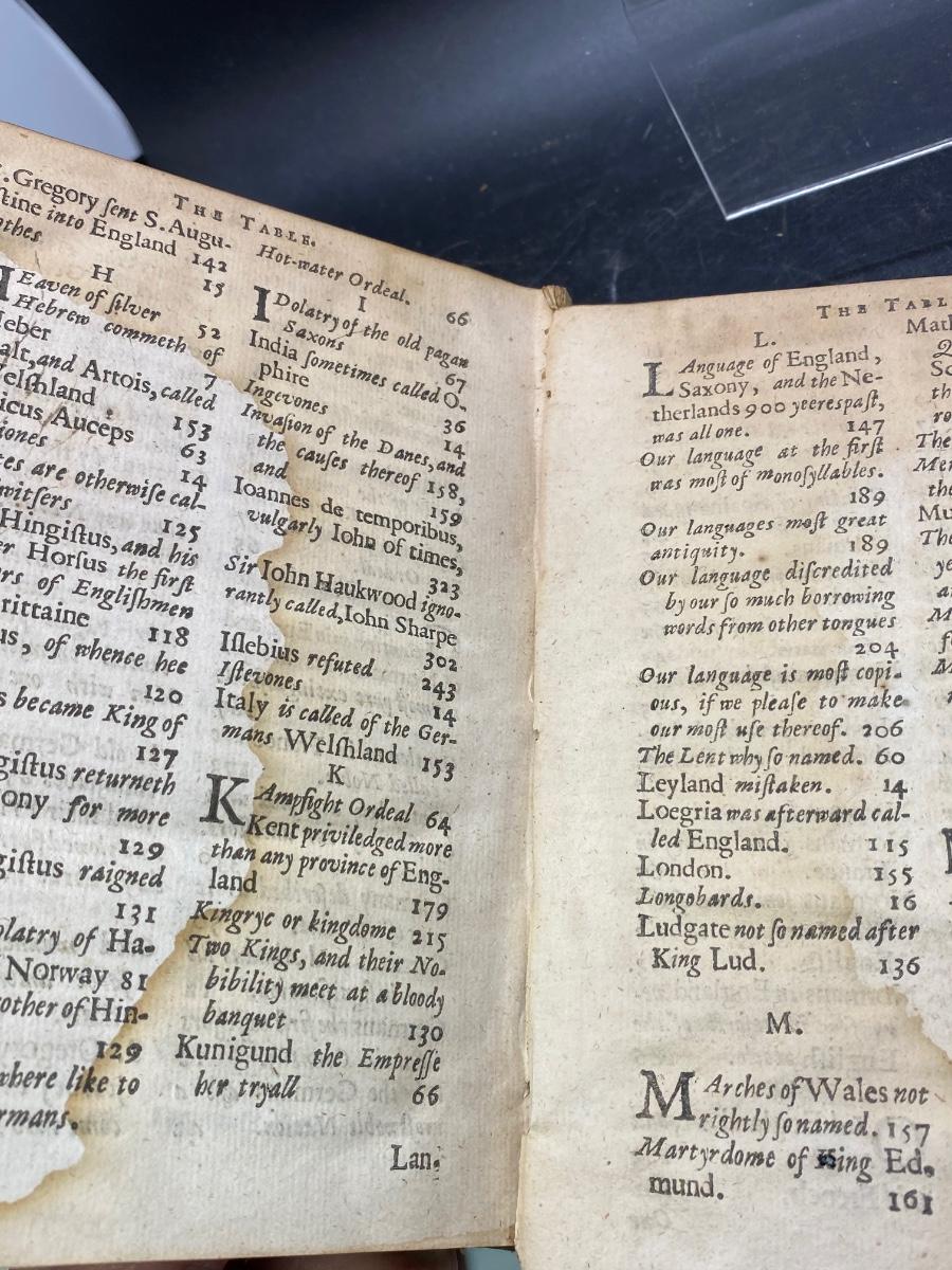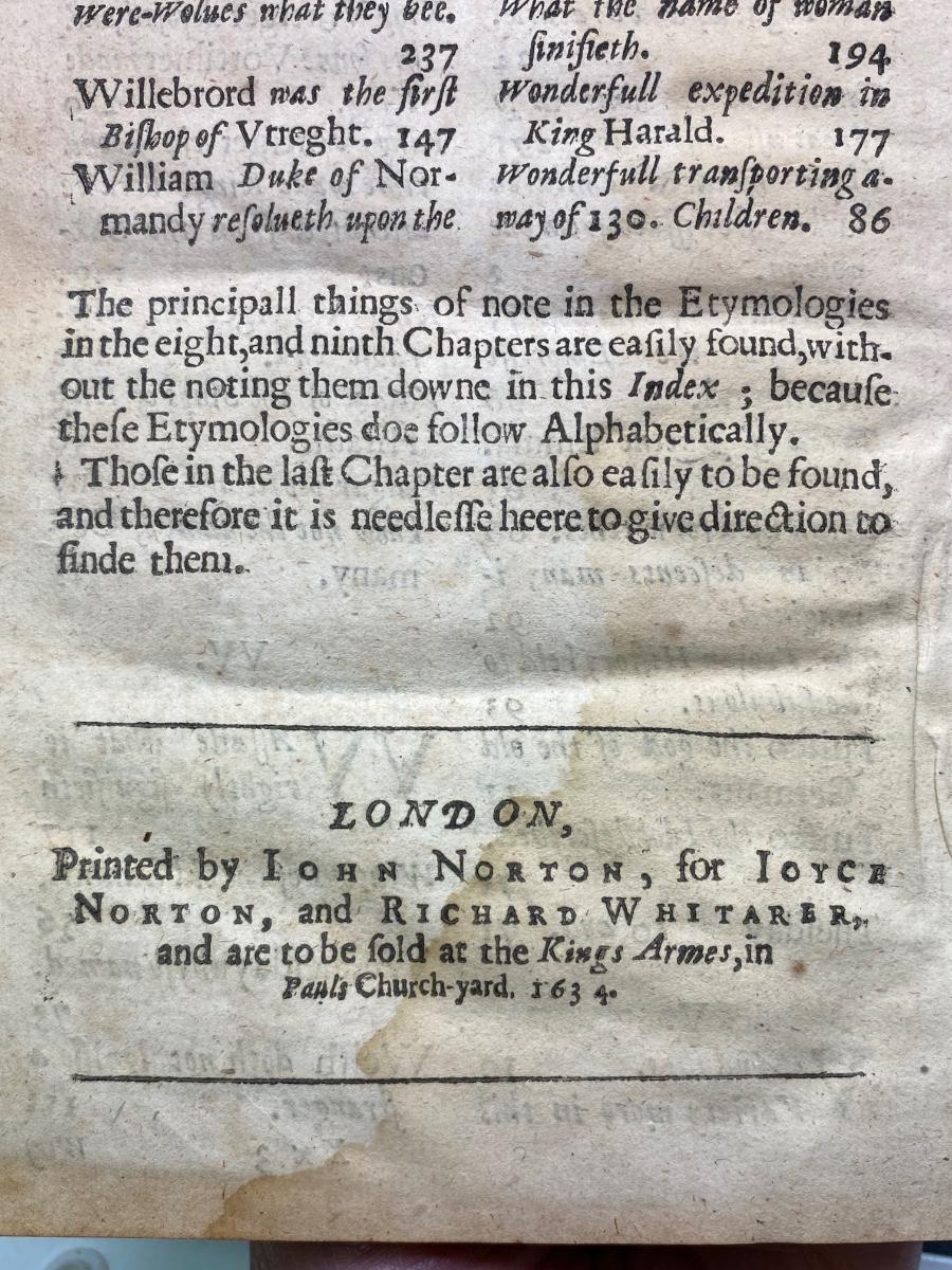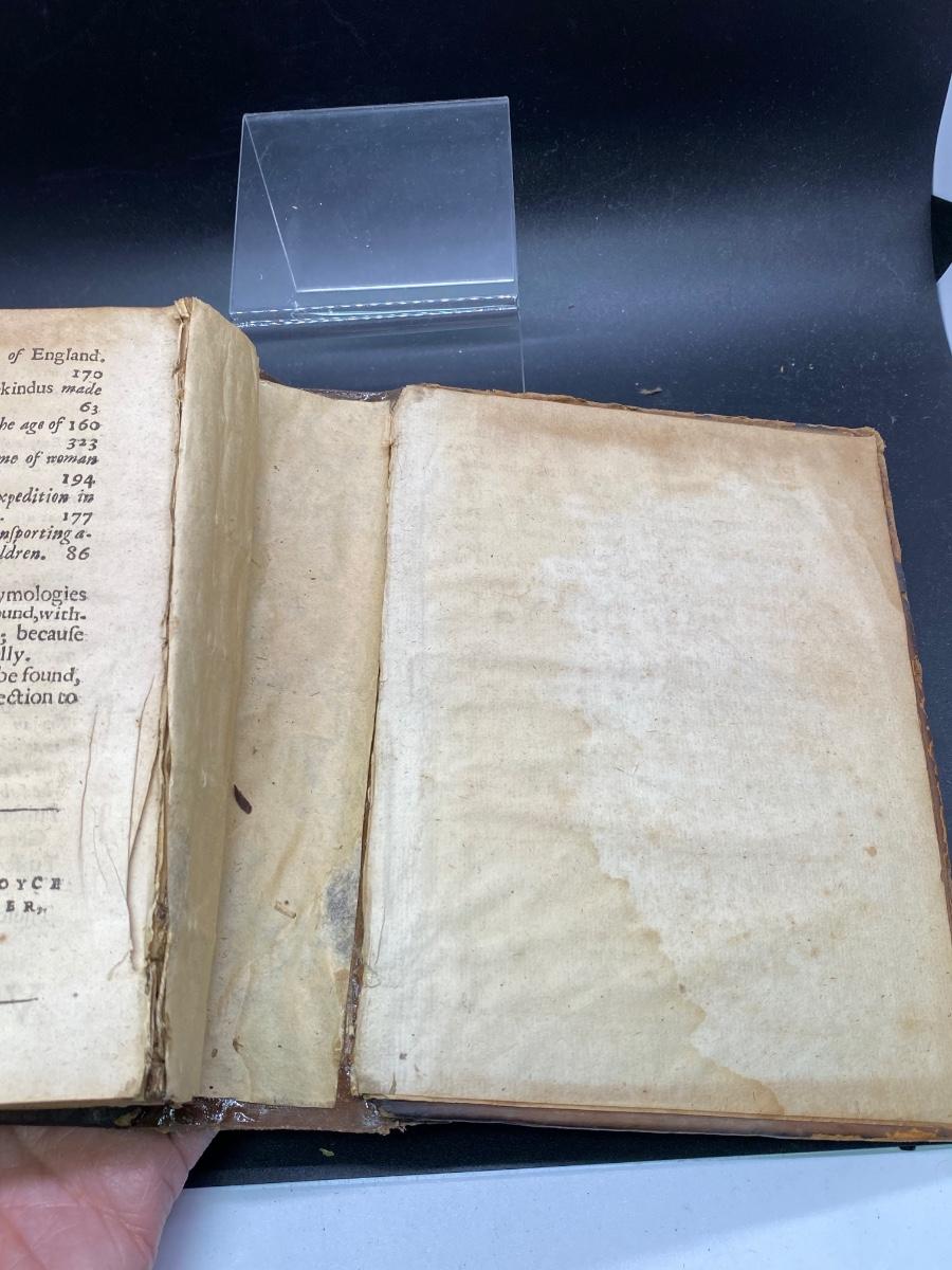 Antique 16th Century Book A Restitution of Decayed Intelligence by Richard Verstegan, there is water damage to the pages of the book as well as some damage to the spine and cover, but the pages are still intact and is in good condition for its very old age. Check pictures for more details and for sizing.