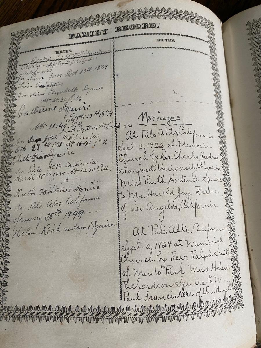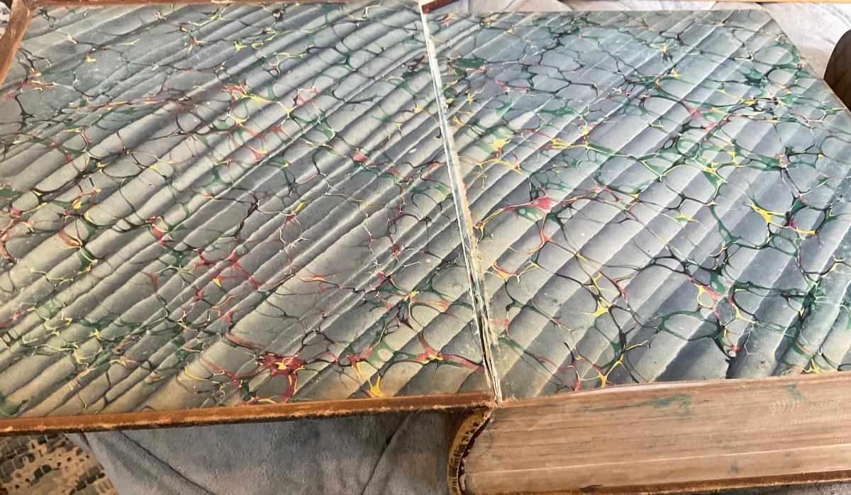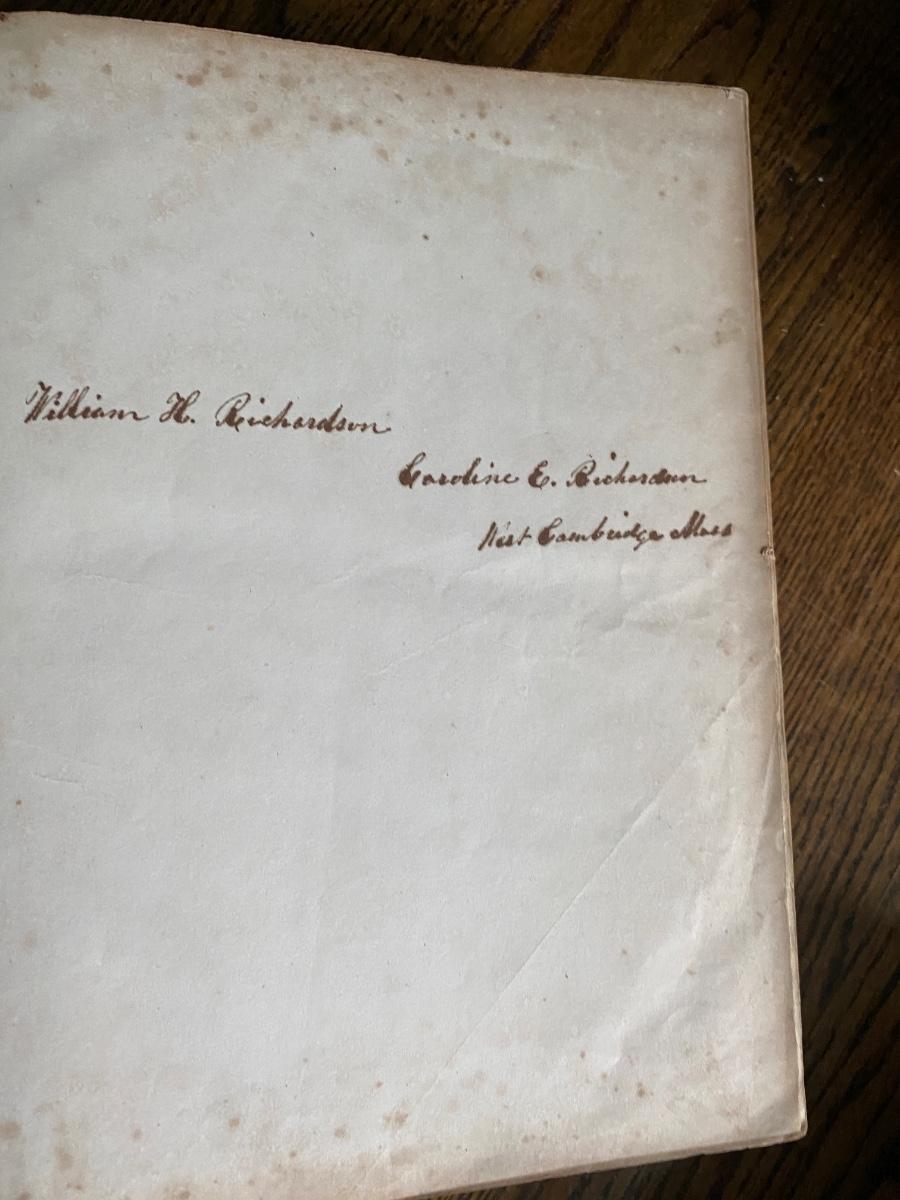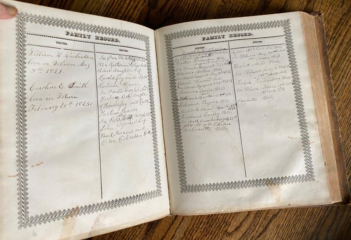 Wonderful old 1845 bible of William Harris Richardson of Woburn Mass and his wife Caroline Elizabeth Smith of Winchester . Great resource for genealogy of the the Richardson family with 8 pages of family data all the way through marriage of granddaughter Helen Richardson Squire to Paul Francis Kerr, noted geologist.