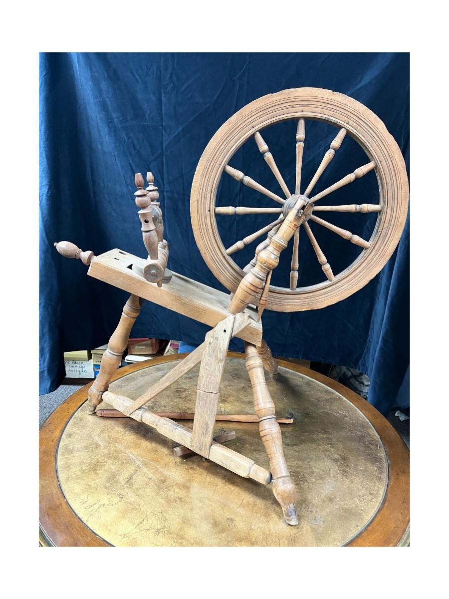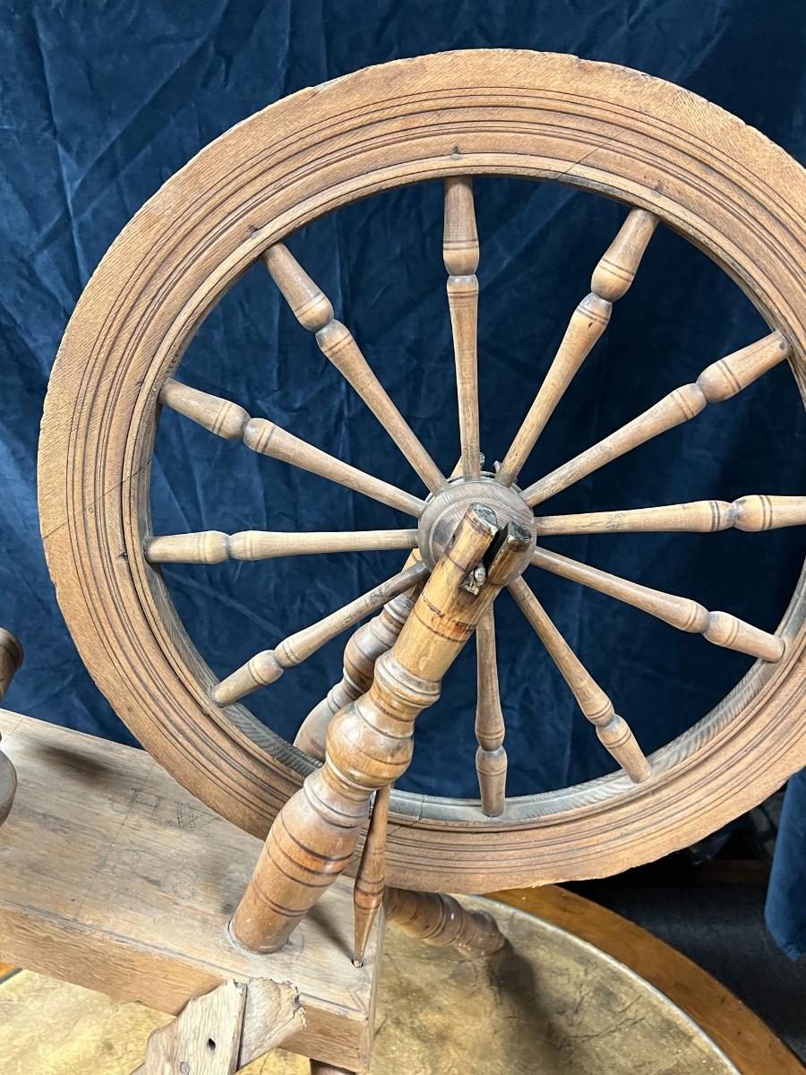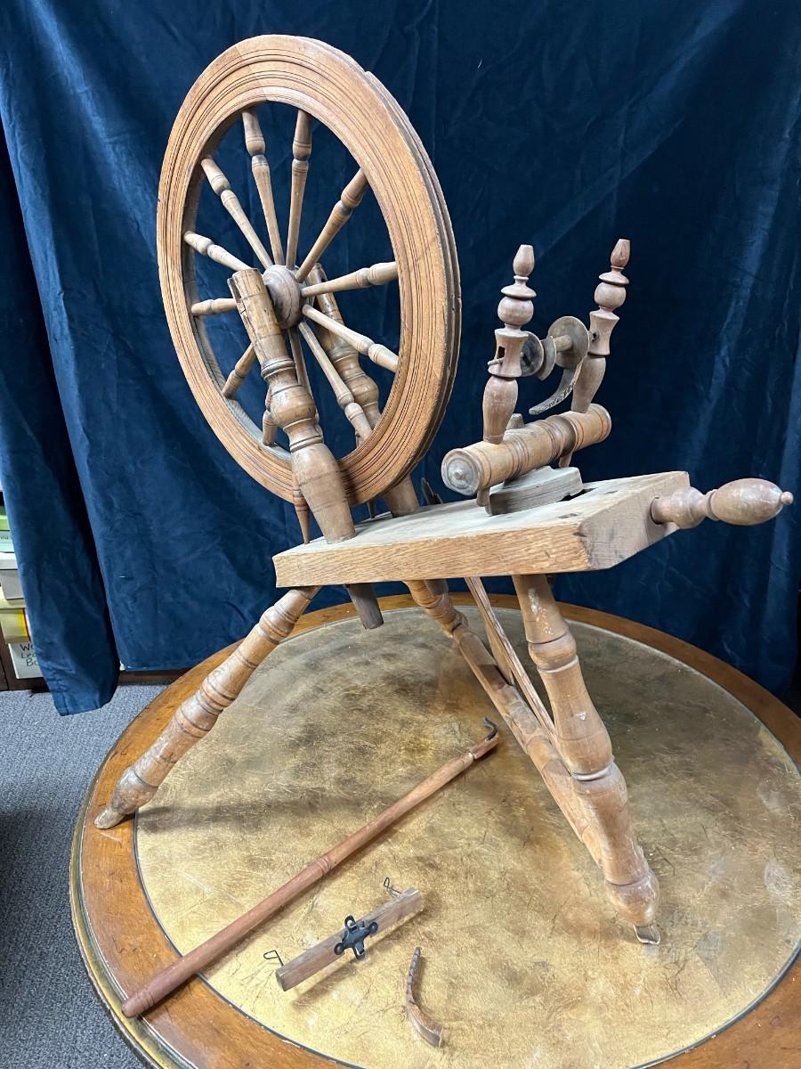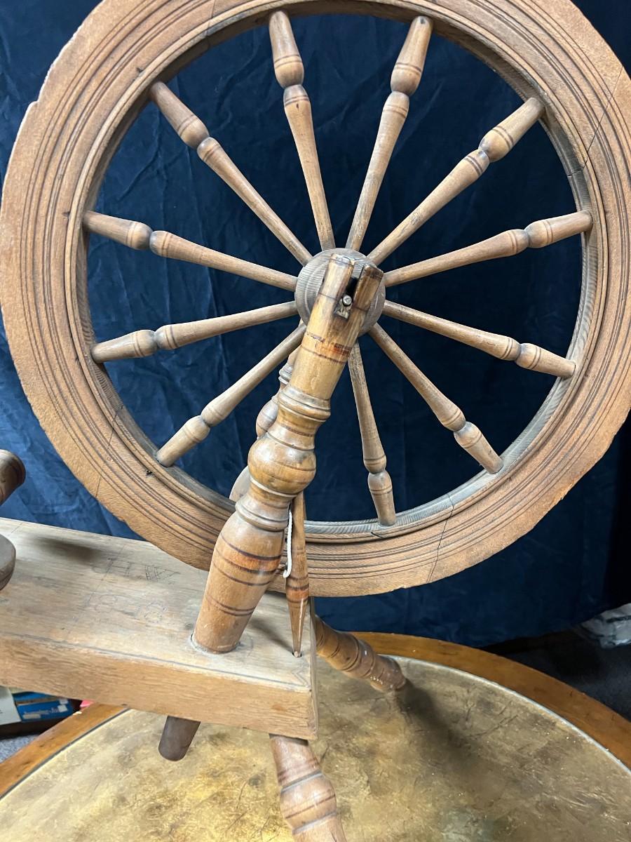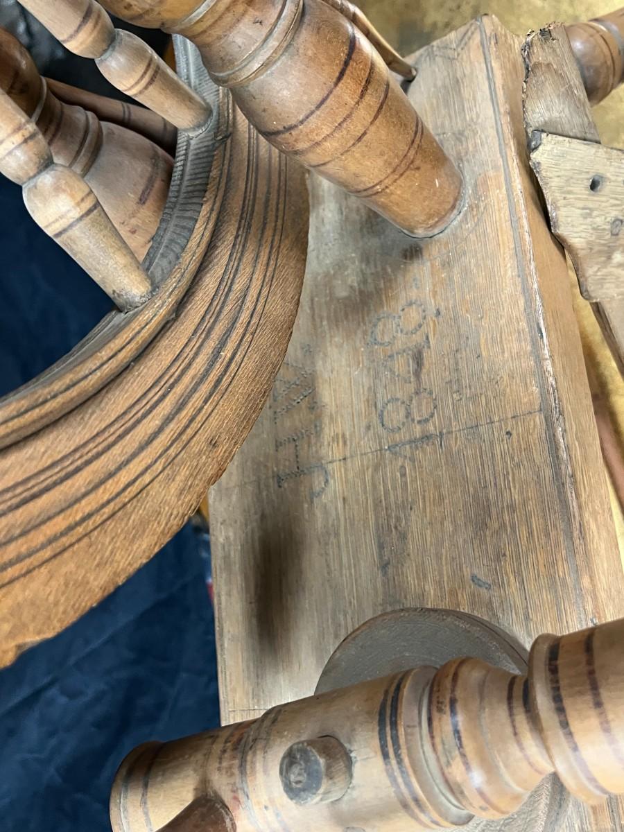 Antique 1848 Wood Spinning Wheel. In good antique condition. Marked "H.W. 1848" on the top. You can see faint design on the pieces, but most has worn away. Looks to be complete but there is a broken piece that needs to be repaired. See photos. Displays nicely.