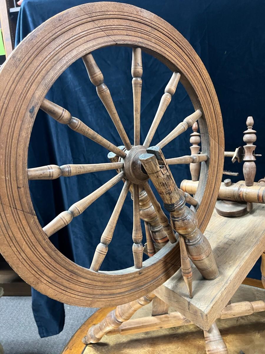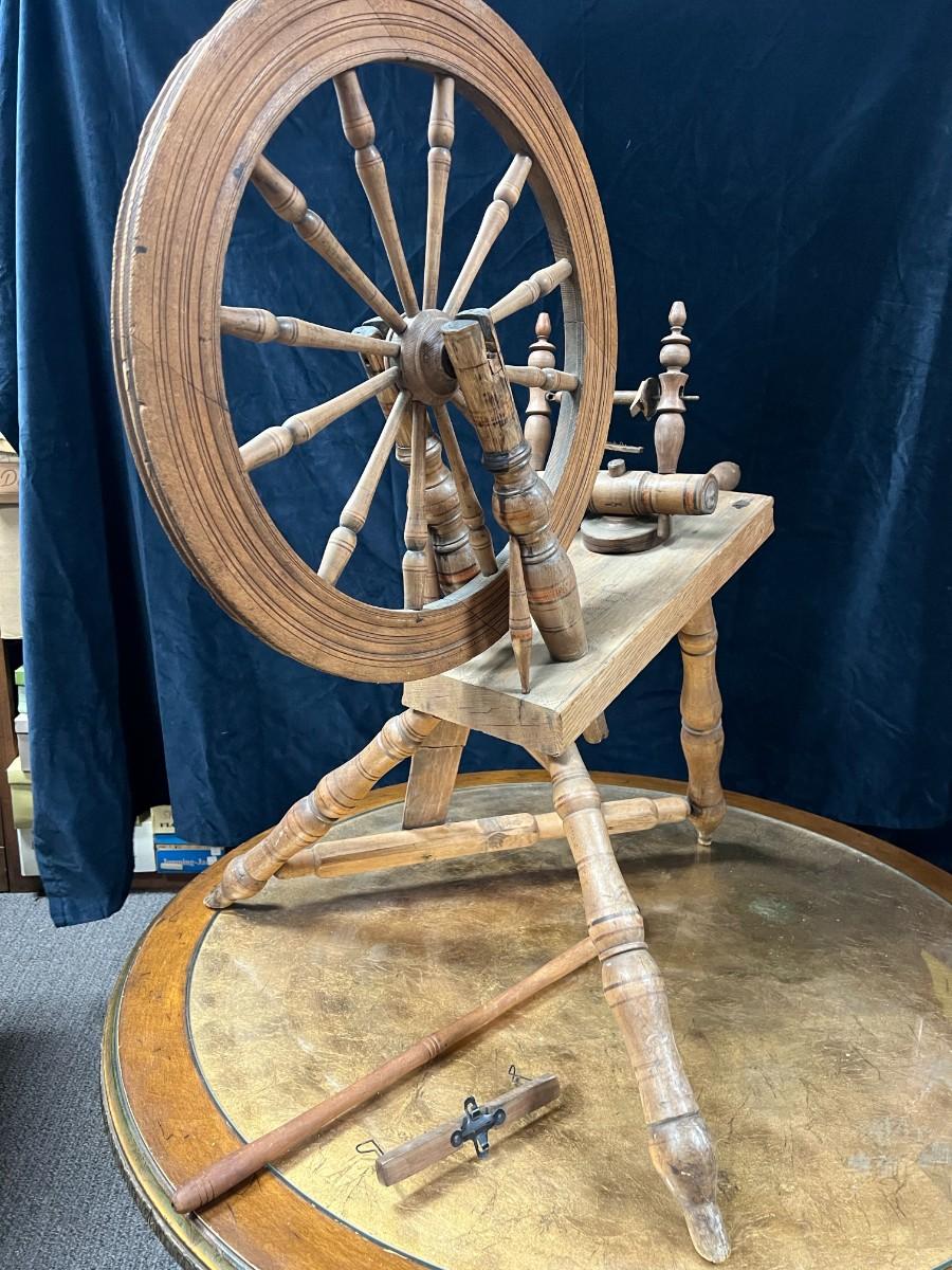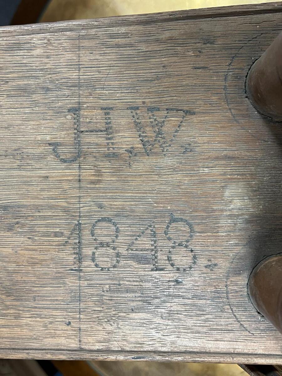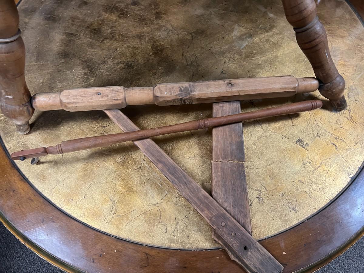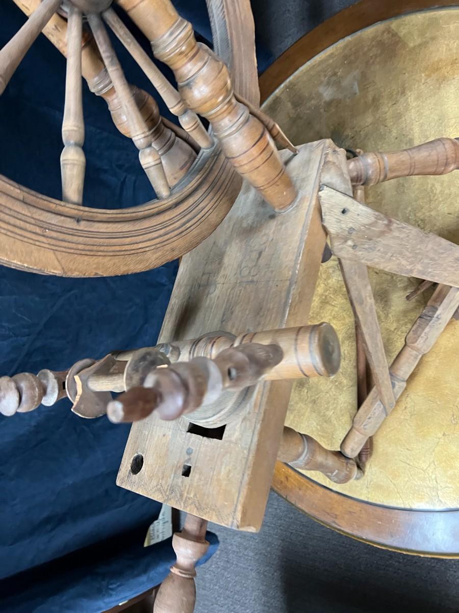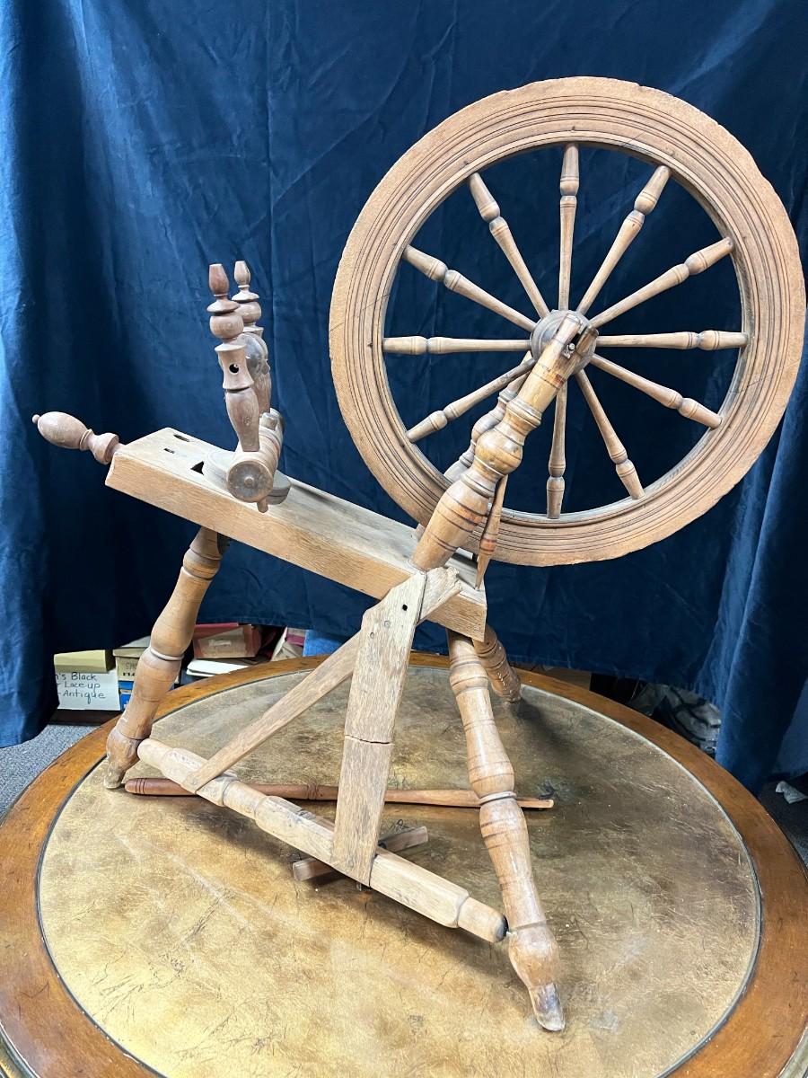 Antique 1848 Wood Spinning Wheel. In good antique condition. Marked "H.W. 1848" on the top. You can see faint design on the pieces, but most has worn away. Looks to be complete but there is a broken piece that needs to be repaired. See photos. Displays nicely.