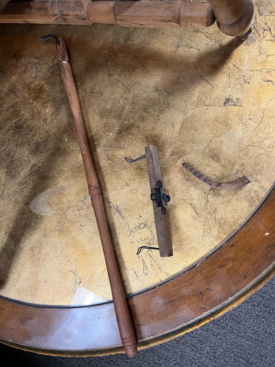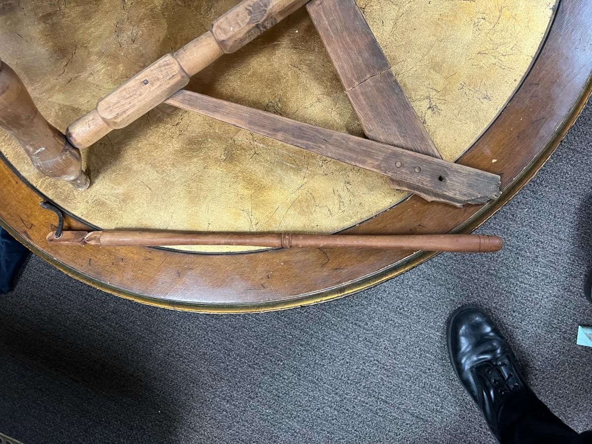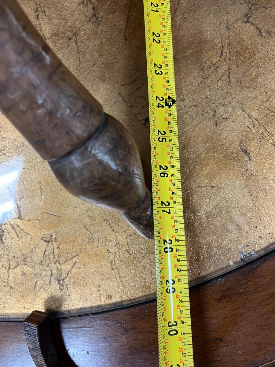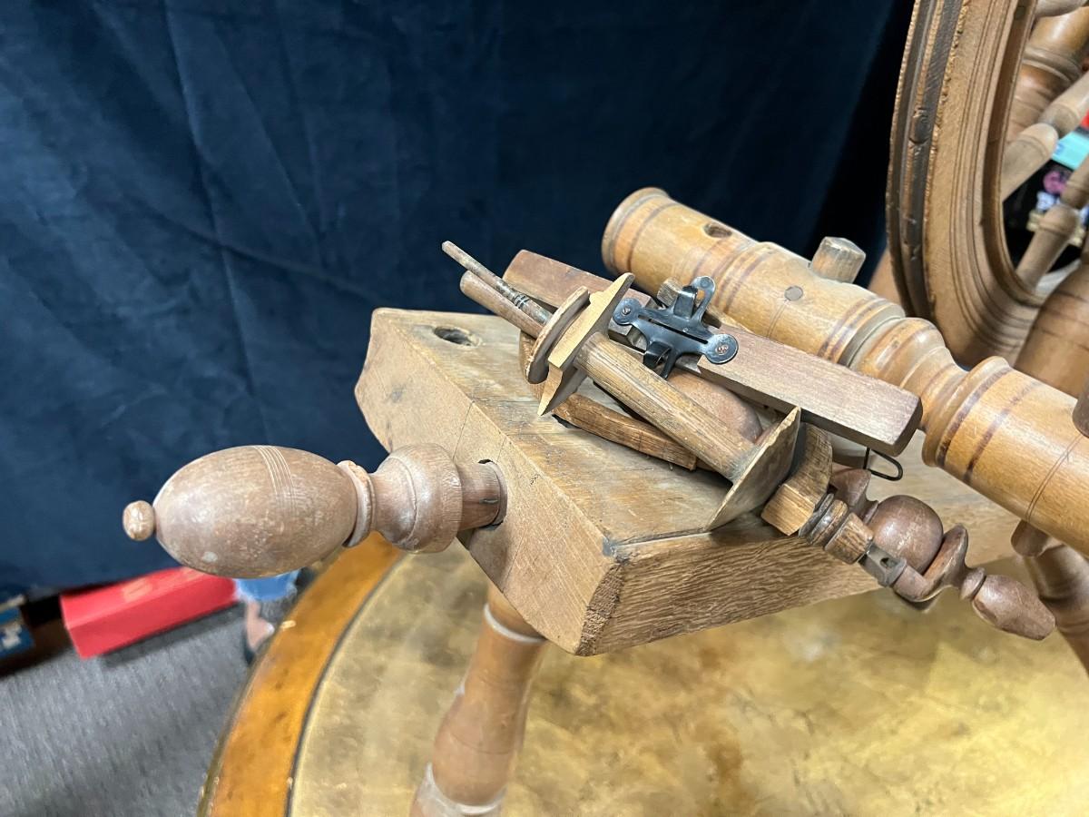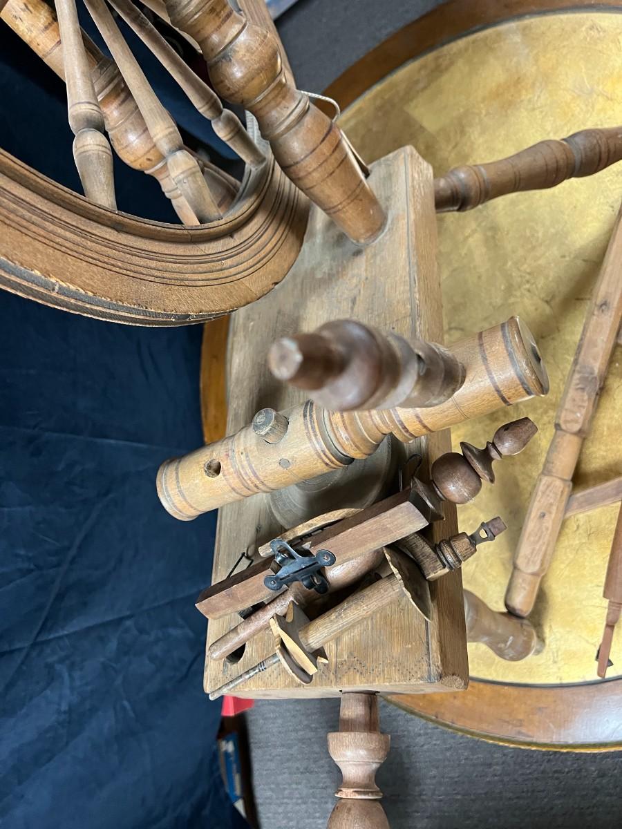 Antique 1848 Wood Spinning Wheel. In good antique condition. Marked "H.W. 1848" on the top. You can see faint design on the pieces, but most has worn away. Looks to be complete but there is a broken piece that needs to be repaired. See photos. Displays nicely.
