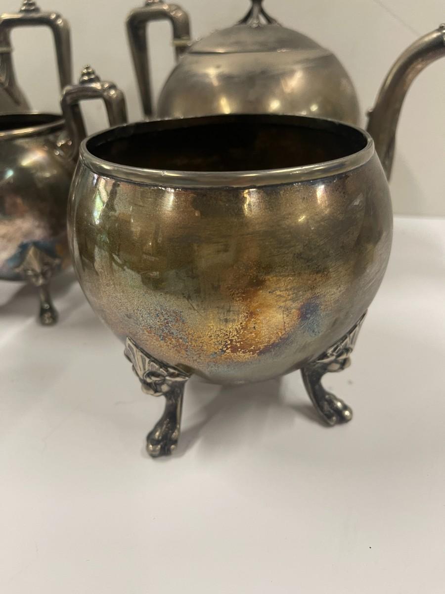 Antique 1870's Reed & Barton 5 piece silver plate tea set. Set includes tea pot, chocolate pot, creamer, sugar and waste bowl. Coffee pot is missing. Please examine photos carefully for condition.