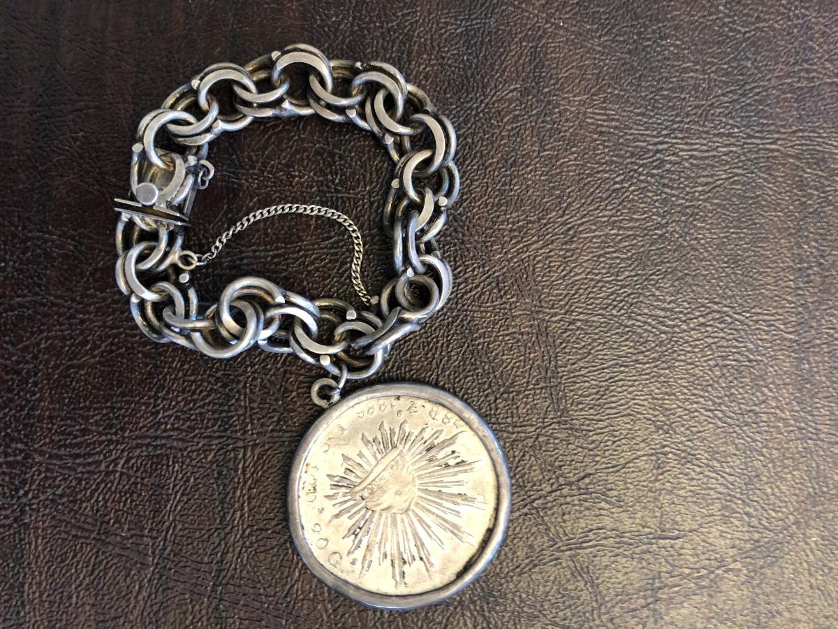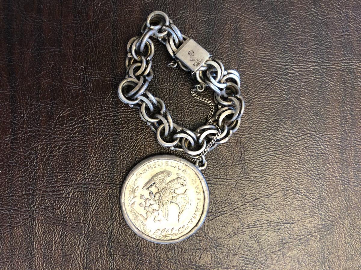 ANTIQUE 1886 8 REALES MEXICAN LIBERTAD STERLING SILVER BRACELET