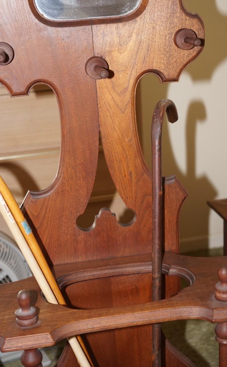 The center has an opening to rest the canes (antique cane collectors take note of this piece to display your collection) the lower part of the stand has a place where the canes rest to hold them in place. This is a very sturdy well make piece. It has the natural finish and is in very good condition. The base has a depth of 13" and stands well against a wall