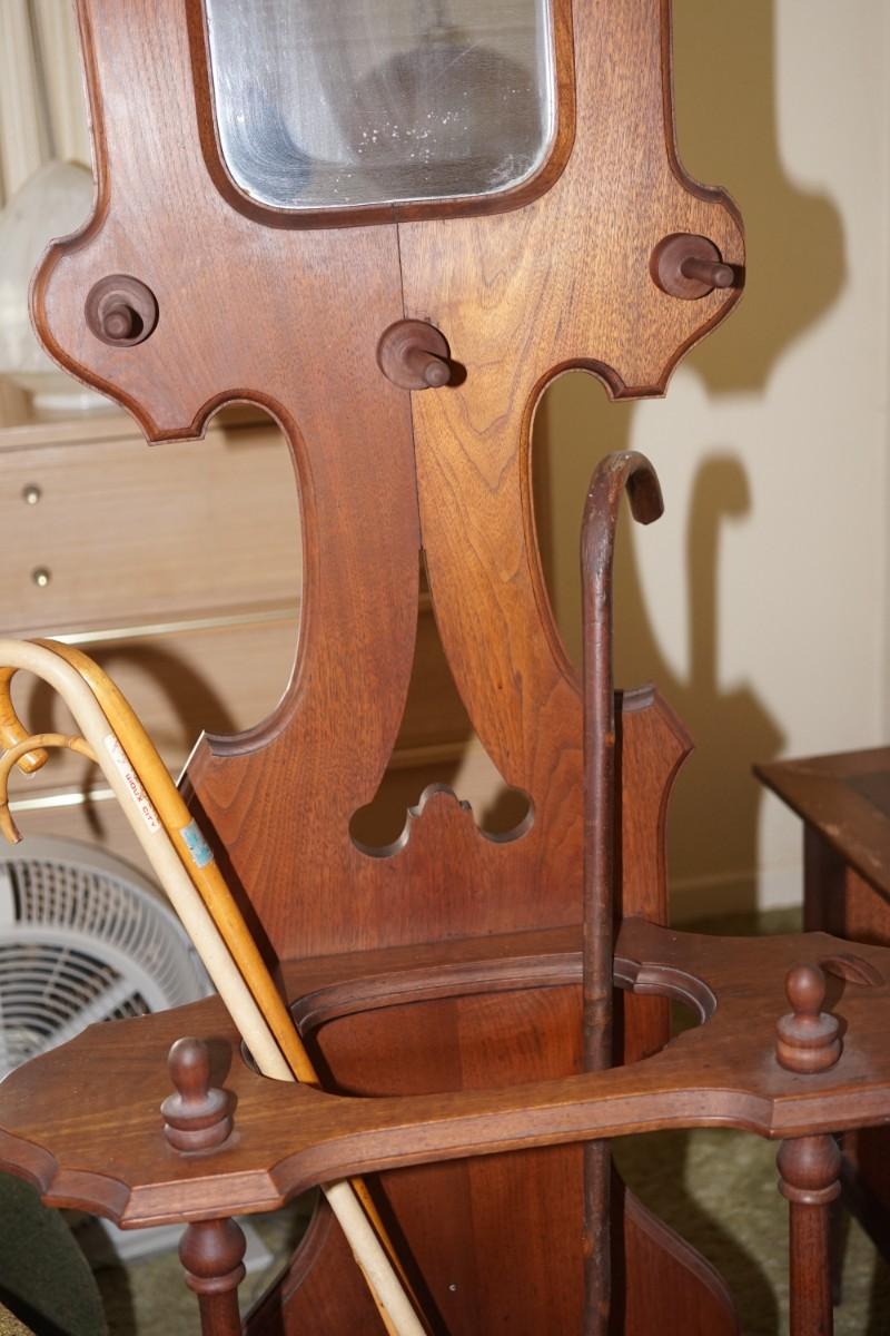 this is an antique can and umbrella stand with a mirror. Nicely turned post accents and scroll cut out centers.