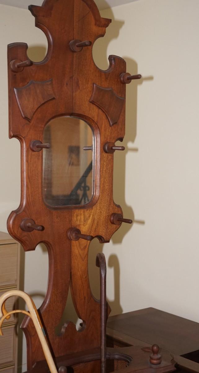 It has a decorative crown top, original mirror that has four pegs around to hang your hat.