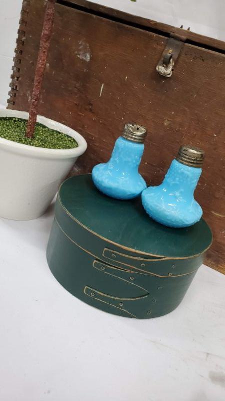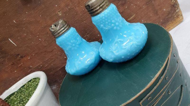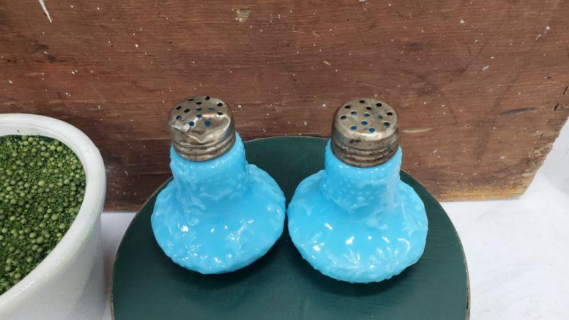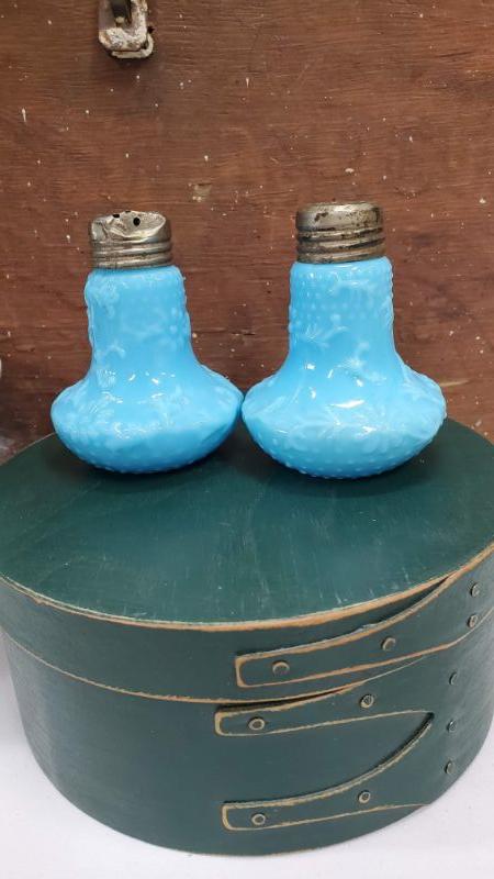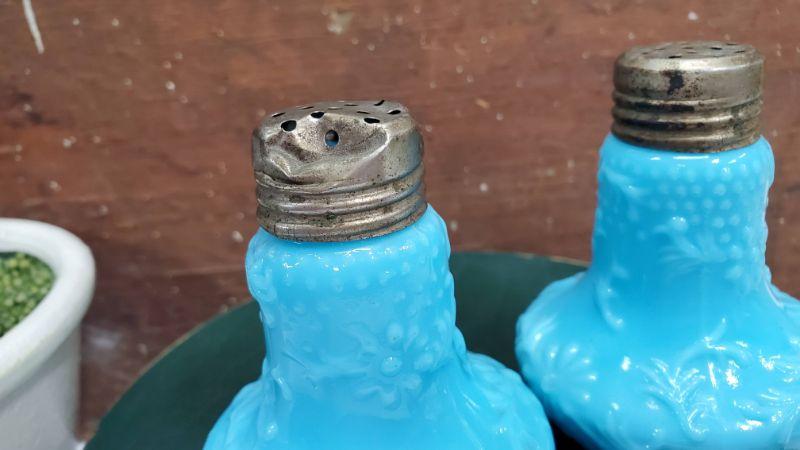 Antique 1898 Dithridge Beaded Bottom Blue Opaque Salt & Pepper Shakers, VIntage
