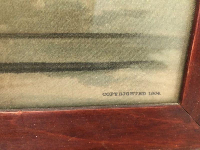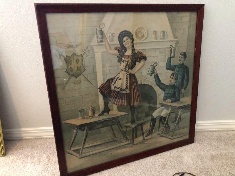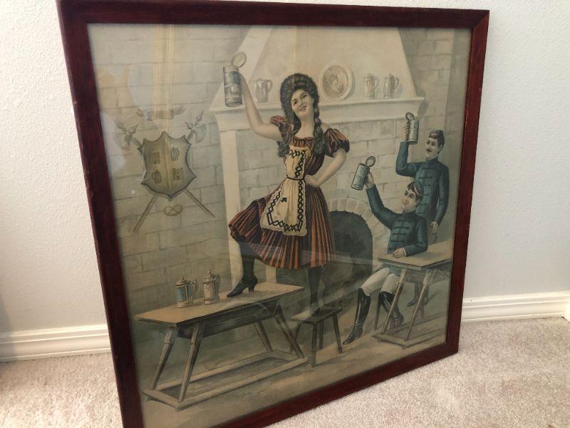 Fantastic antique poster, copyright 1904. Features a Bier Garden hall scene, with a beer maiden and two soldiers having a great time and cheers. In good condition.