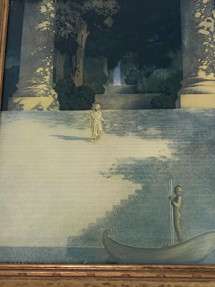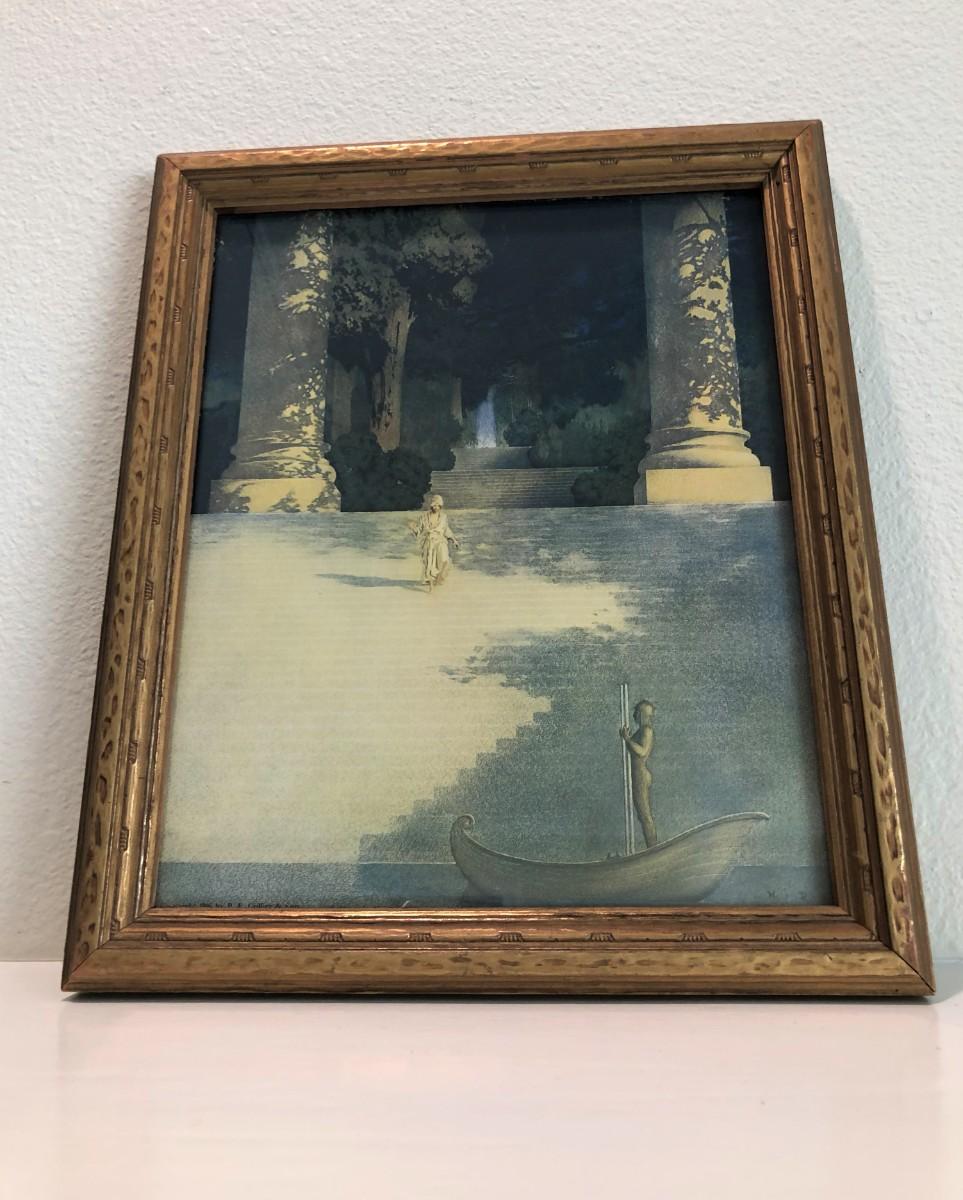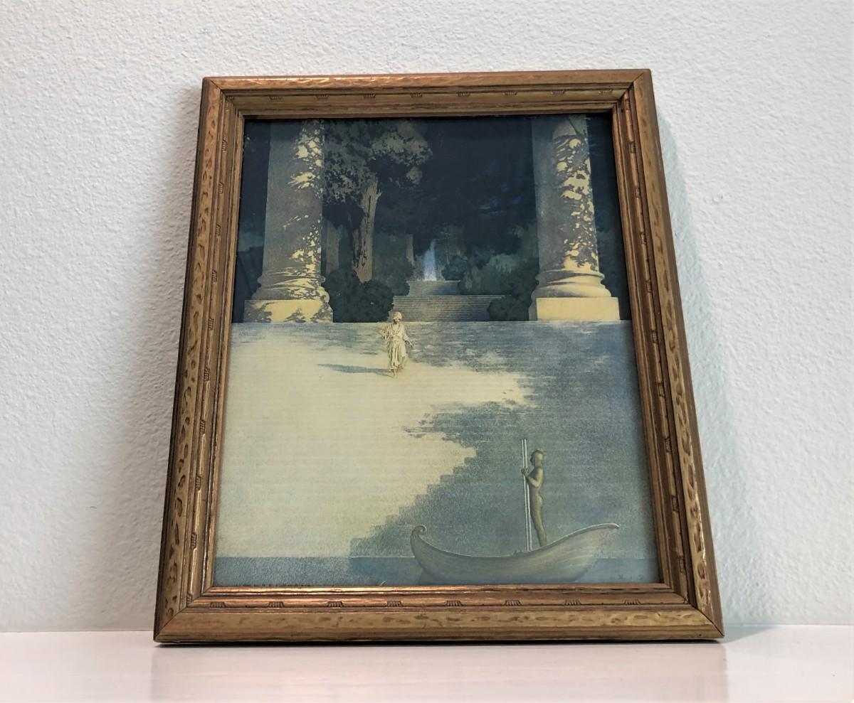 Great framed print of "Landing of the Brazen Boatman" by Maxfield Parrish circa 1909 in antique frame. In very good condition.
