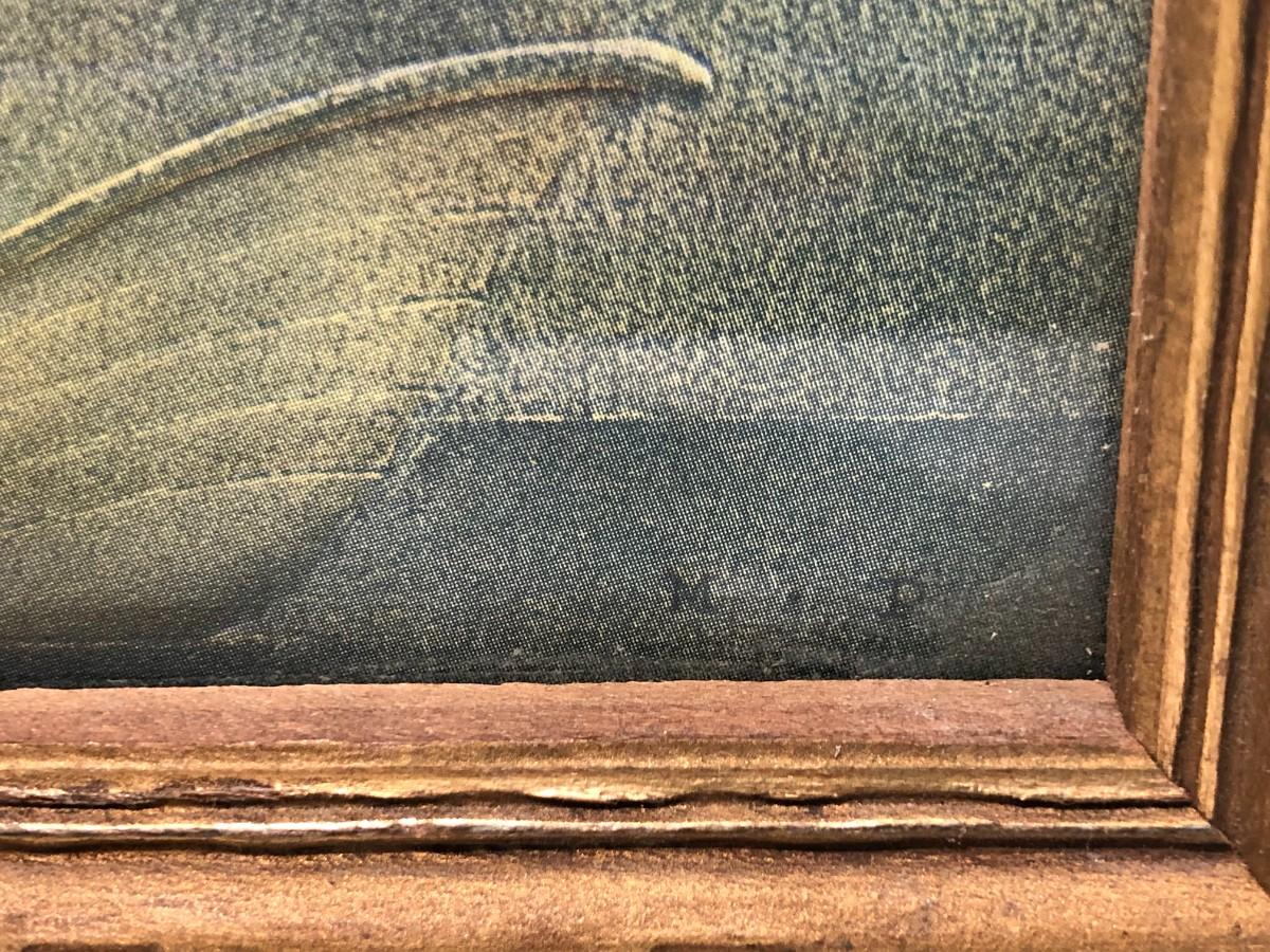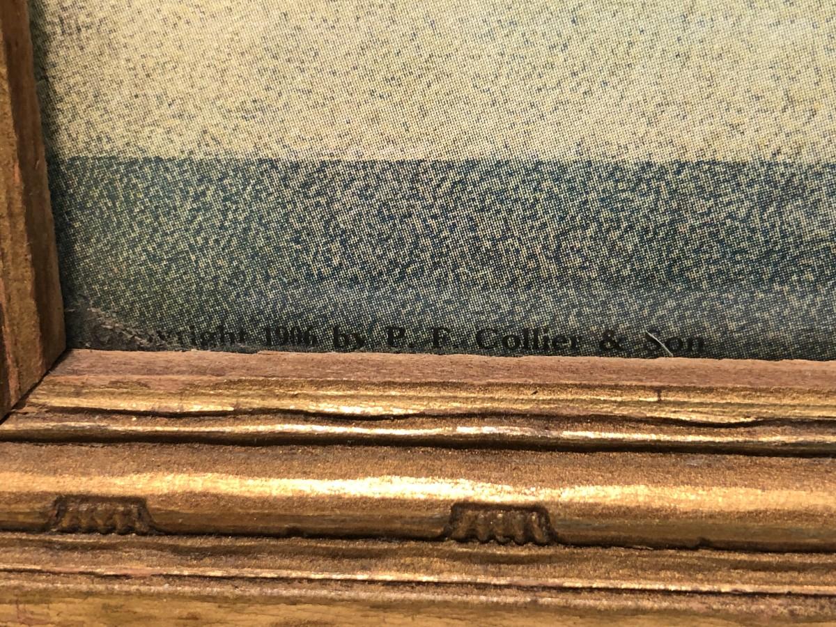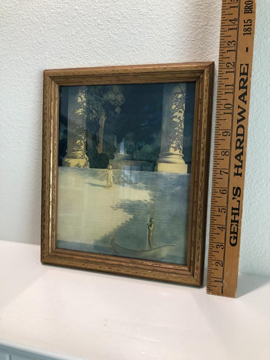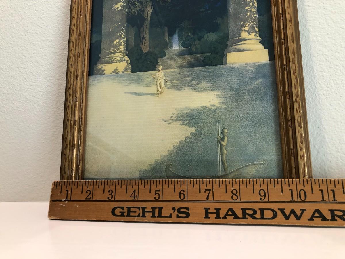 Great framed print of "Landing of the Brazen Boatman" by Maxfield Parrish circa 1909 in antique frame. In very good condition.