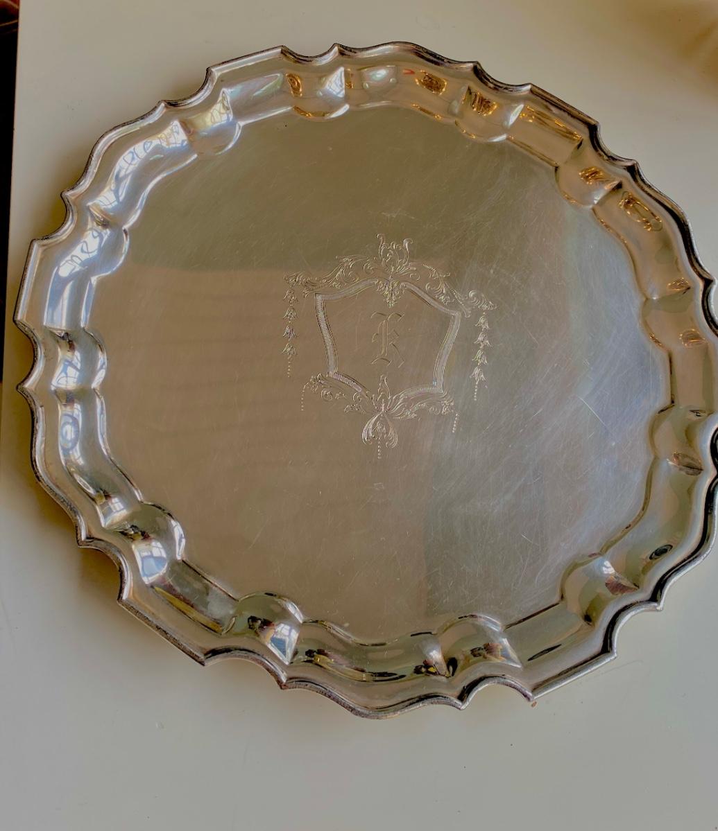 Stunning 1924 heavy Sheffield silverplate serving tray by Lawrence B. Smith with nice pie crust raised rim Chippendale edge shape, center engraved cartouche with hanging swags. Three bun feet. 11.5 x 11.5”