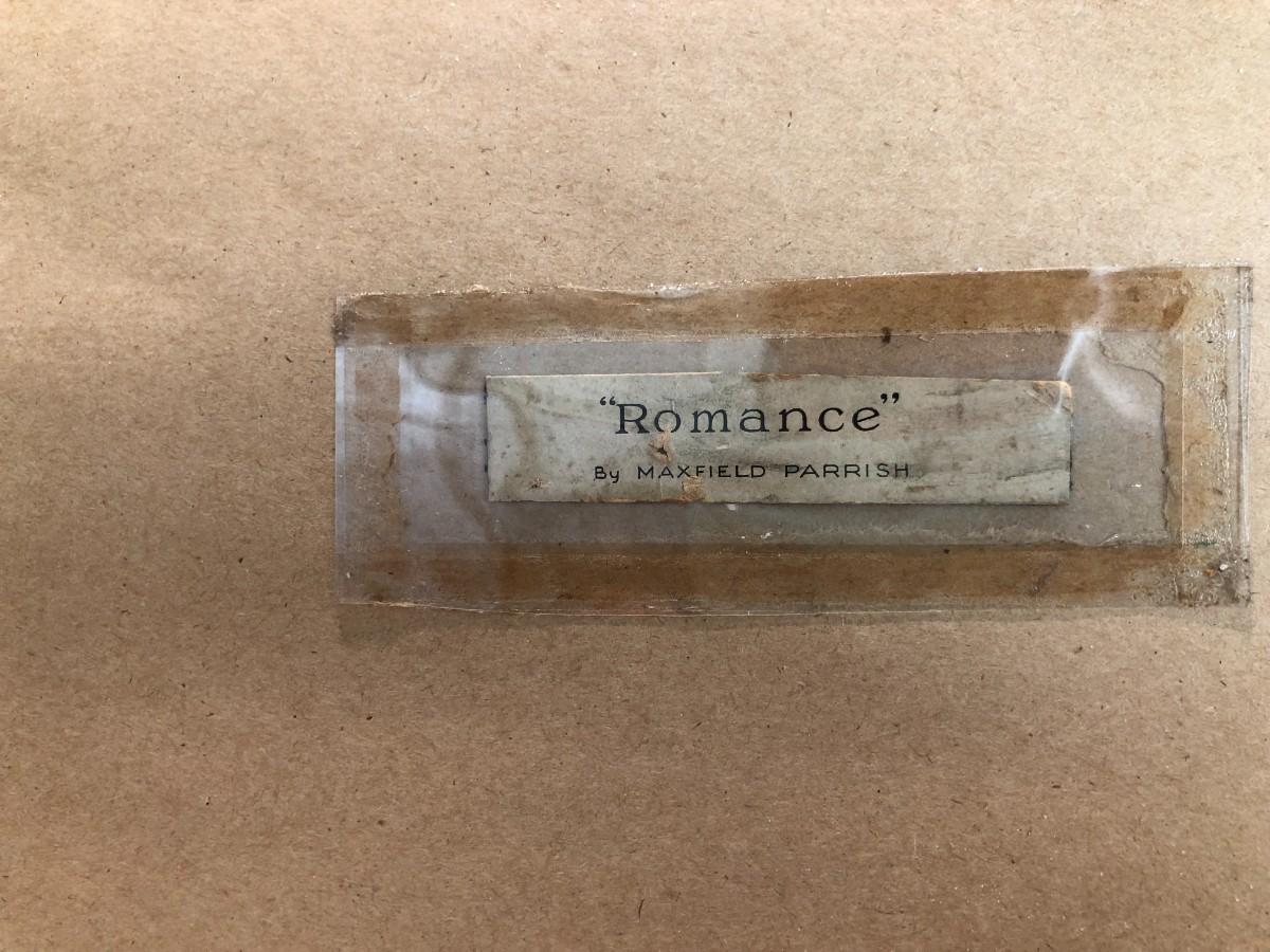 Beautiful antique lithograph print of 1925 "Romance" by Maxfield Parrish. In very good condition. Great antique pie crust frame.