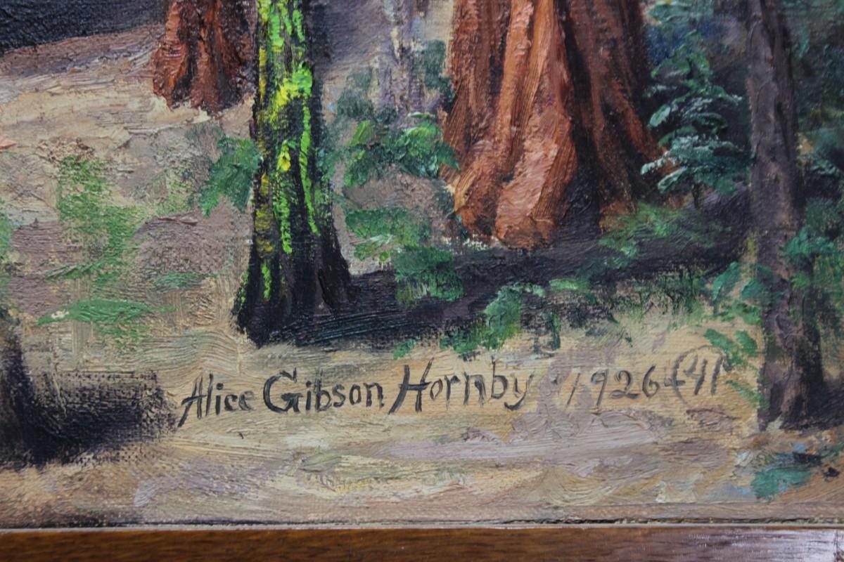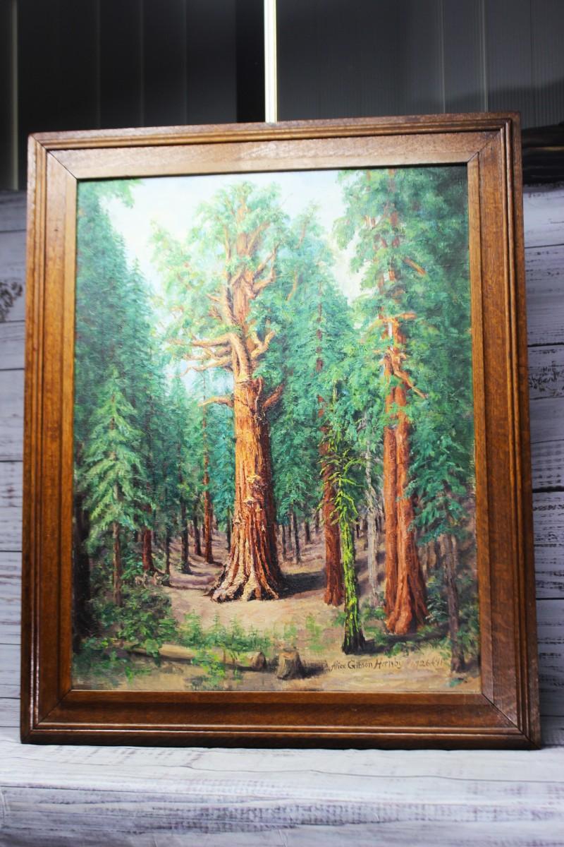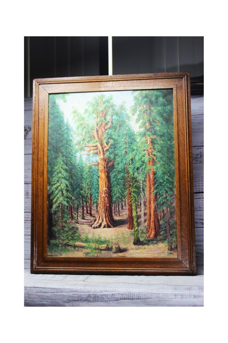 Antique 1926 Original Sequoia Redwood Tree Landscape Painting by Alice Gibson Hornby, there is no damage to the frame or the canvas and is in very good condition. The colors on the canvas are still vibrant and colorful, check pictures for more details and for sizing.
