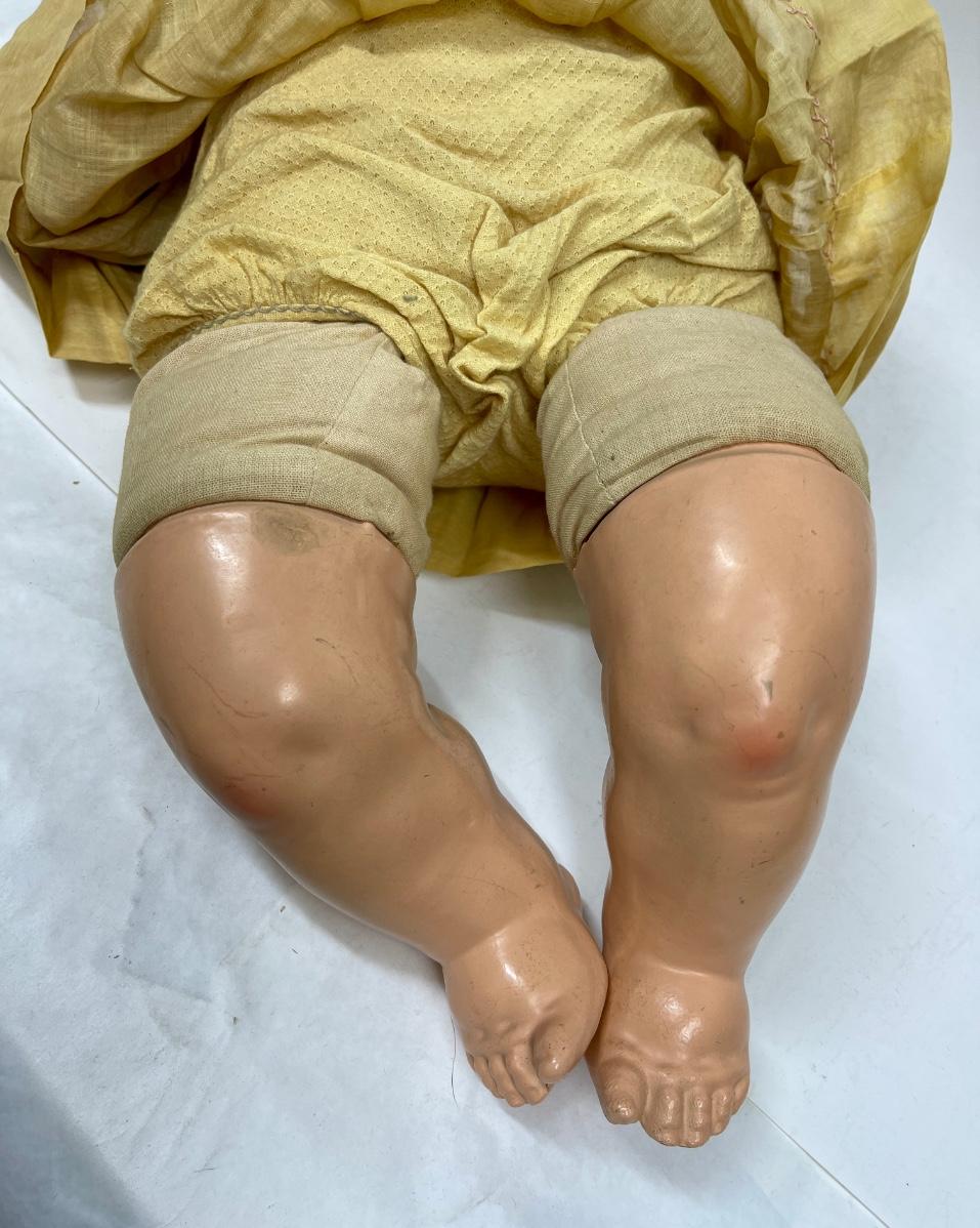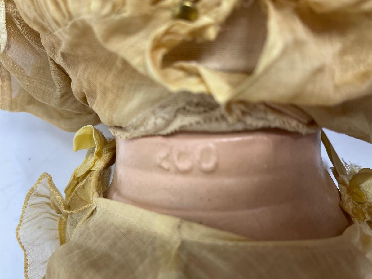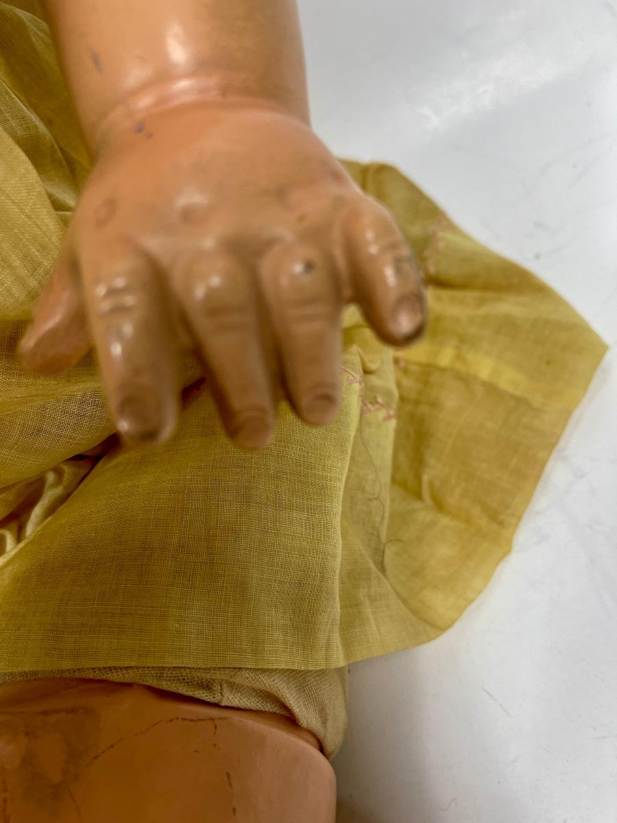 In fair to good condition, please refer two pictures since I am not a doll expert. Her eyes look painted two different colors and they roll slightly side to side when you tip her head. The eyes do not have eyelashes but you can see faint painted eyelashes. Mouth is missing some paint and it appears that she has 4 teeth. The back of her neck says "300.