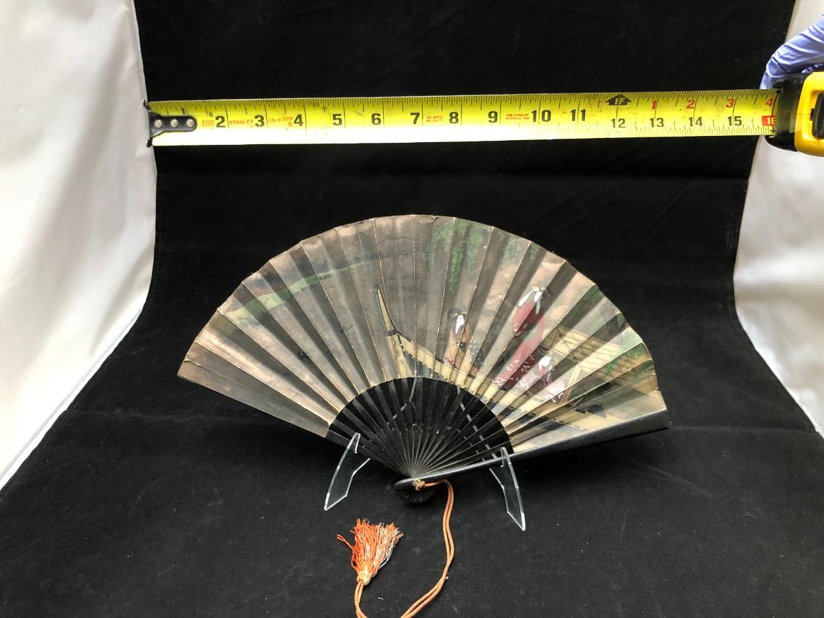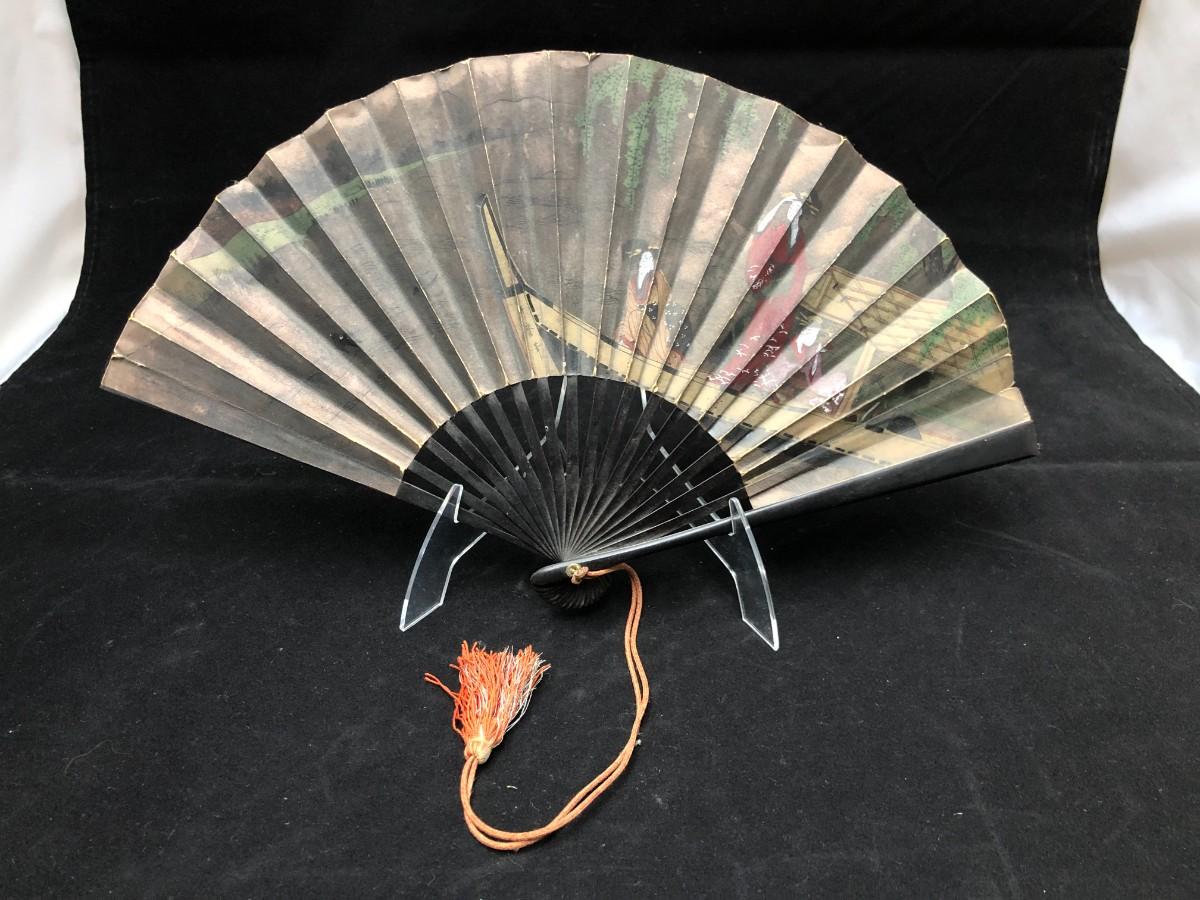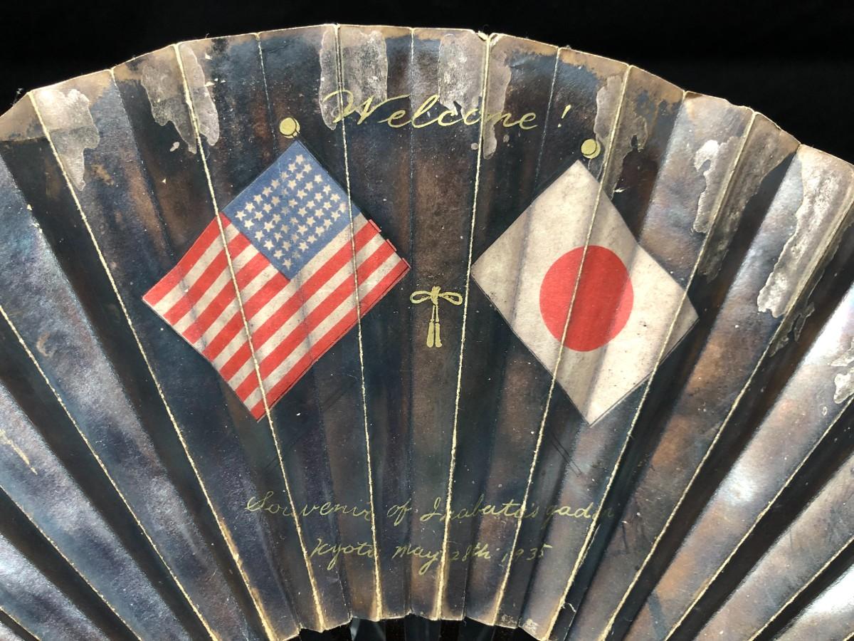 Fantastic piece of history- a 1935 souvenir fan featuring the US and Japan flags and Geishas on a boat. In good condition.