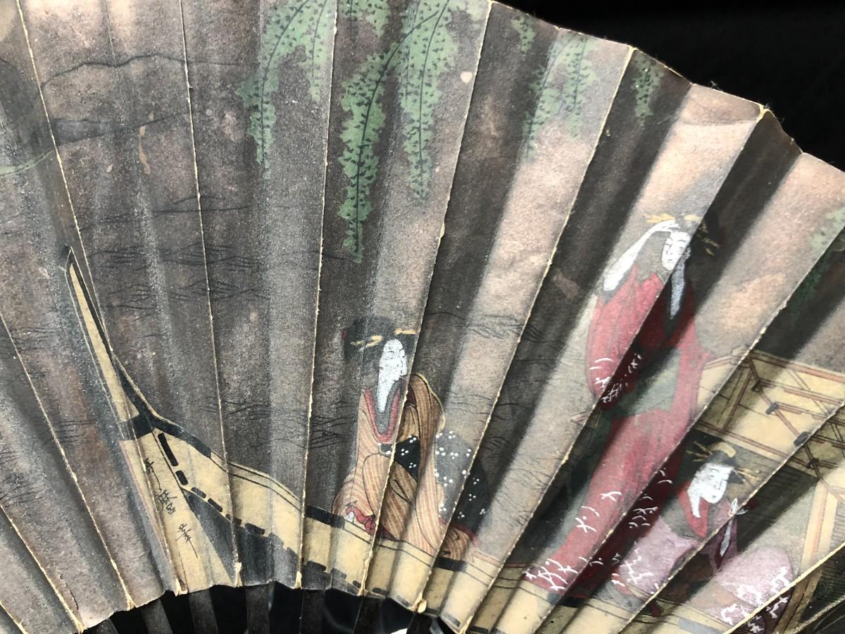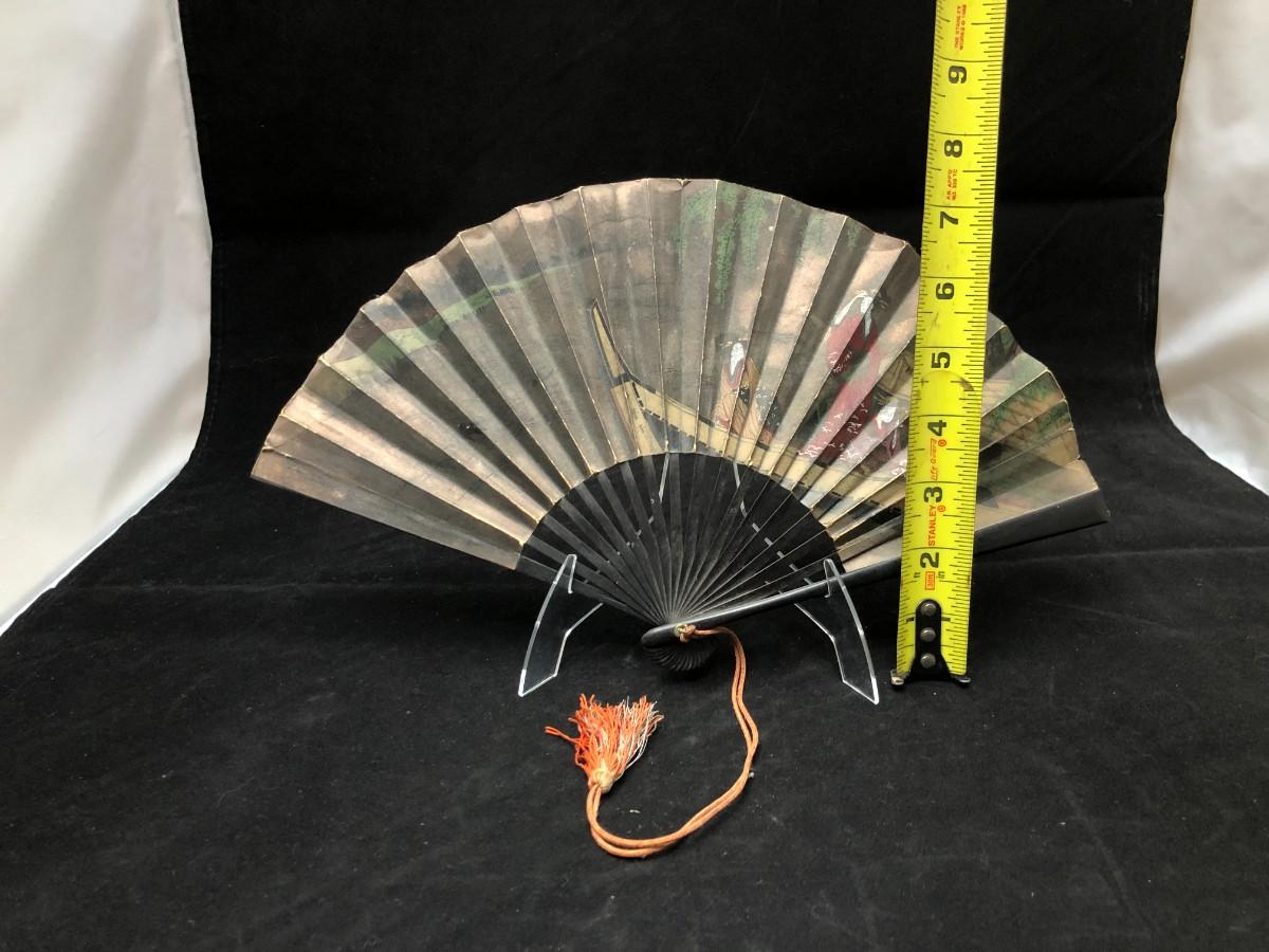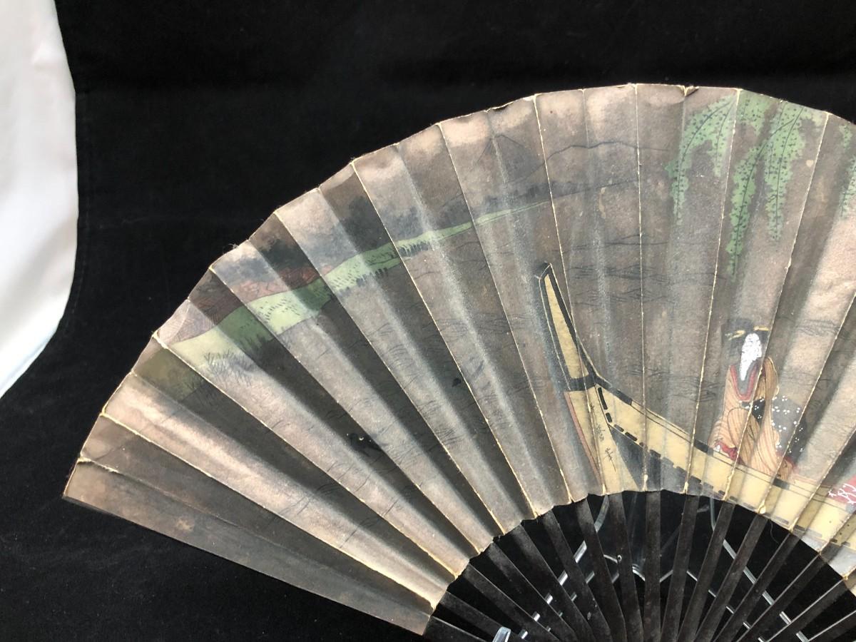 Fantastic piece of history- a 1935 souvenir fan featuring the US and Japan flags and Geishas on a boat. In good condition.