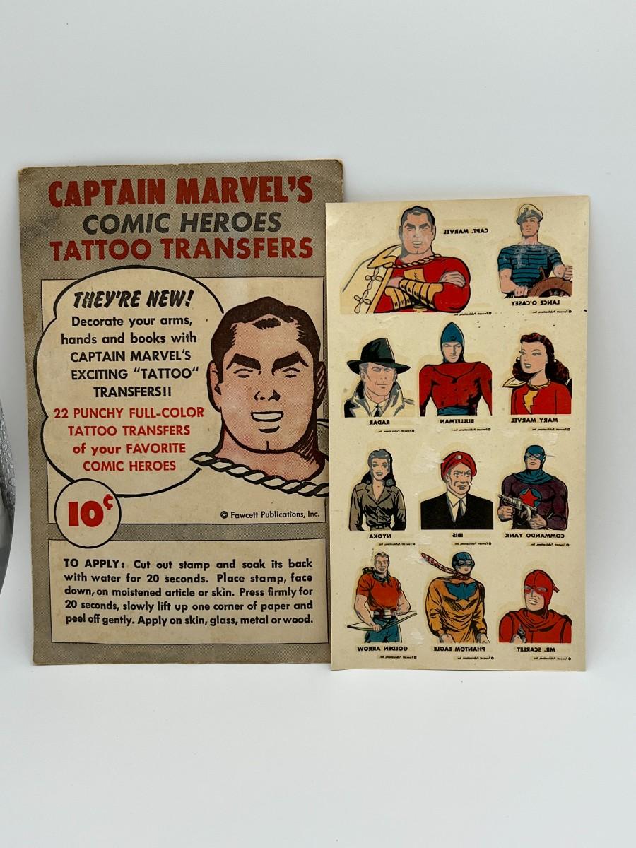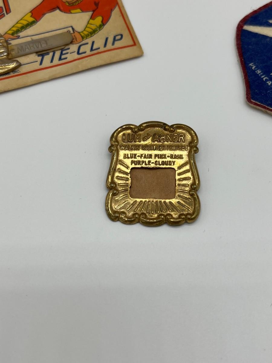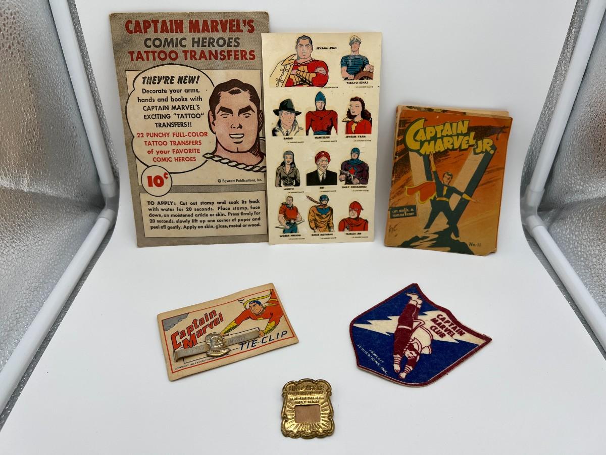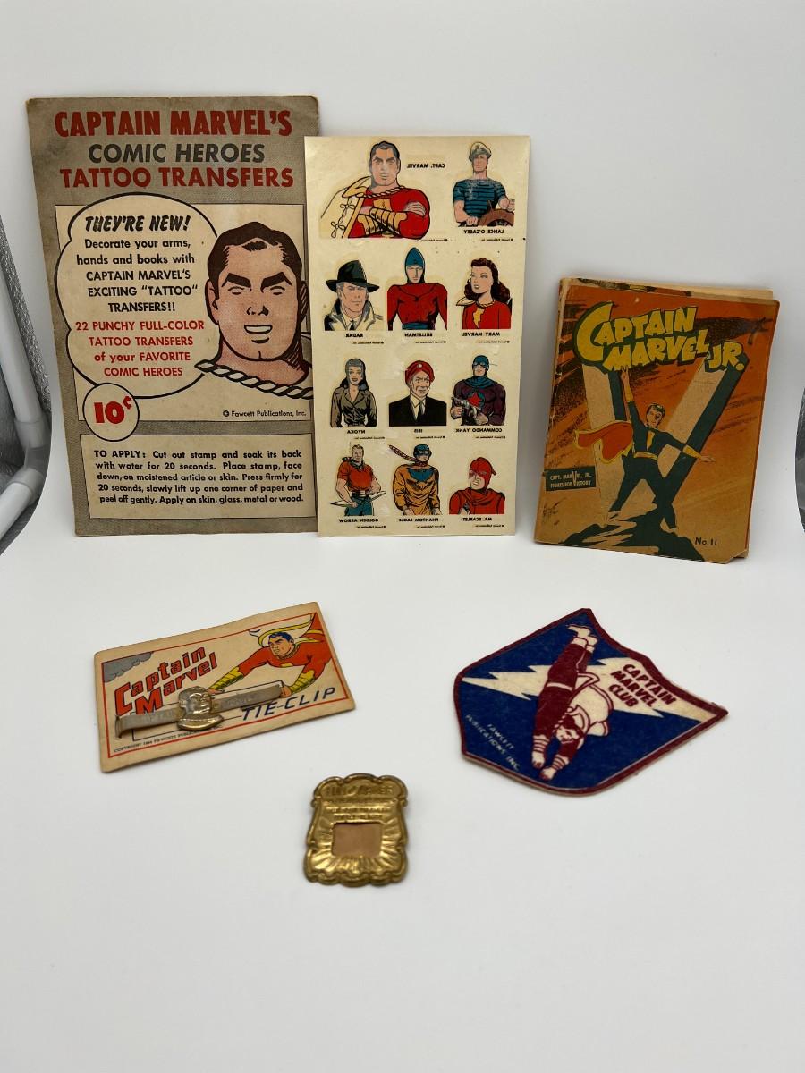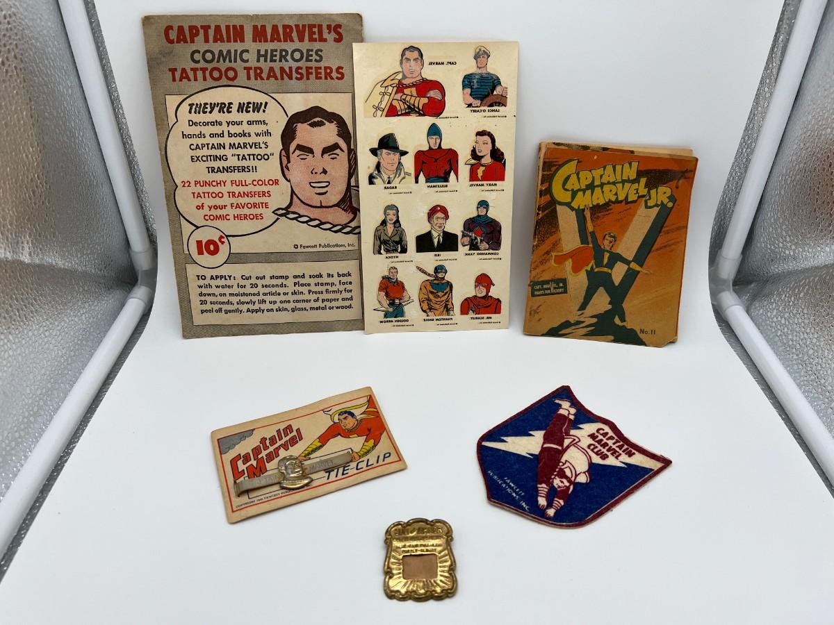 Antique 1940s Captain Marvel Collectibles Ephemera and Pins. Lot includes Captain Marvel's Comic Heroes Tattoo Transfers, Captain Marvel tie clip, Captain Marvel Club Shield Patch, Lum and Abner Walkin Weather Prophet pin, and 1946 Captain Marvel Jr No. 11 comic book. Conditions as shown.