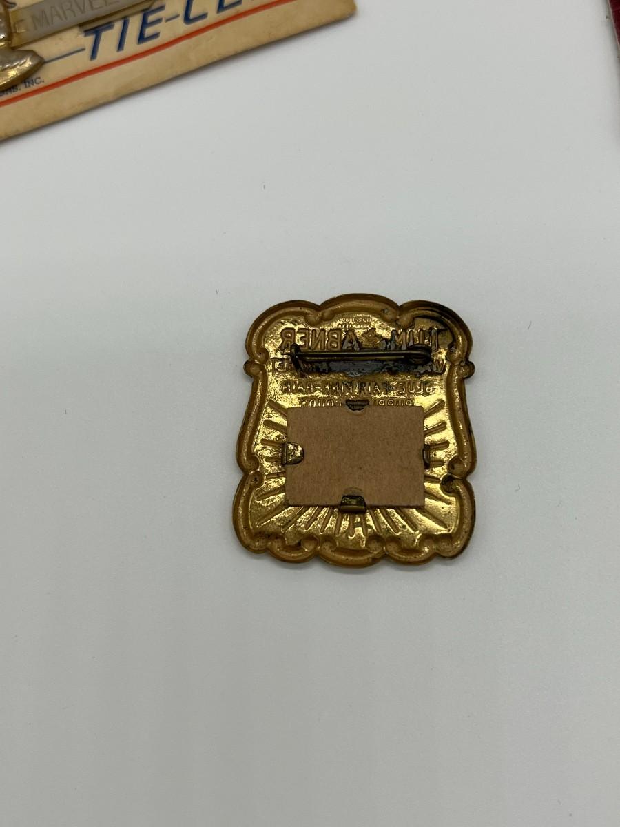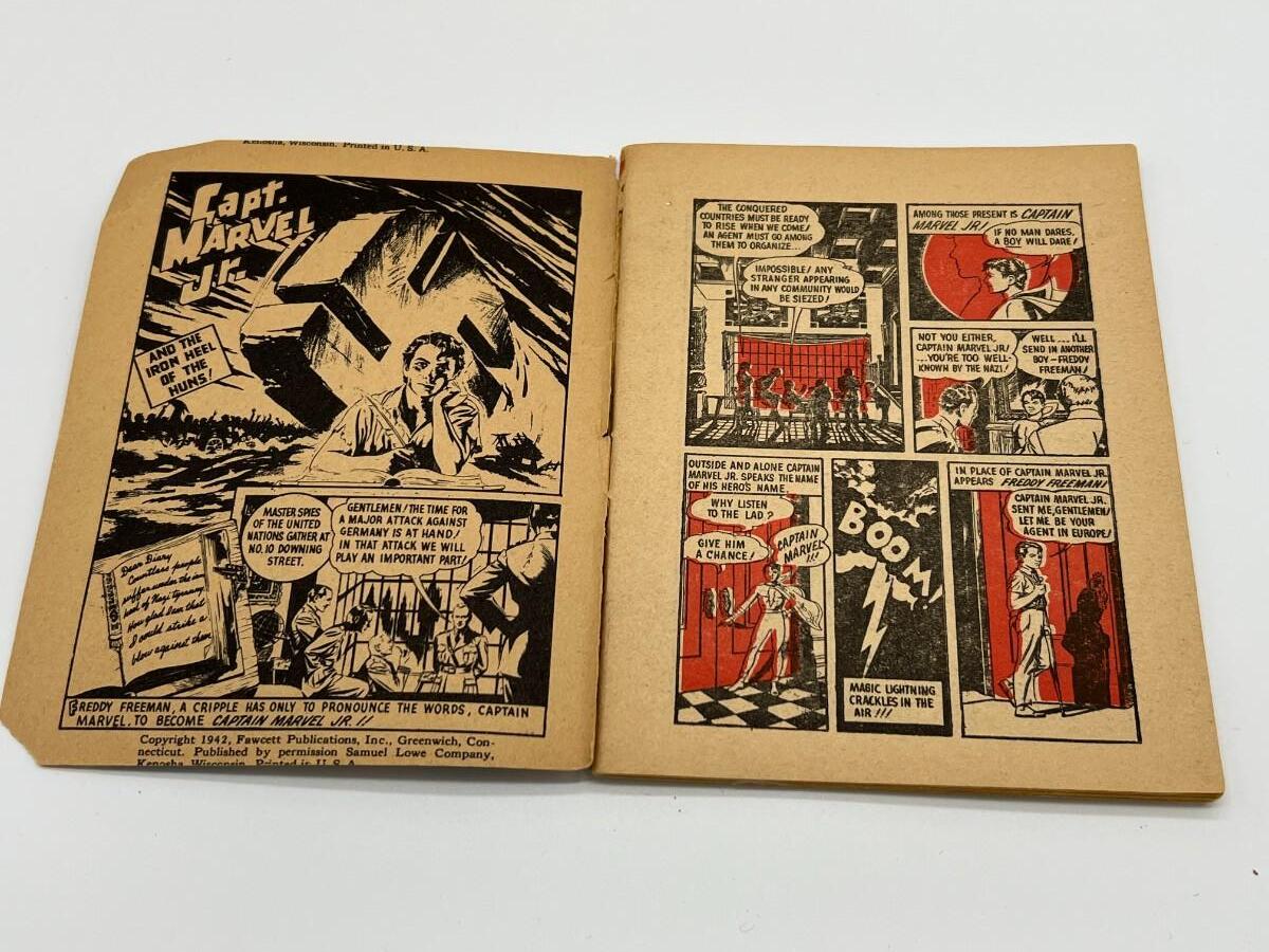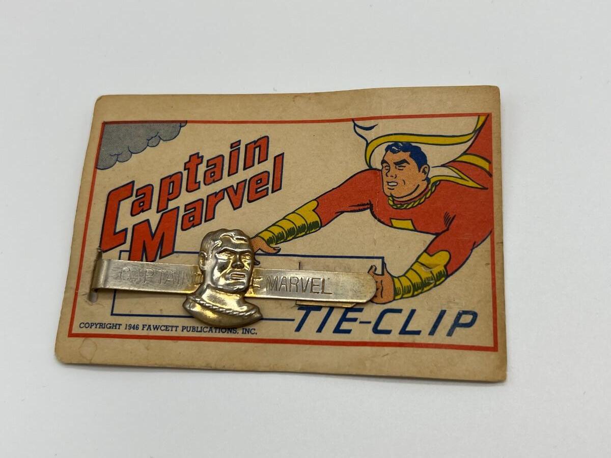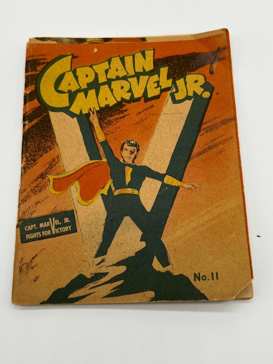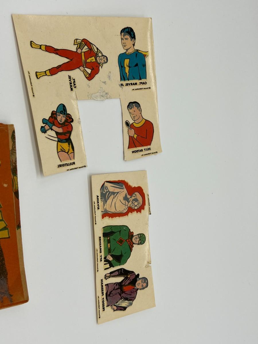 Antique 1940s Captain Marvel Collectibles Ephemera and Pins. Lot includes Captain Marvel's Comic Heroes Tattoo Transfers, Captain Marvel tie clip, Captain Marvel Club Shield Patch, Lum and Abner Walkin Weather Prophet pin, and 1946 Captain Marvel Jr No. 11 comic book. Conditions as shown.