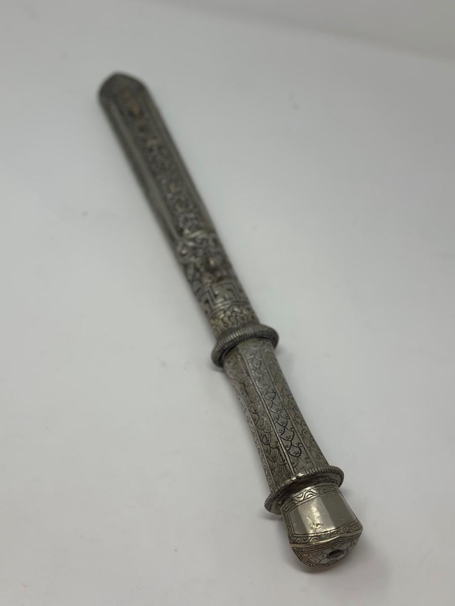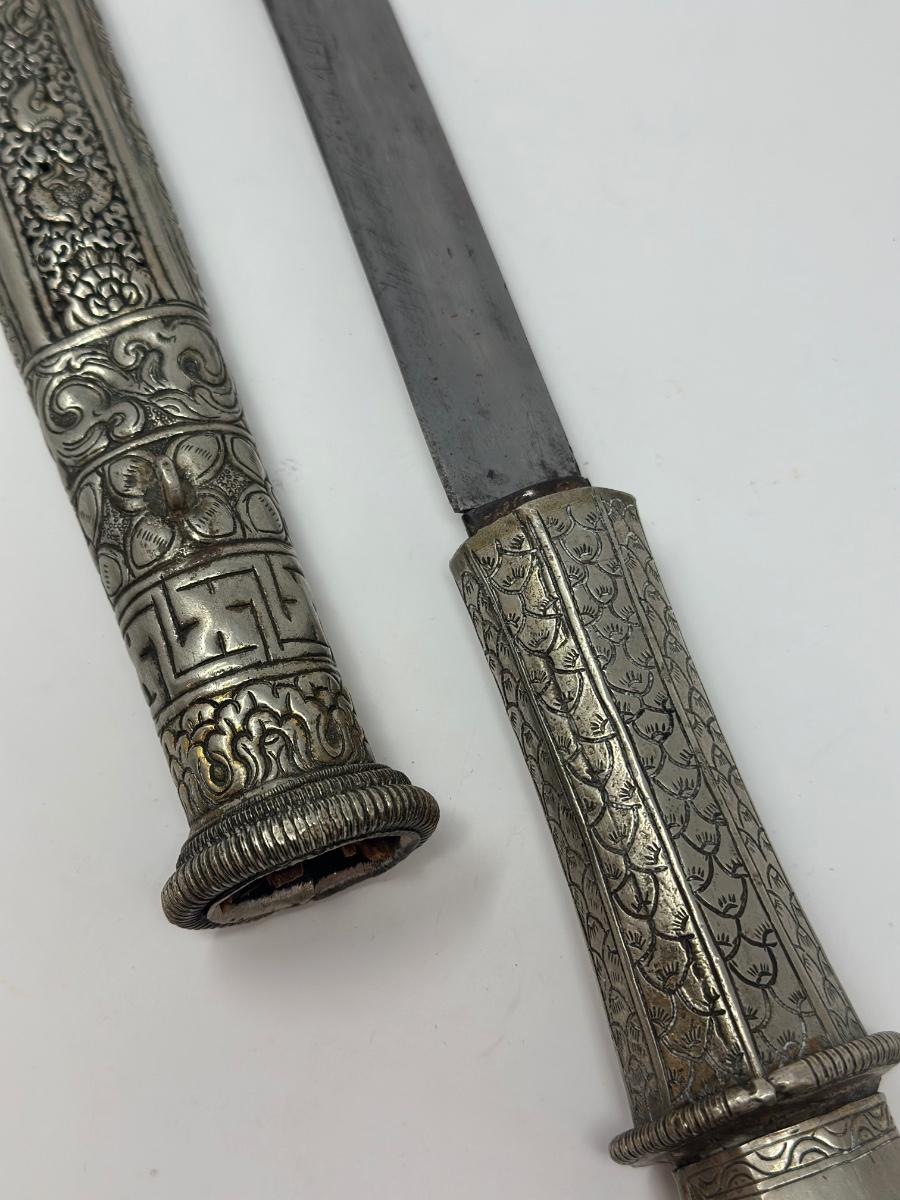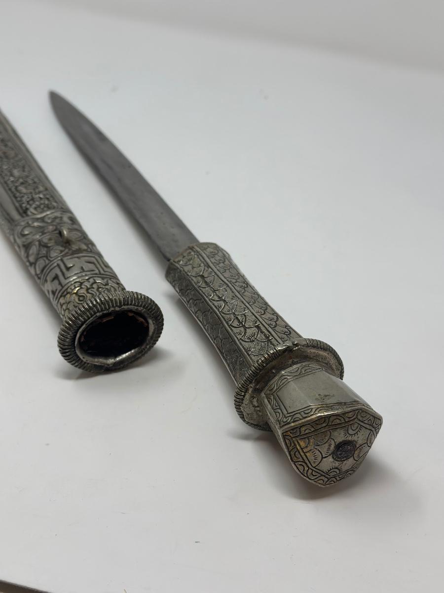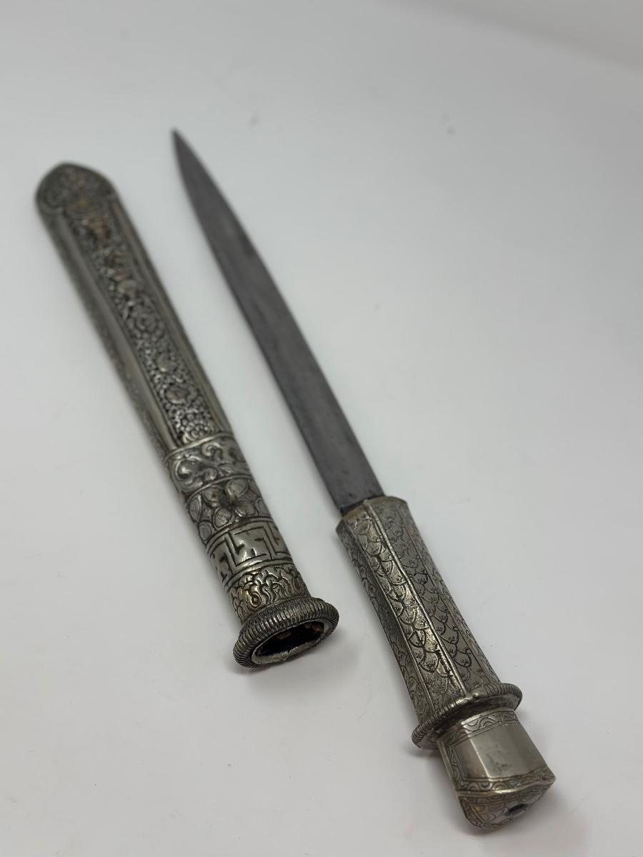 Antique 19th century intricately engraved dagger & scabbard of Tibetan or Bhutanese origin.
