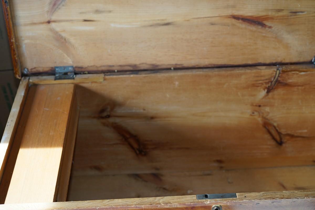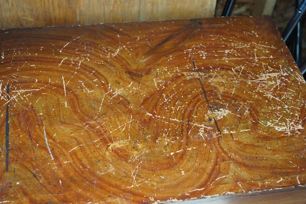 The chest is in good condition except for the top. The top needs refinishing. Don't let this deter you as the rest of the chest is very good. The top has many scratches and few" gouges" A nice sand and stain it would the top of nice. The body of the chest is good. Just a slight clean. The grain painting is charming and warm . Folk art of the 19th century.