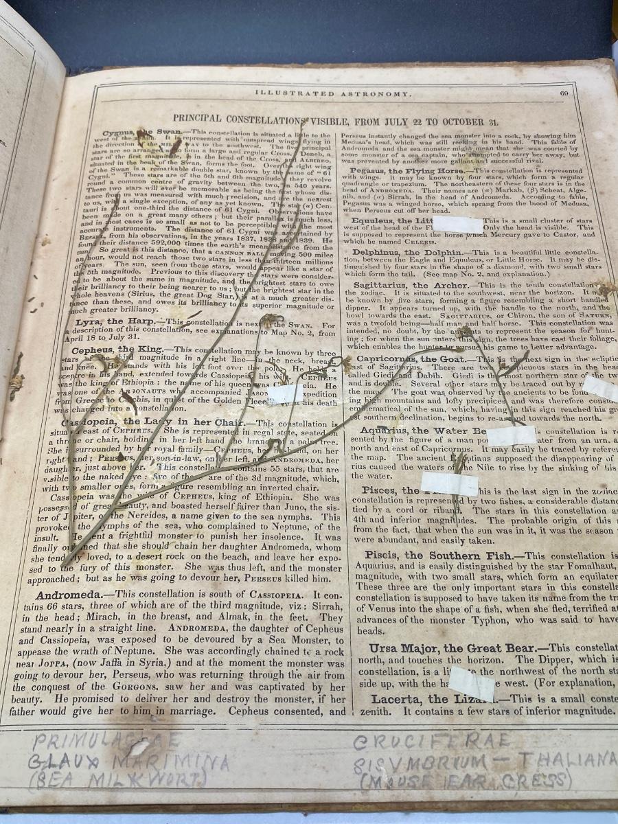 Antique 19th Century Collectible Astrological Book Smith's Illustrated Astronomy by Asa Smith, there is some wear to the cover and some pages, but there is overall no significant damage and is in good condition for its age. There are also collected specimens of plants from an unknown date, check pictures for more details and for sizing.