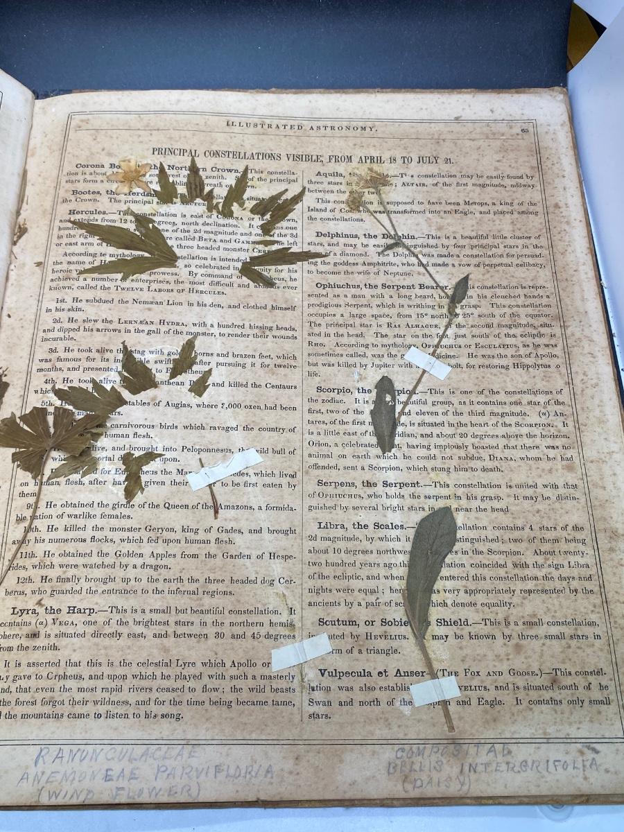 Antique 19th Century Collectible Astrological Book Smith's Illustrated Astronomy by Asa Smith, there is some wear to the cover and some pages, but there is overall no significant damage and is in good condition for its age. There are also collected specimens of plants from an unknown date, check pictures for more details and for sizing.