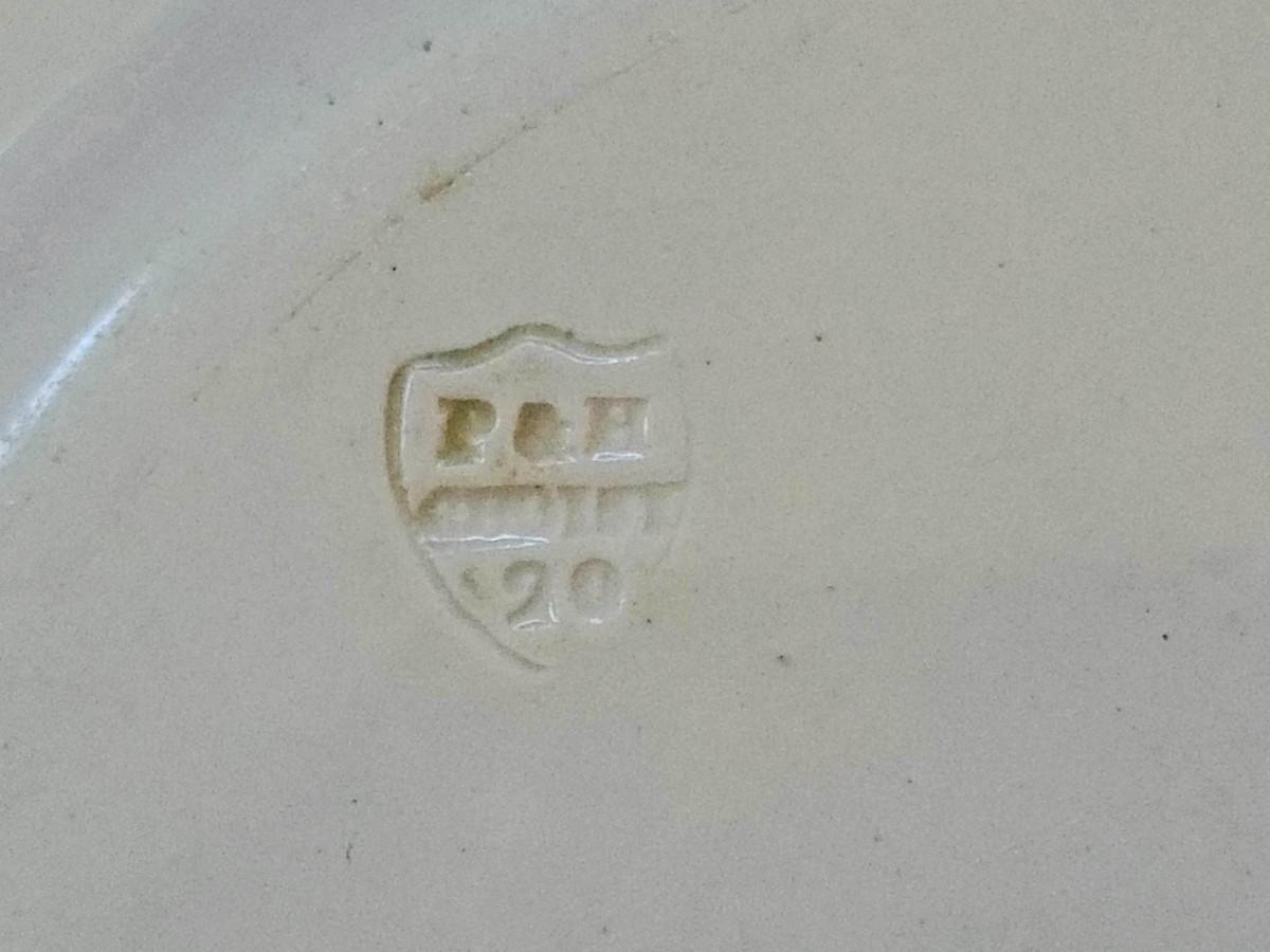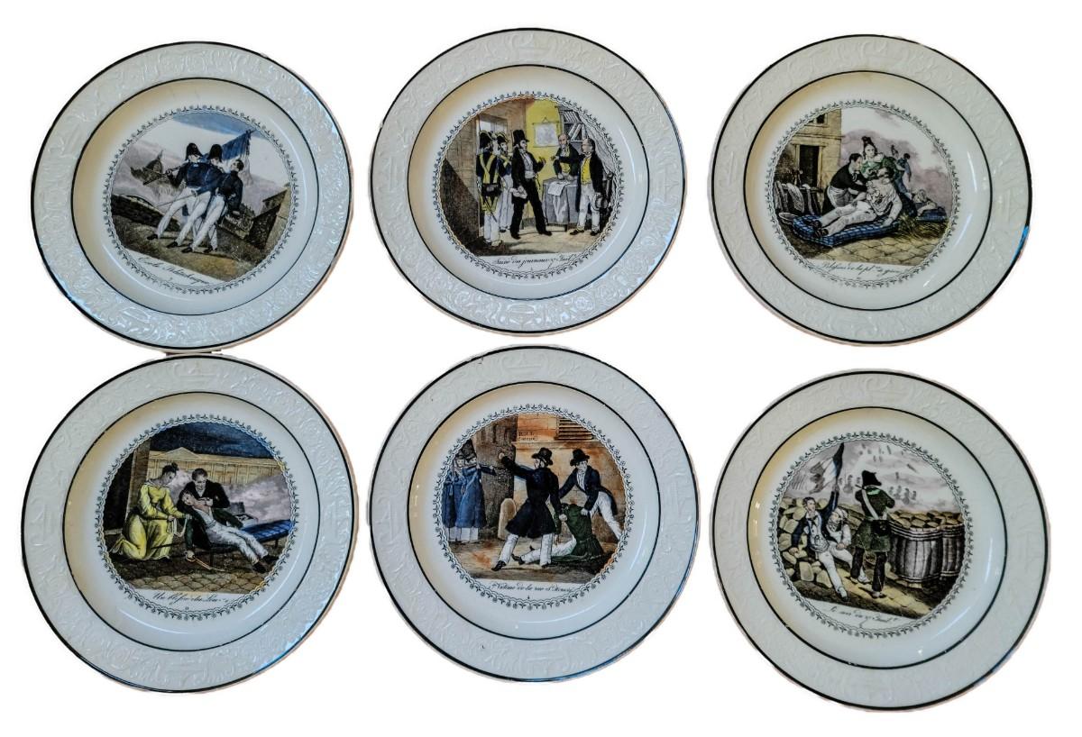 The picture shows 6 plates as stated, only 5 are in fine conditions. The 6th one is free since it has a chip. Lot of 5 plates in VG conditions, each measures 8 1/2" diameter, hand colored, incised brand. As a bonus, a 6th plate with a small chip.