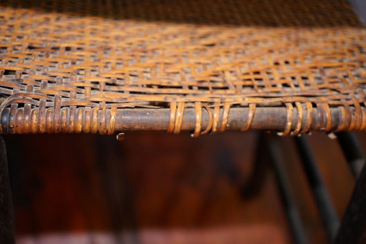 the seat is of a hand rattan/caning. Worn along the edge but intact.