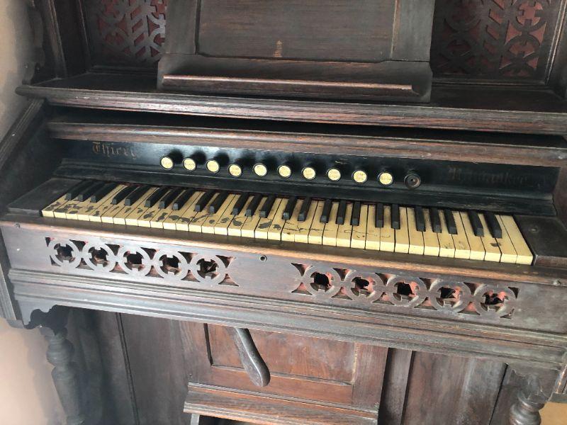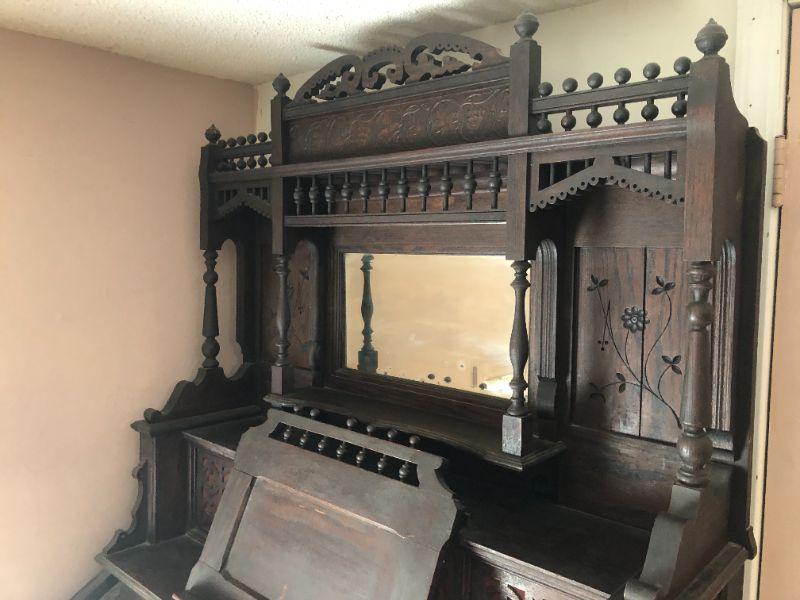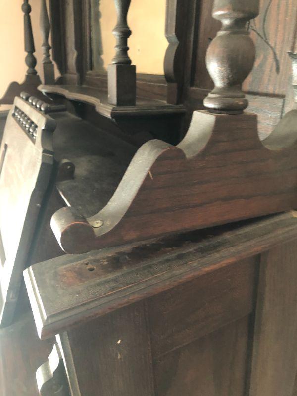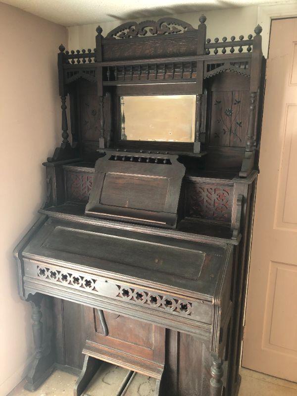 No reserve on this great old organ. While it does not work, this piece actually offers many uses for repurposing and taking accent pieces from. The top is completely detachable and could be used on other furniture to compliment it.