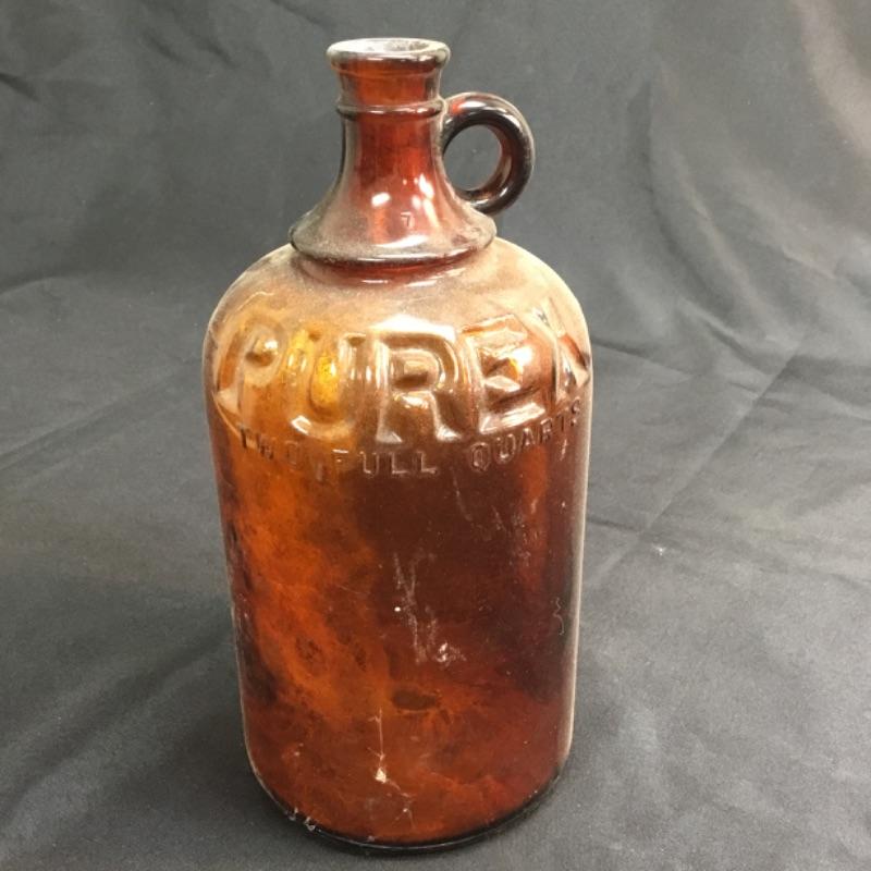 One antique Purex bottle. Bottle is dirty and has some clouding; see pictures bottle stands approximately 10.5“ high.