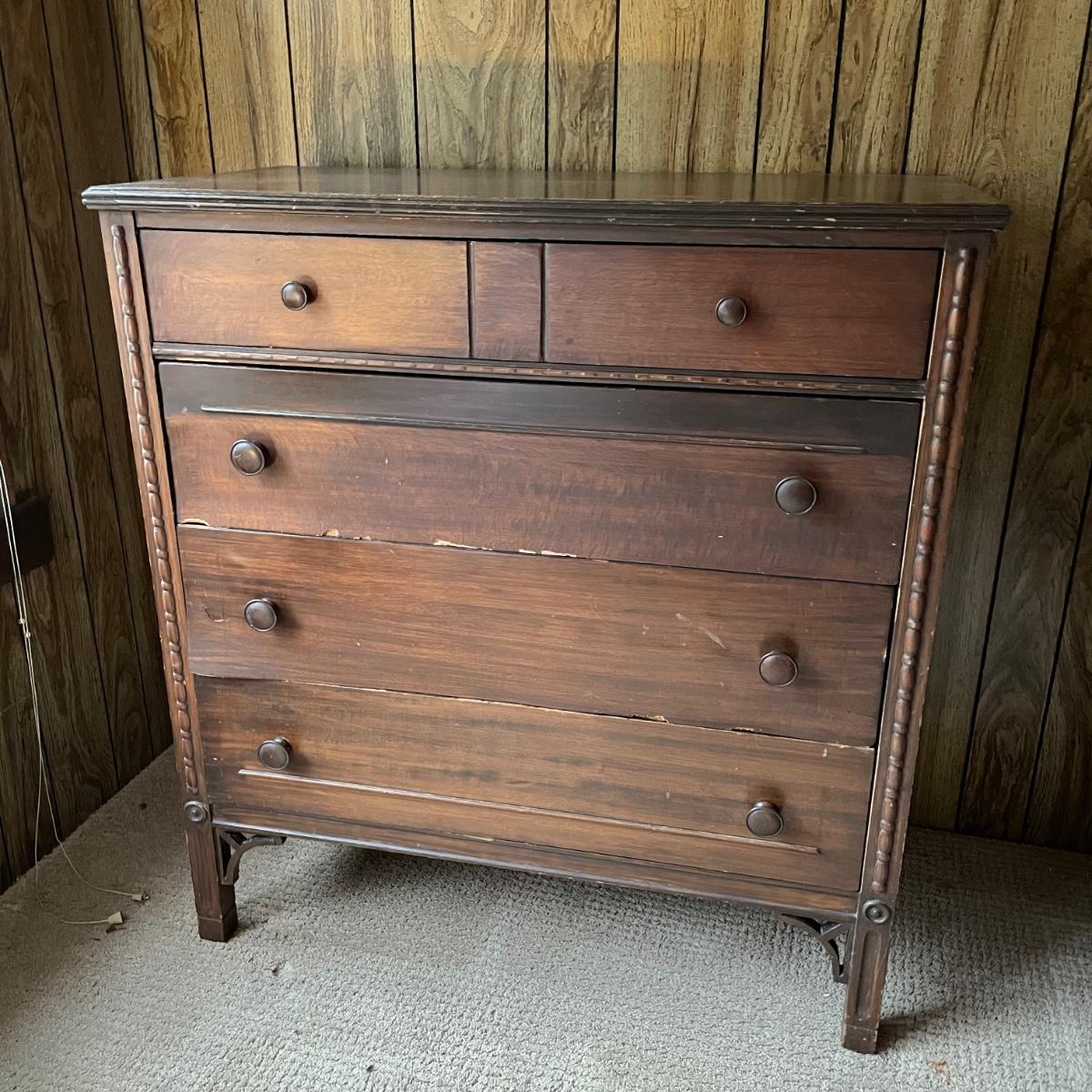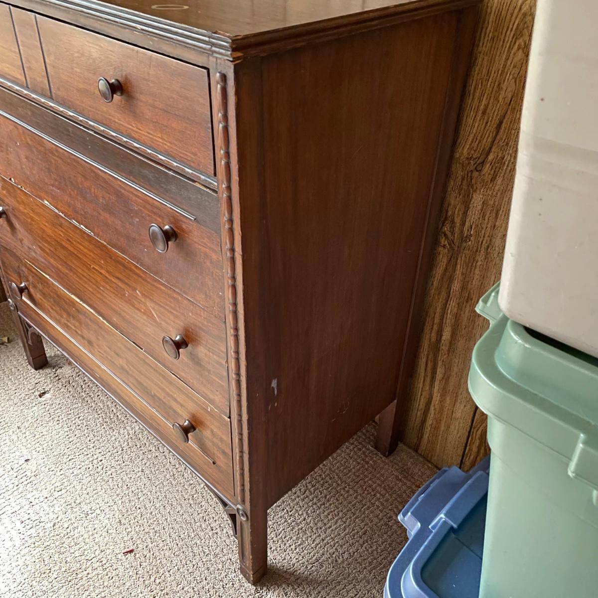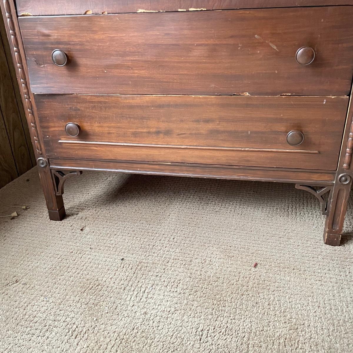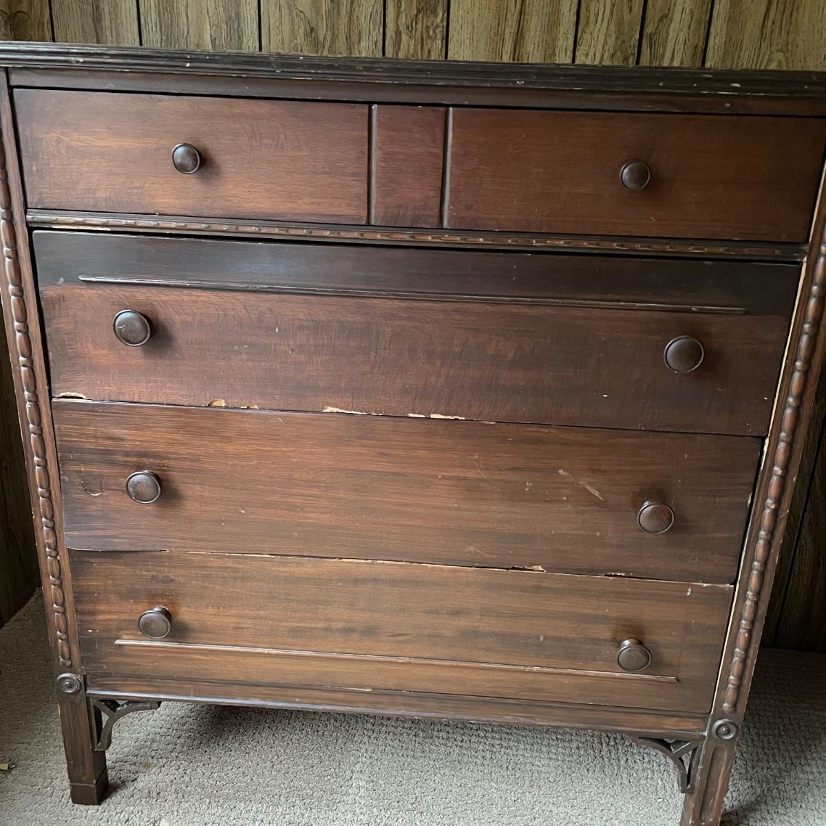 Piece two of three in this bedroom suite. This antique dresser has four dovetail drawers and nice carved embellishments. Each drawer has two wooden pulls. The third drawer down has its veneer pulling away from the drawer front. The second and third drawers both have some significant blemishes, but the overall charm of the piece is strong. This dresser is sturdy and measures 38” x 20” x 41.5”. See images. Bring help to load, local pick up only.